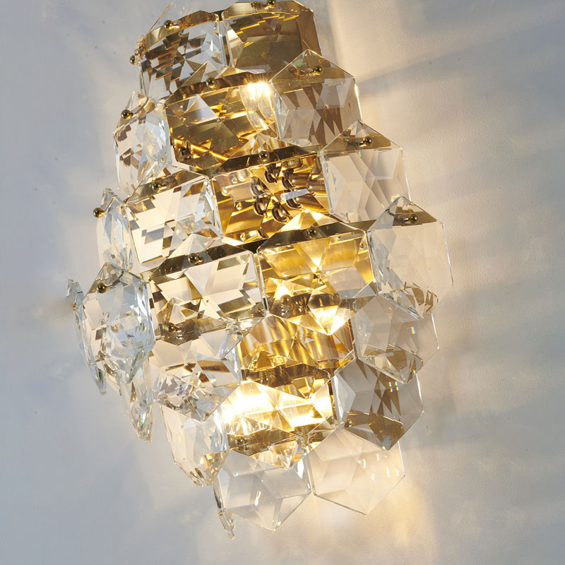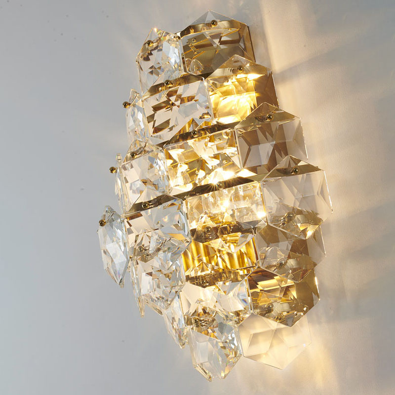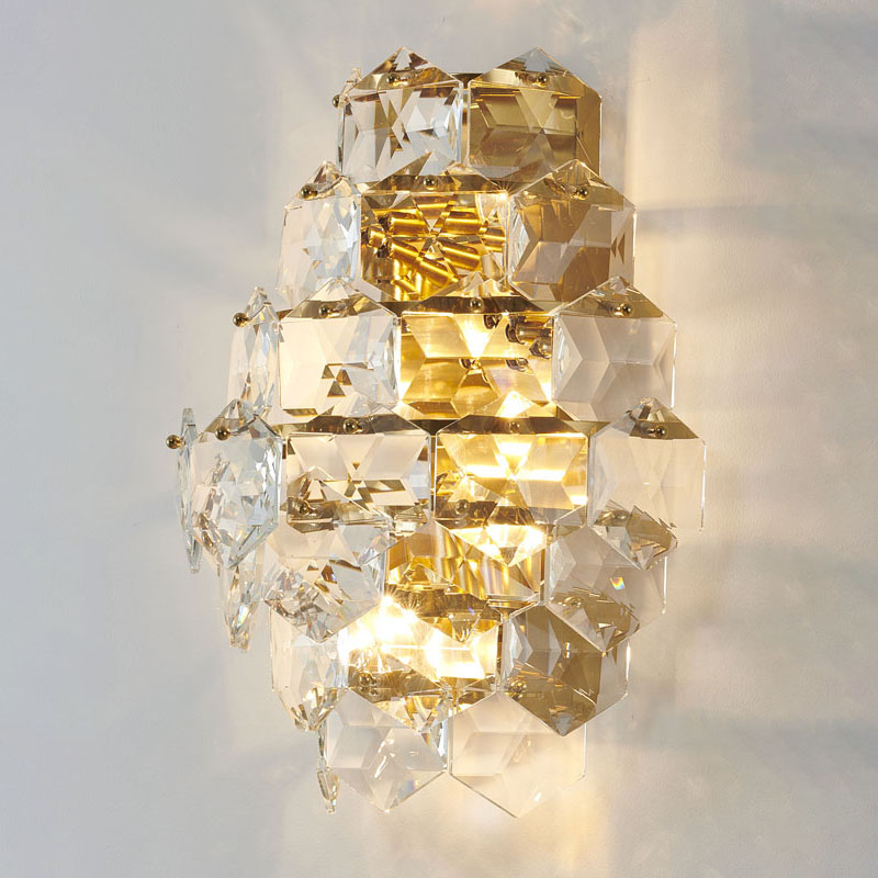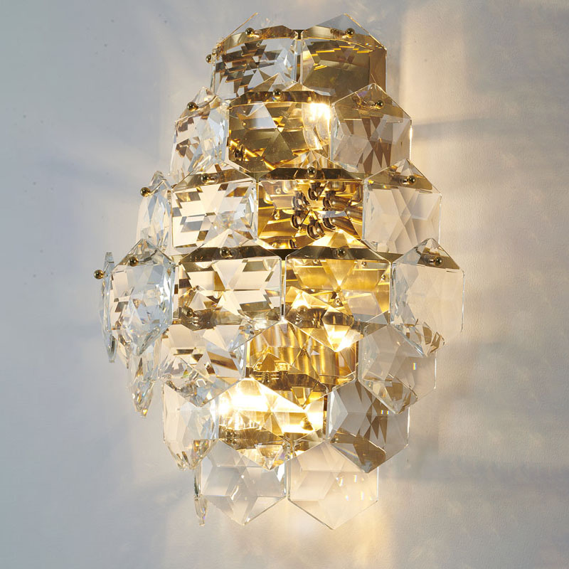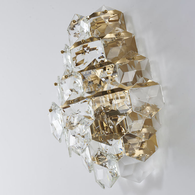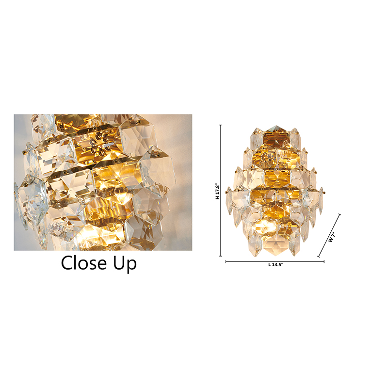 A SEVEN TIER GOLD STAINLESS STEEL FRAME WALL SCONCE WITH CLEAR HANGING CRYSTALS