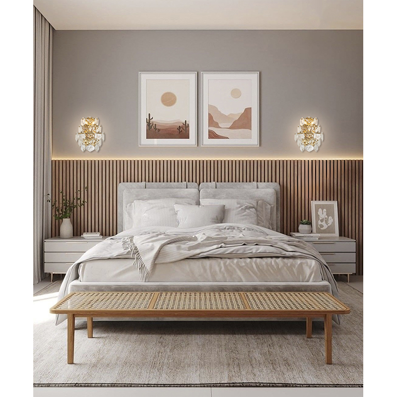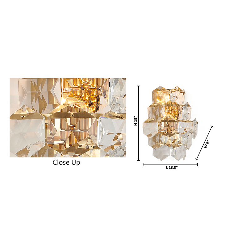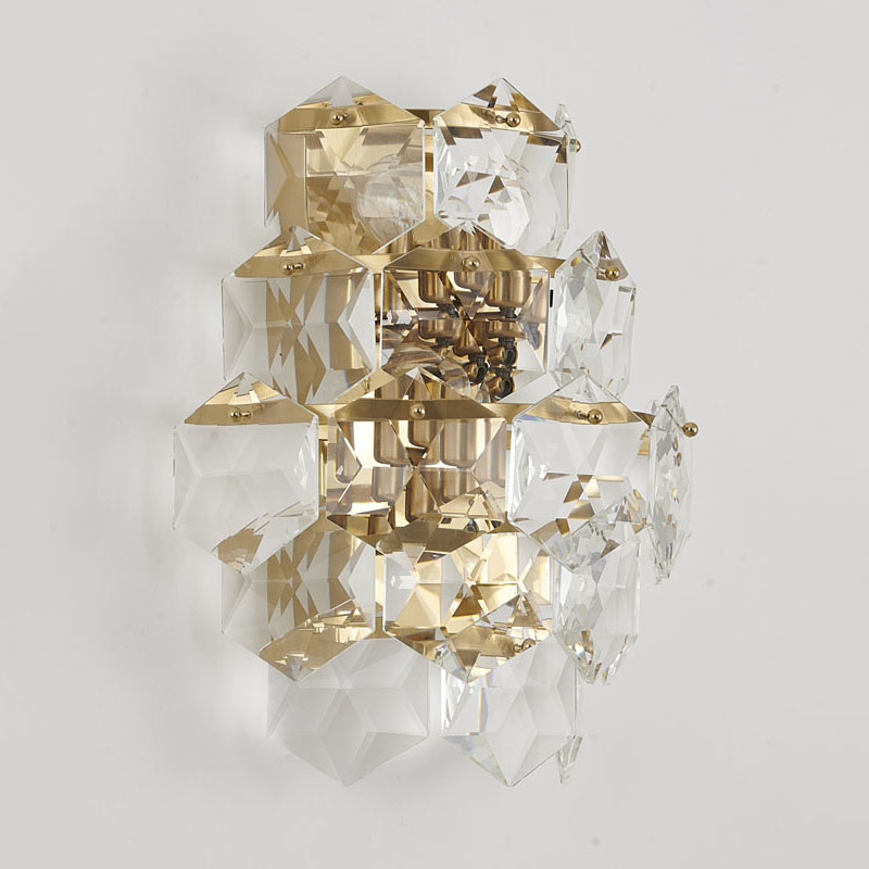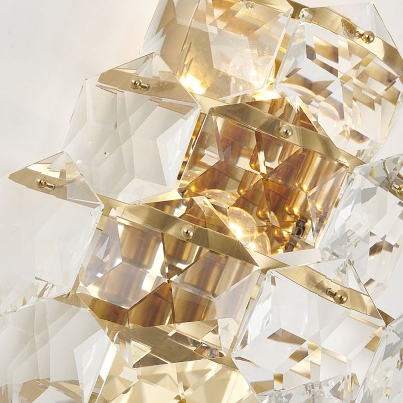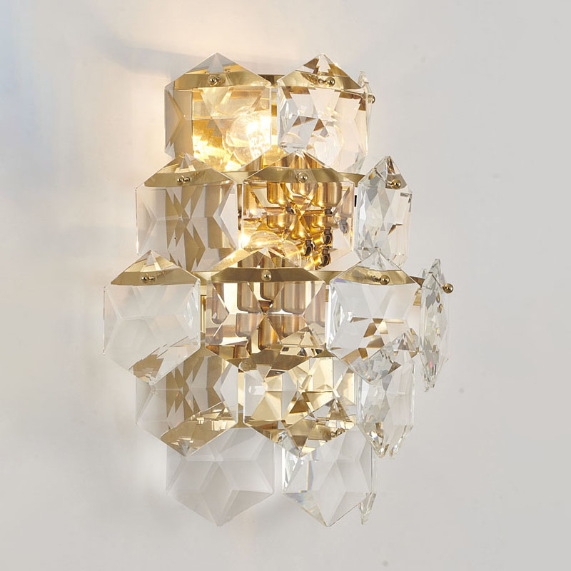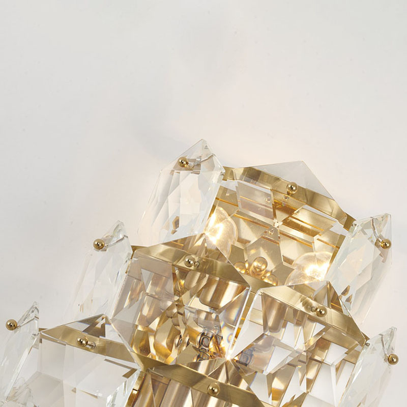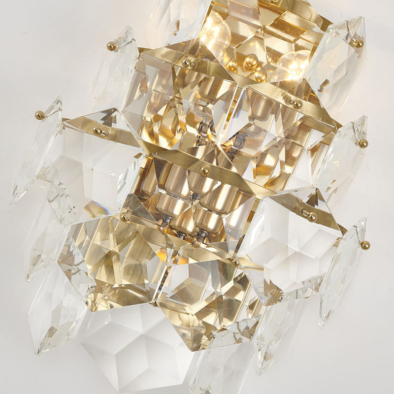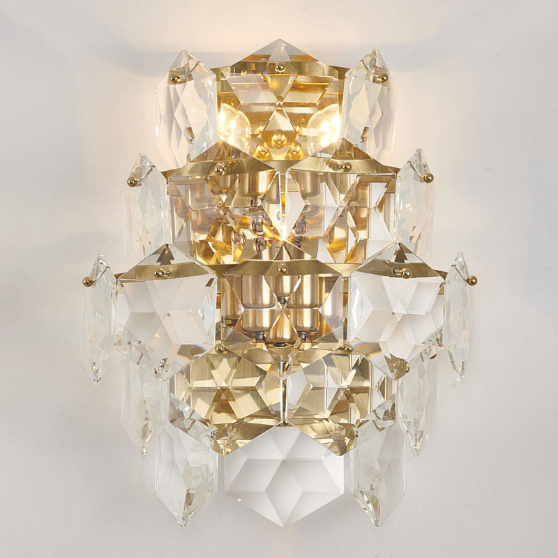 A FIVE TIER GOLD STAINLESS STEEL FRAME WALL SCONCE WITH CLEAR HANGING CRYSTALS
