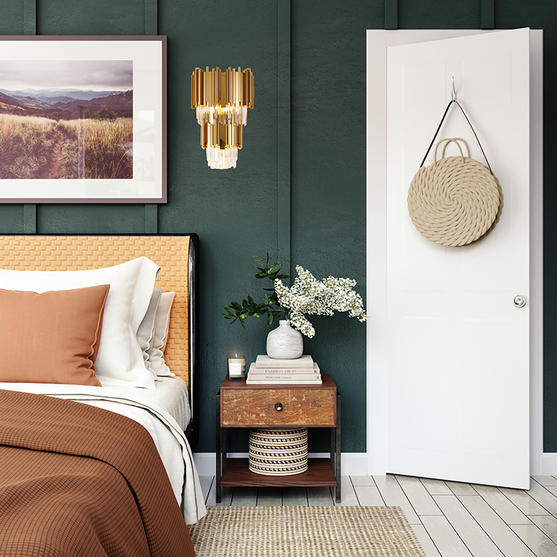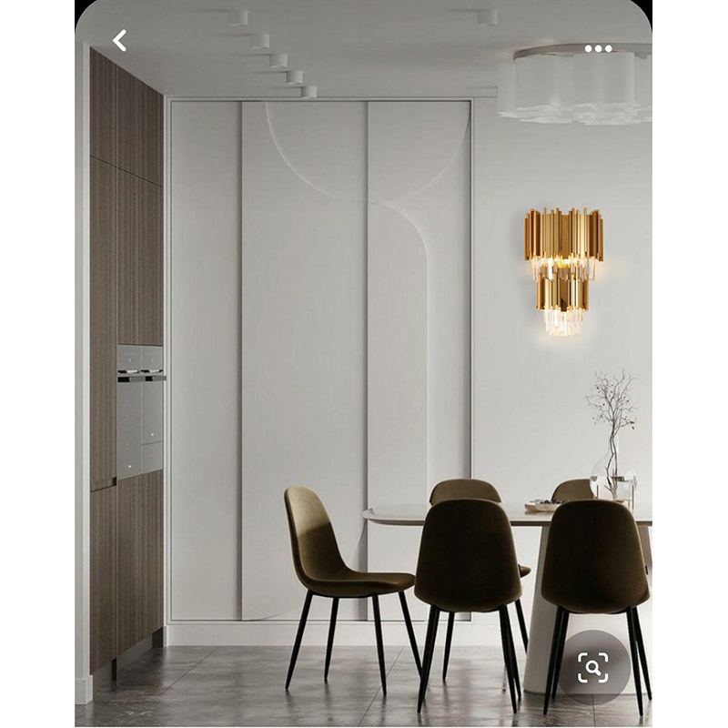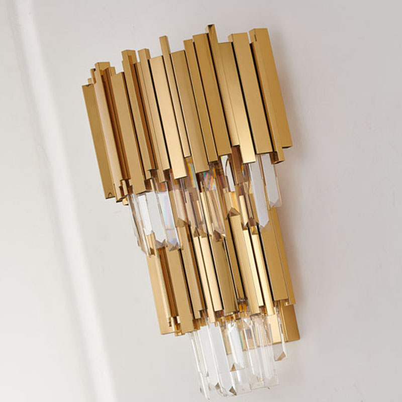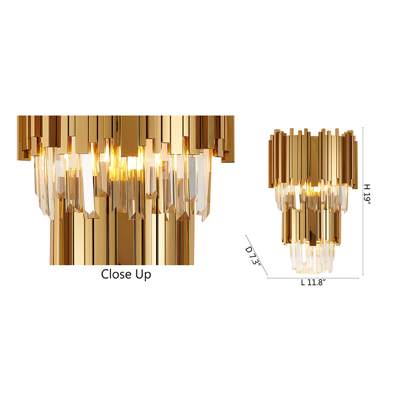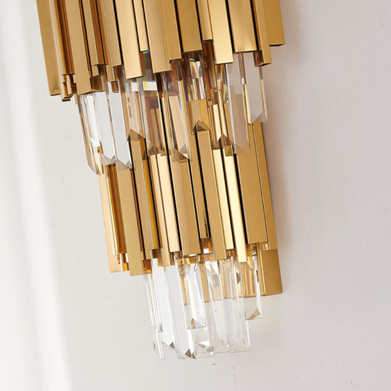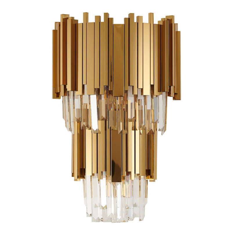 A TWO TIER SHINY GOLD WALL SCONCE WITH CLEAR HANGING CRYSTALS