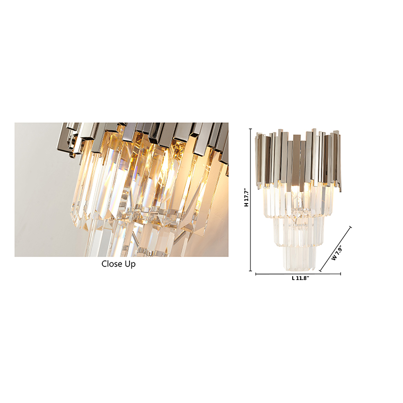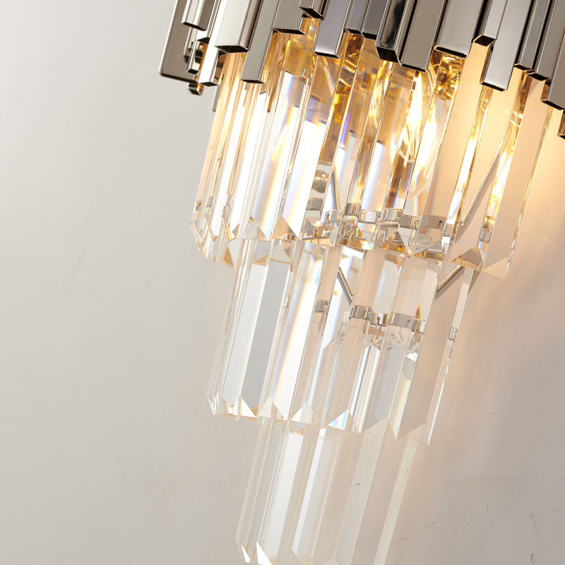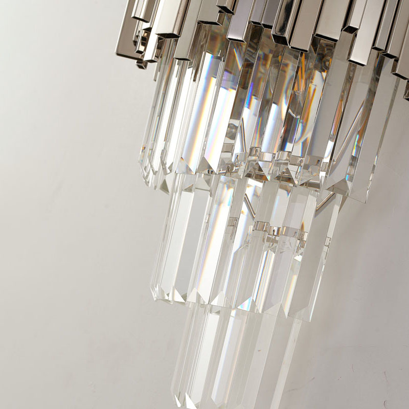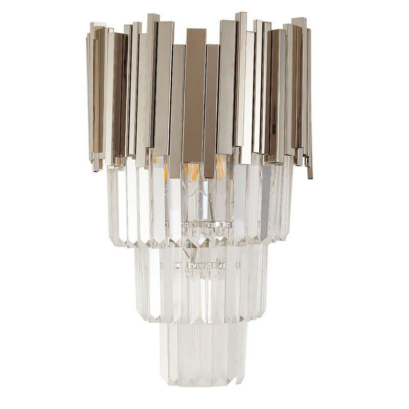 A CHROME FRAMED WALL SCONCE WITH THREE TIERS OF HANGING CLEAR CRYSTALS