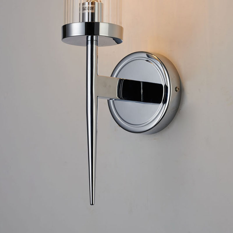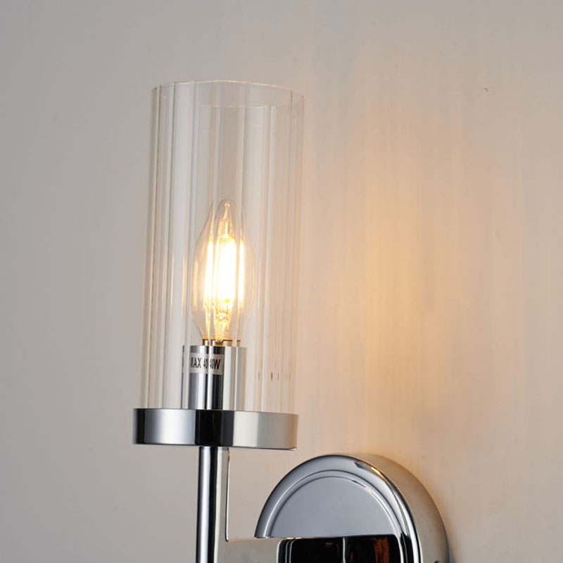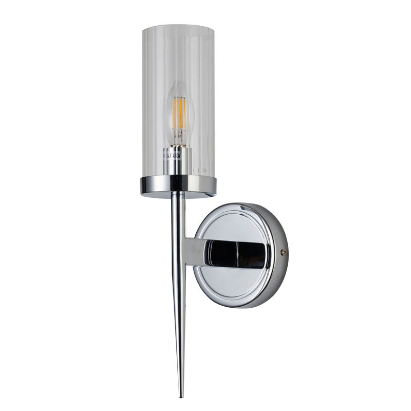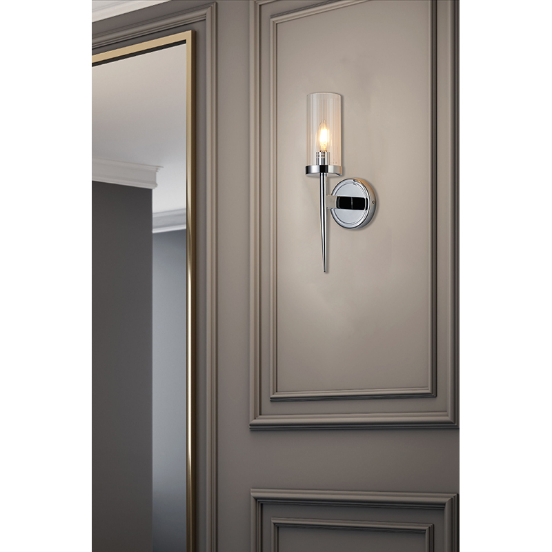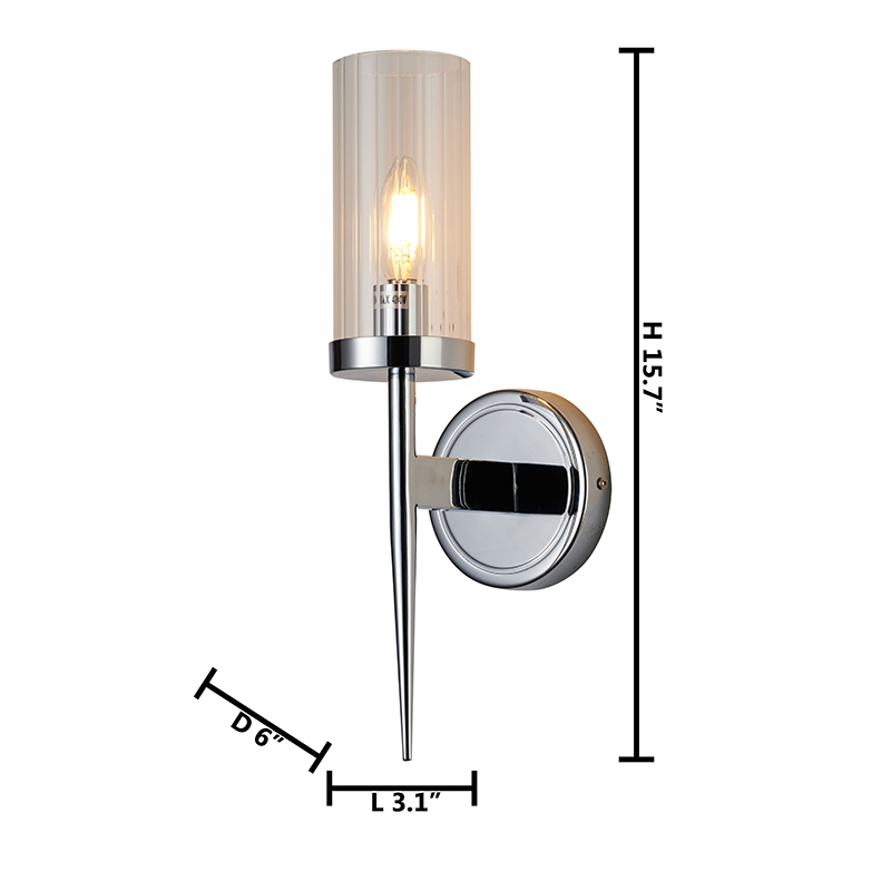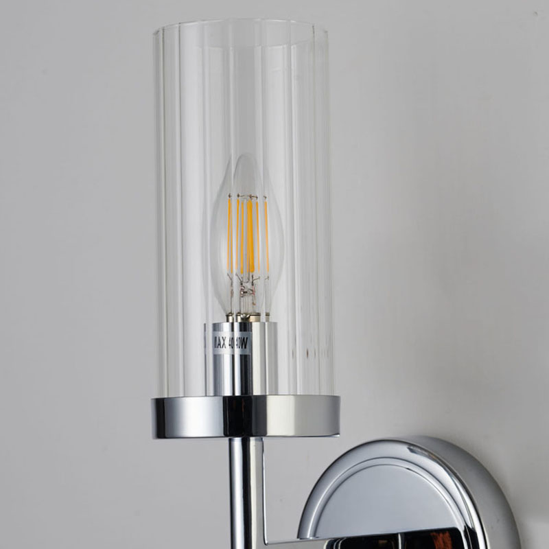 A CHROME FRAME WITH CLEAR GLASS CYLINDER SHADE WALL SCONCE