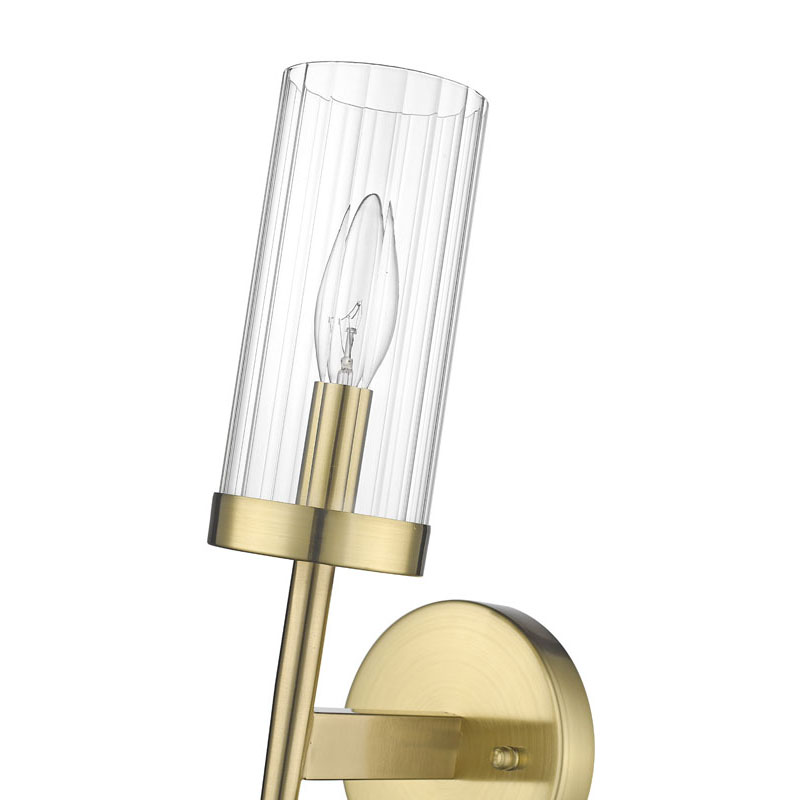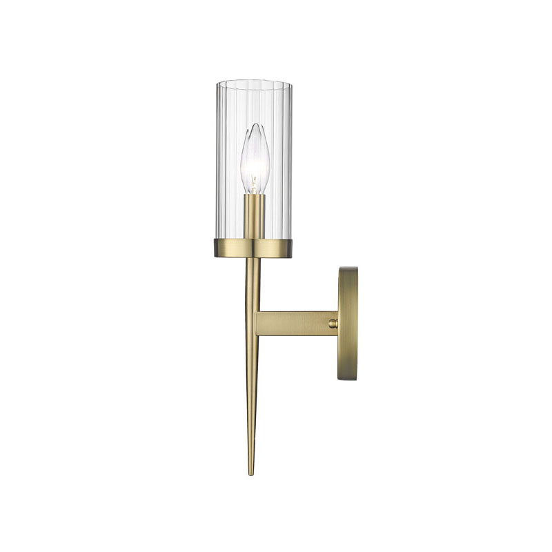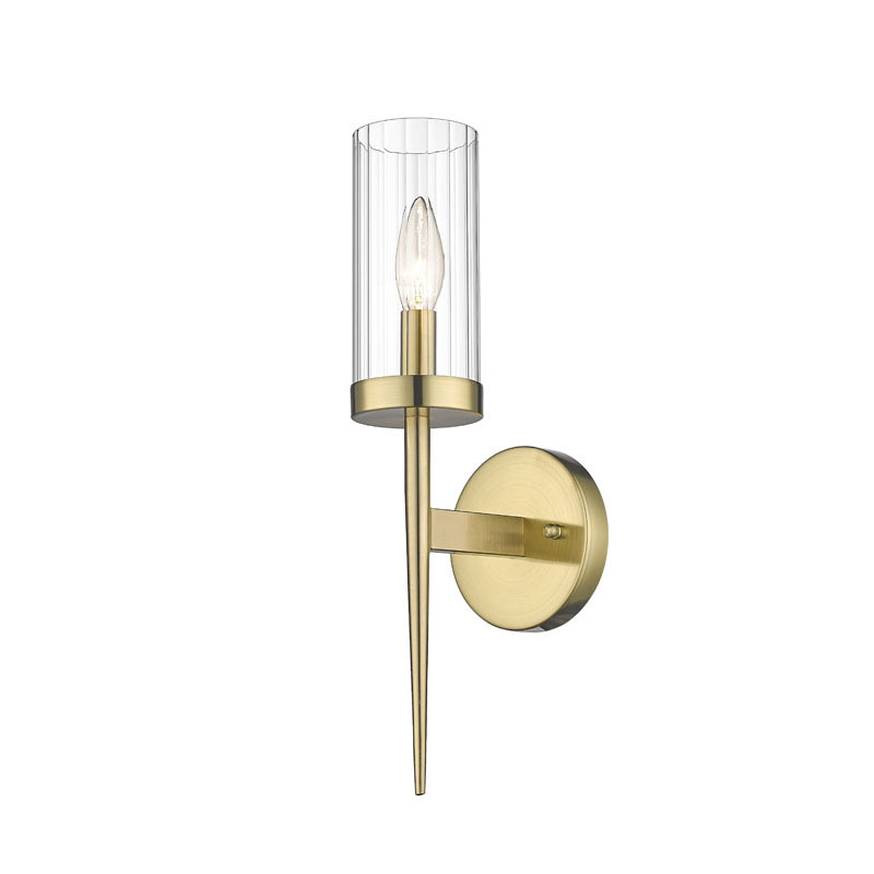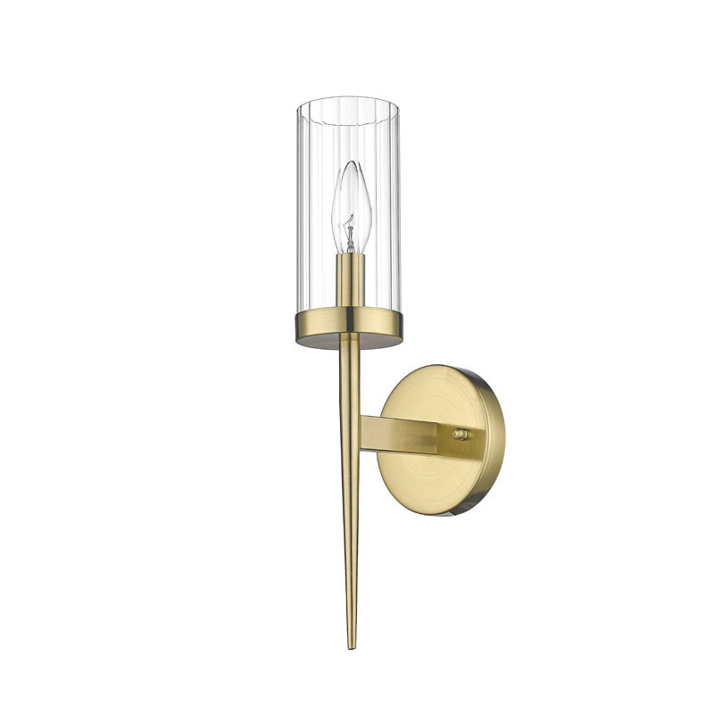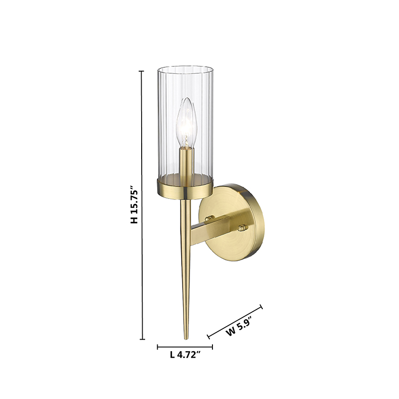 A GOLD FRAME WALL SCONCE WITH A CLEAR GLASS SHADE