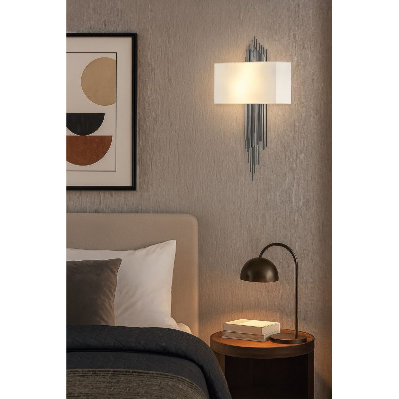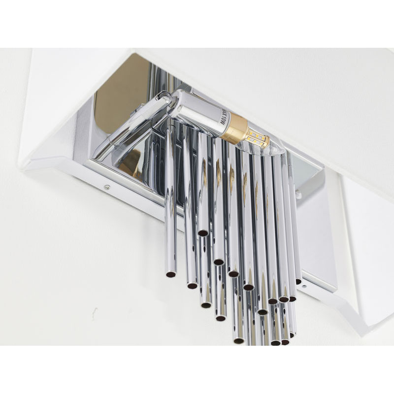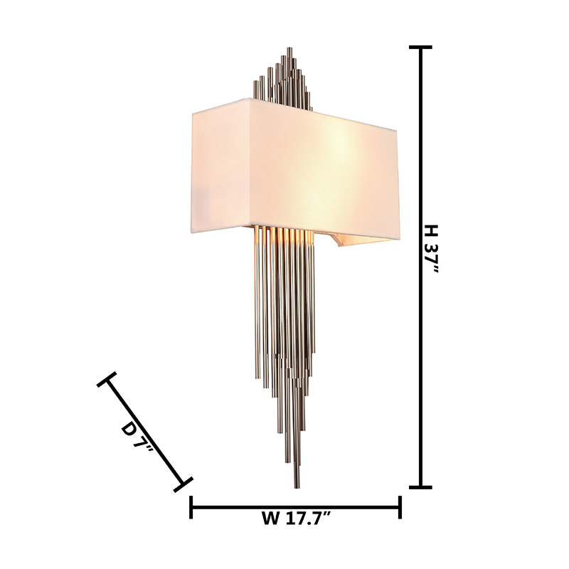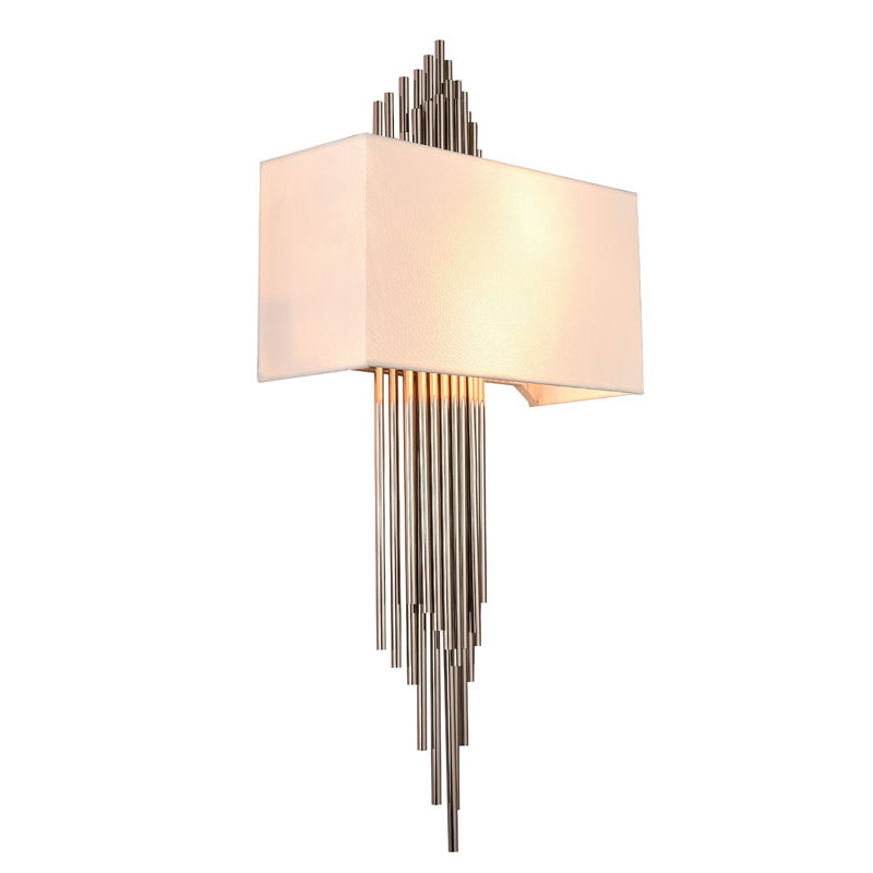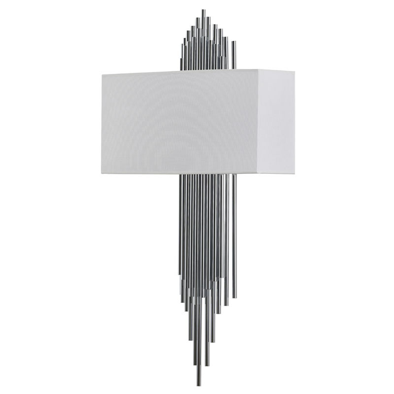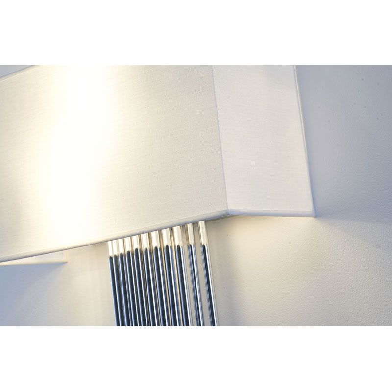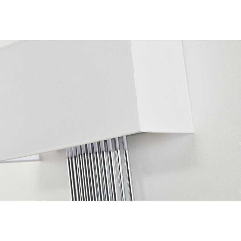 A CHROME ROD WALL SCONCE WITH A WHITE FABRIC SHADE
