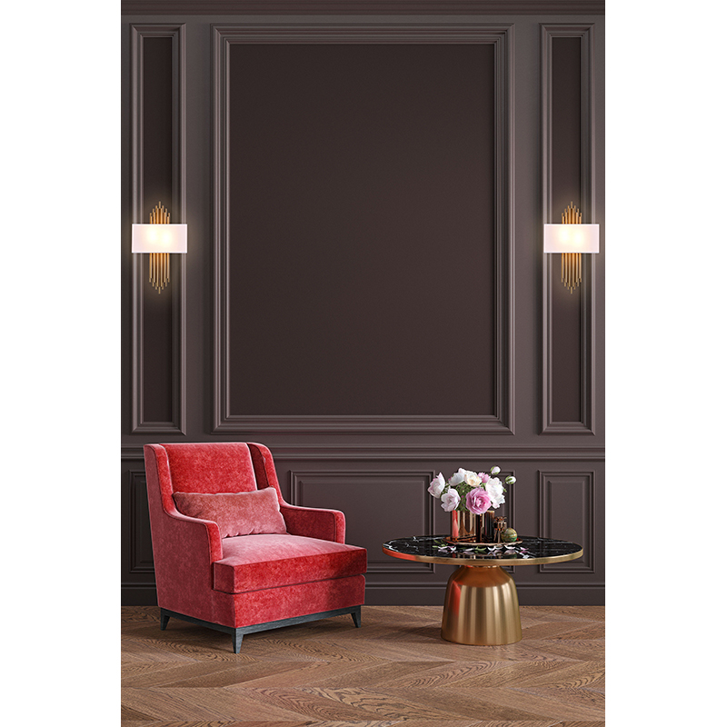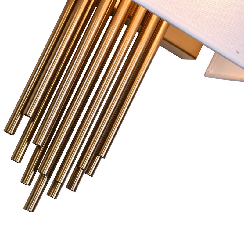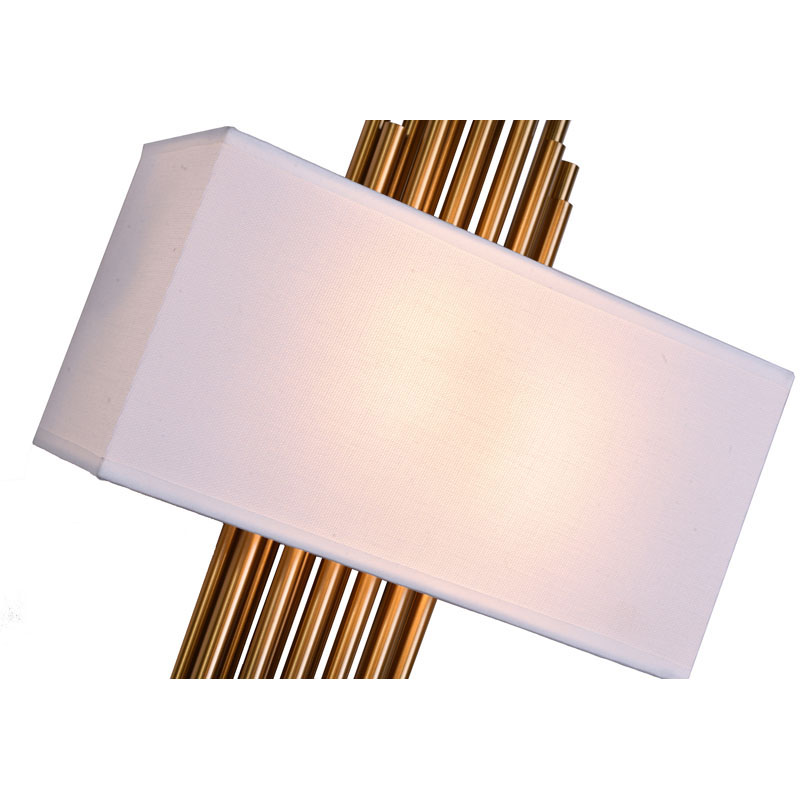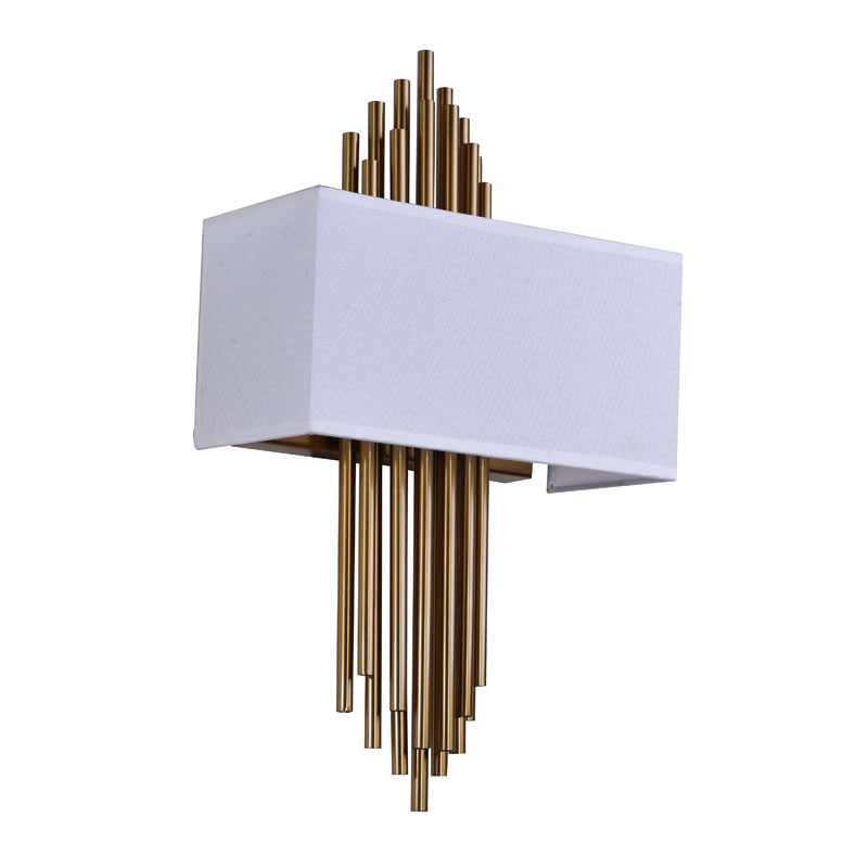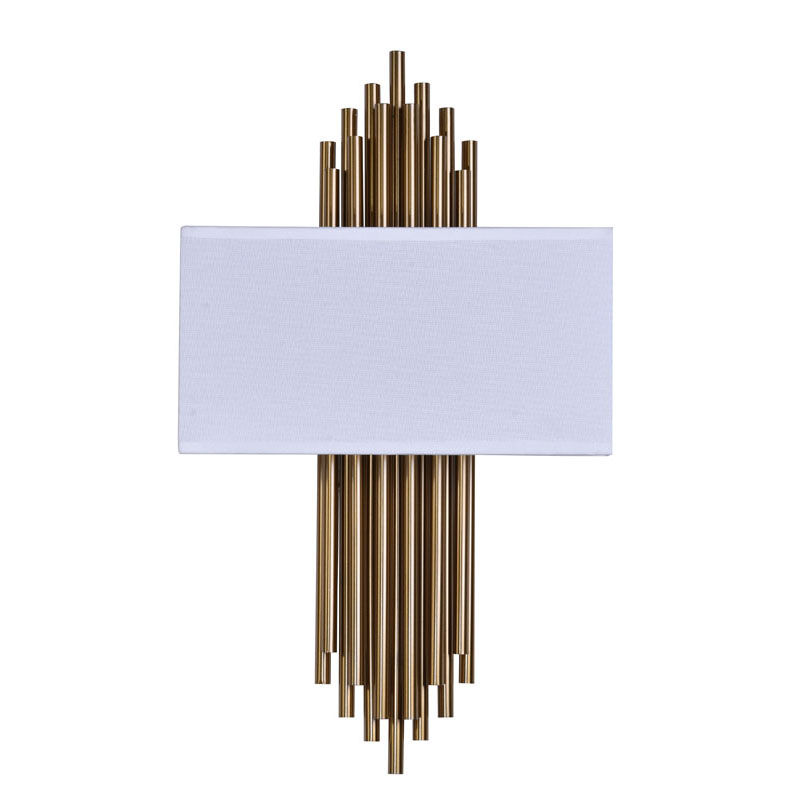 A GOLD HAIRLINE FRAME WALL SCONCE WITH A WHITE BOX SHADE
