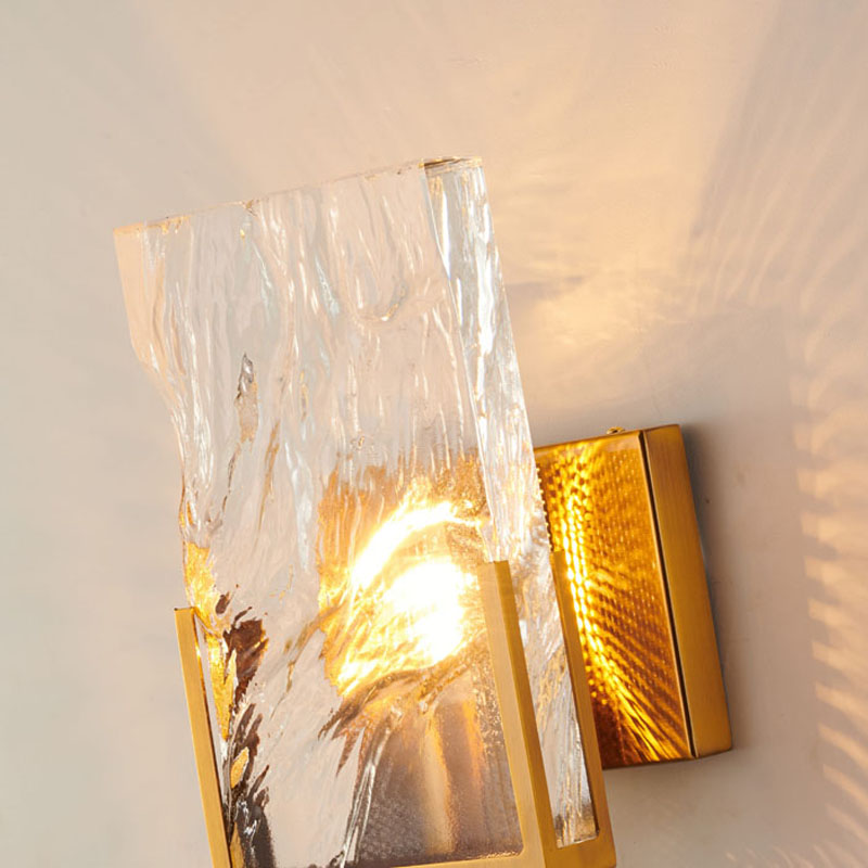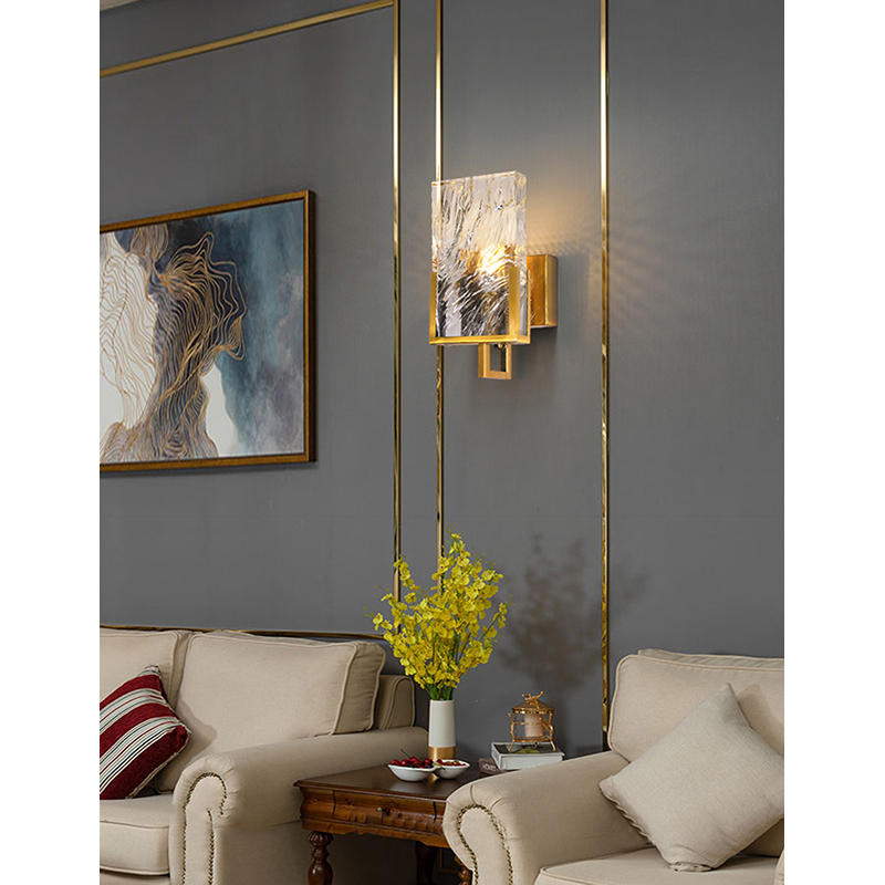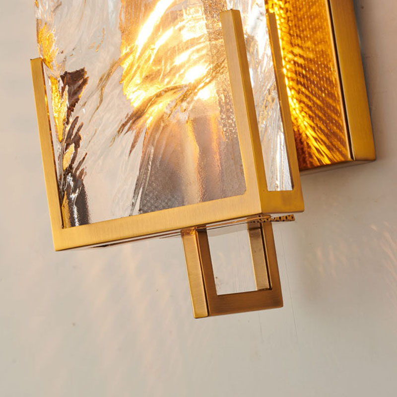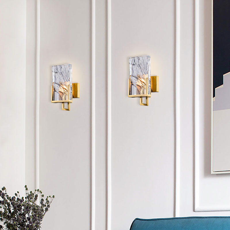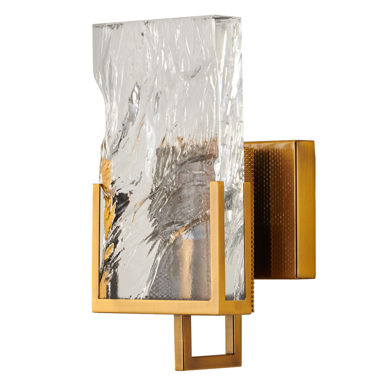 A GOLD STAINLESS STEEL FRAME WALL SCONCE WITH A CLEAR CRYSTAL PLAQUE