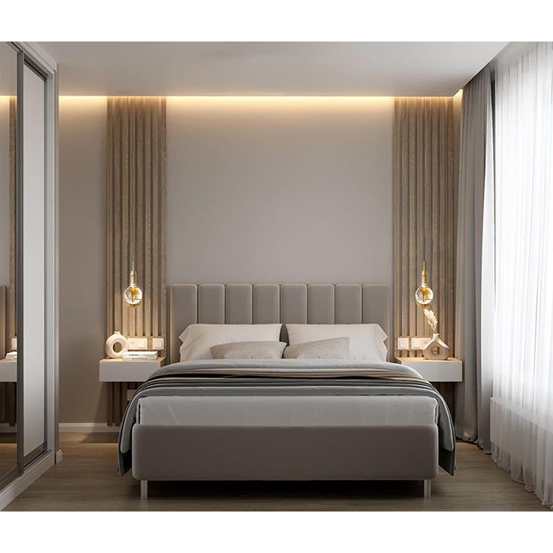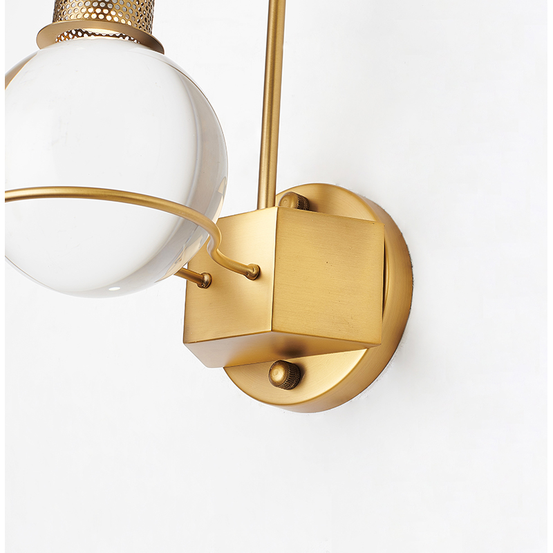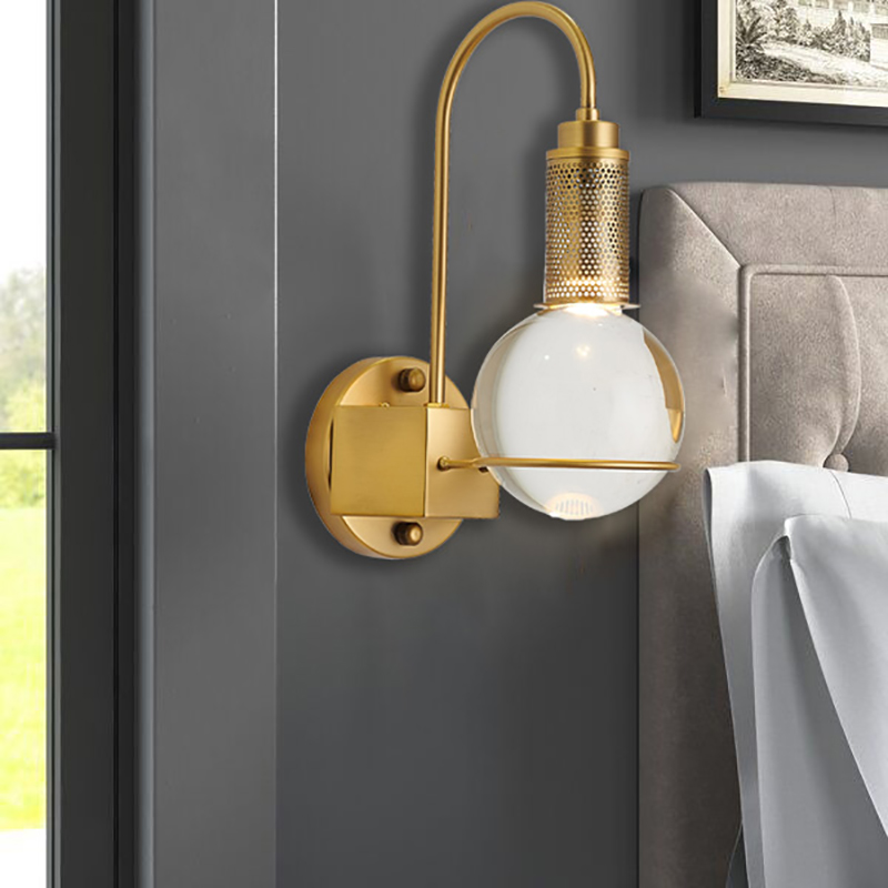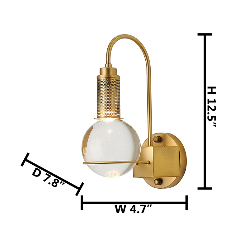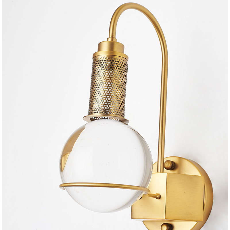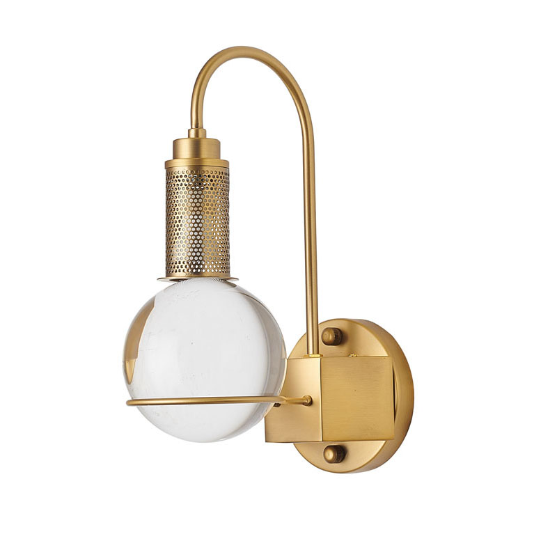 AN ANTIQUE BRASS ARCHED ARM WALL SCONCE WITH A CLEAR CRYSTAL BALL