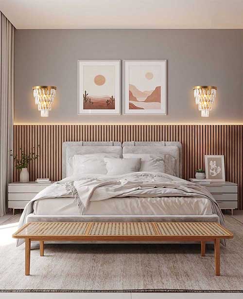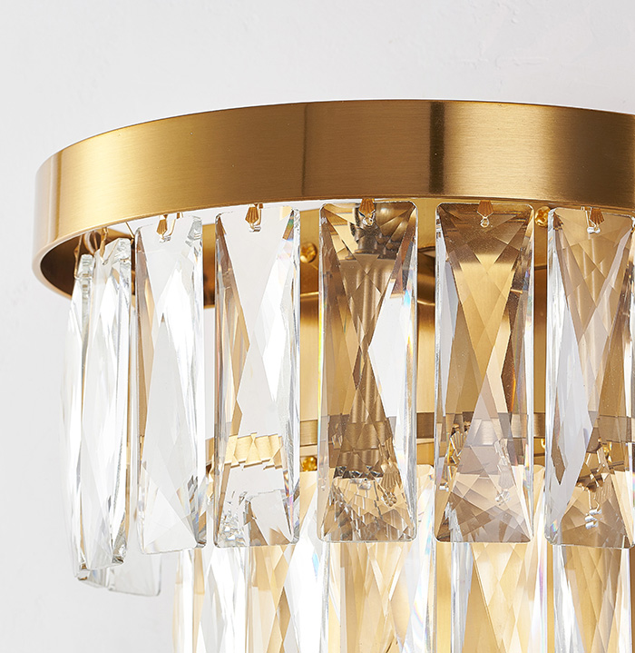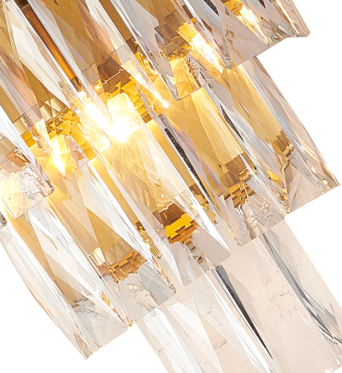 A FOUR TIER SATIN BRASS WALL SCONCE WITH CLEAR HANGING CRYSTALS