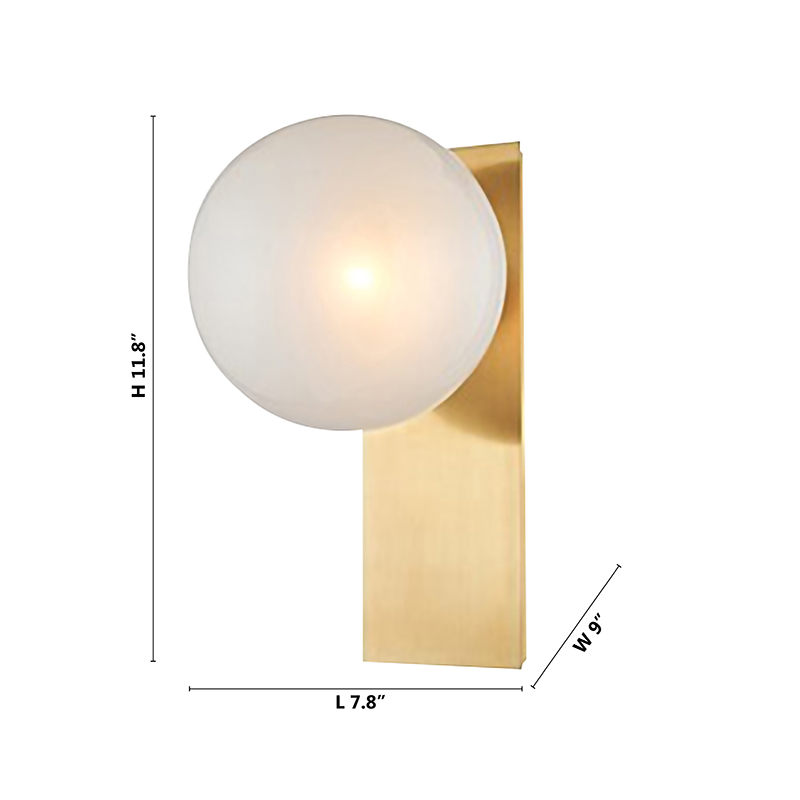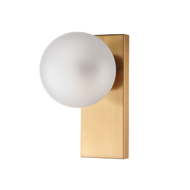 A GOLD STAINLESS STEEL FRAME WITH A WHITE GLASS BALL SHADE WALL SCONCE
