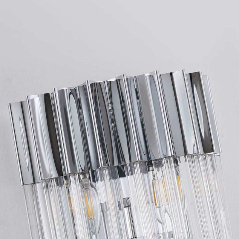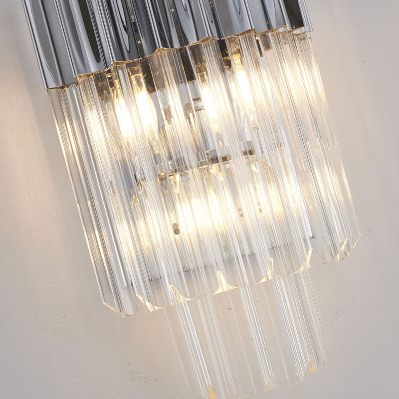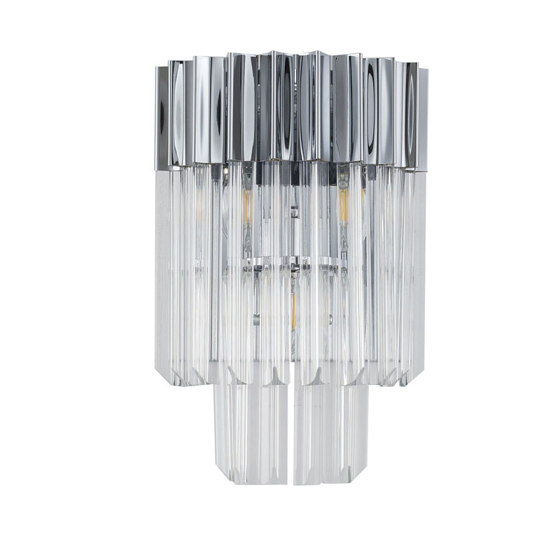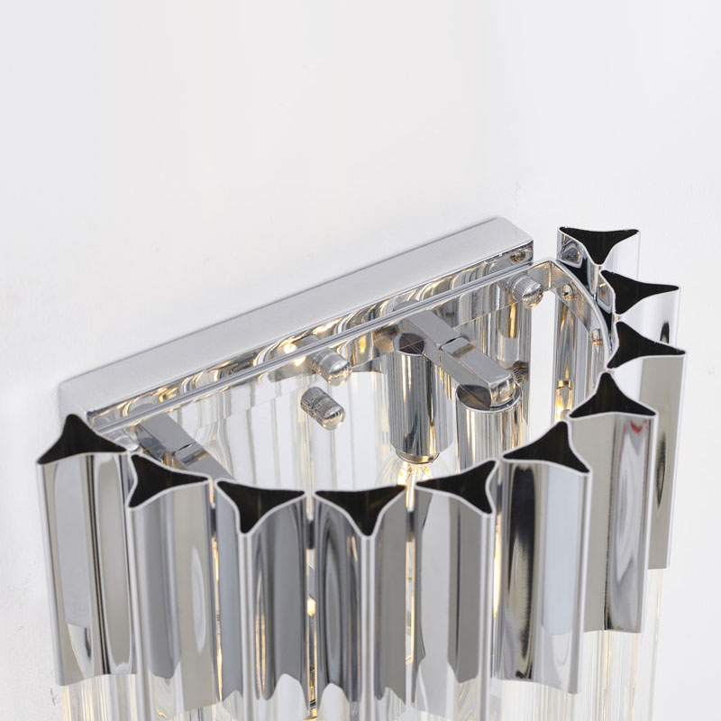A CHROME STAINLESS STEEL FRAME WALL SCONCE WITH CLEAR HANGING CRYSTALS