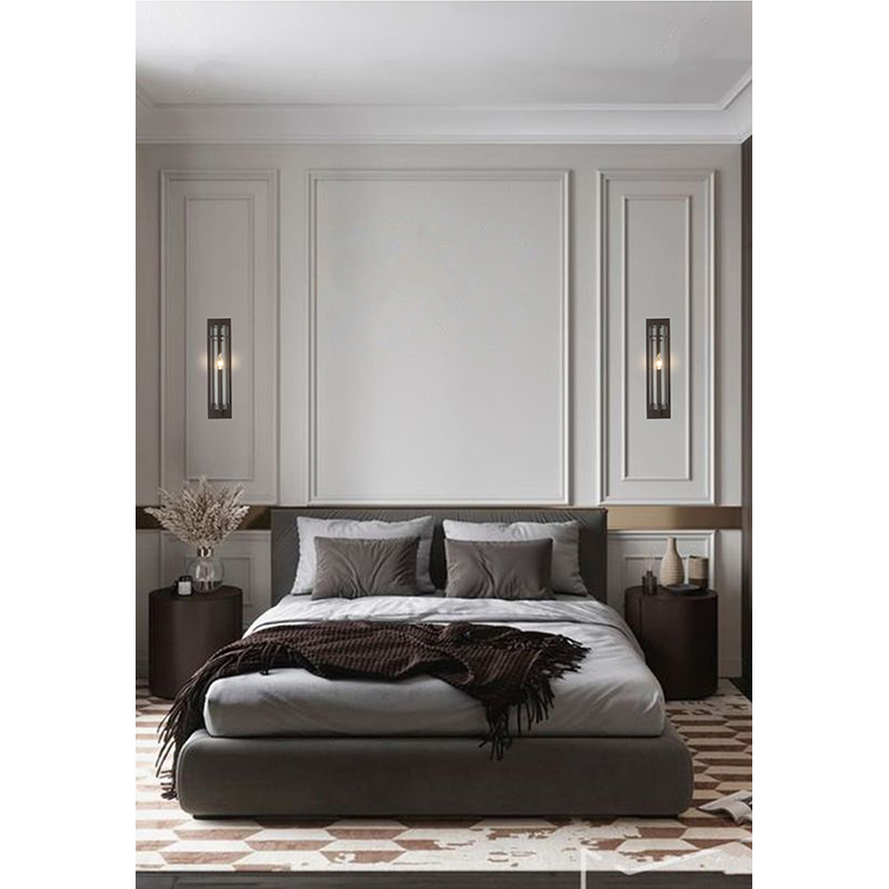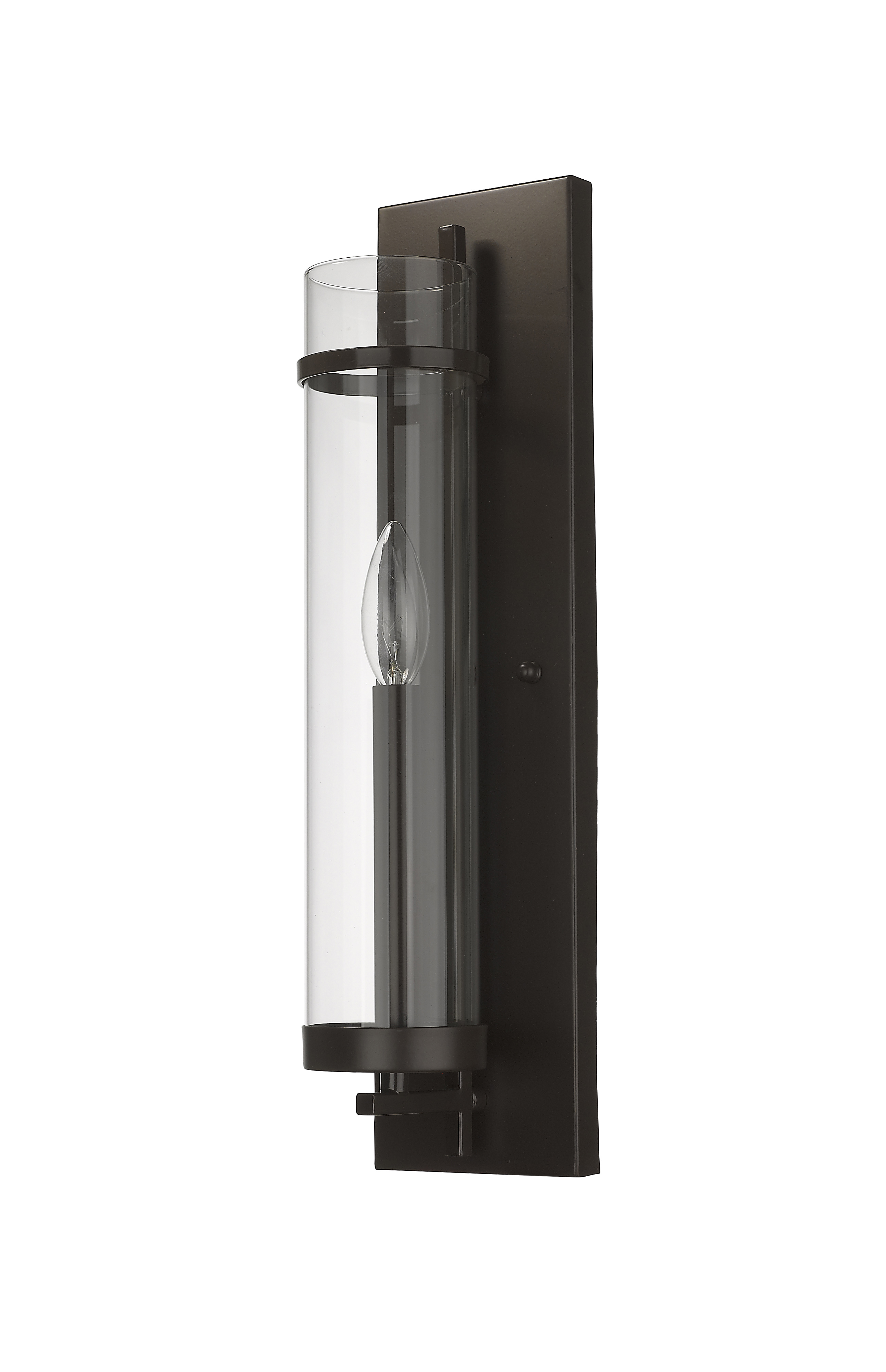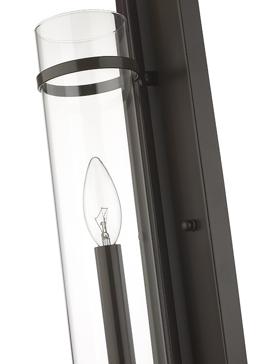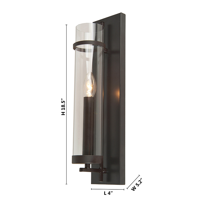 A DARK BROWN FRAME WALL SCONCE WITH A CLEAR GLASS CYLINDER SHADE