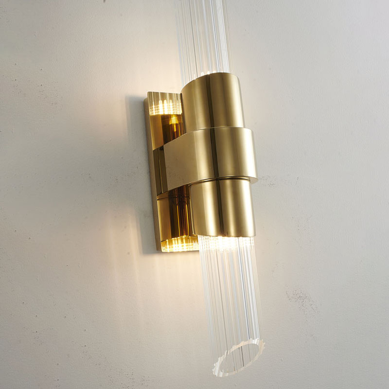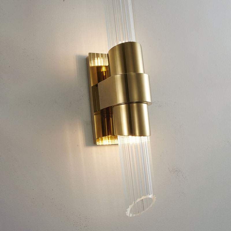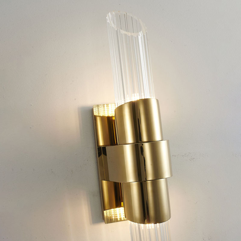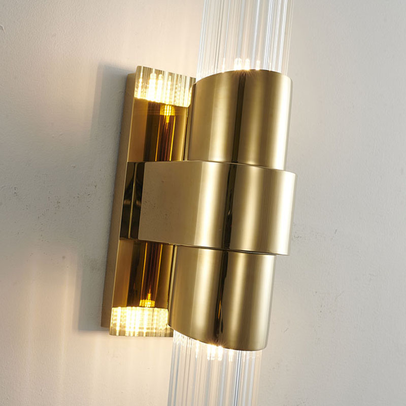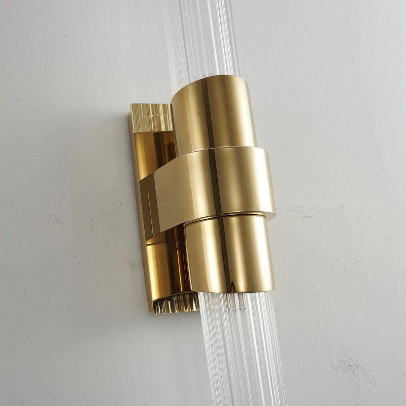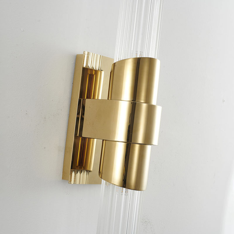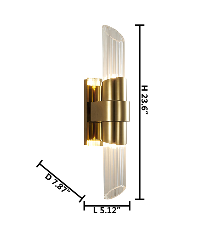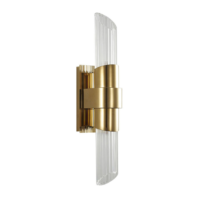 A GOLD STAINLESS STEEL FRAME WALL SCONCE WITH CLEAR RIBBED GLASS SHADES