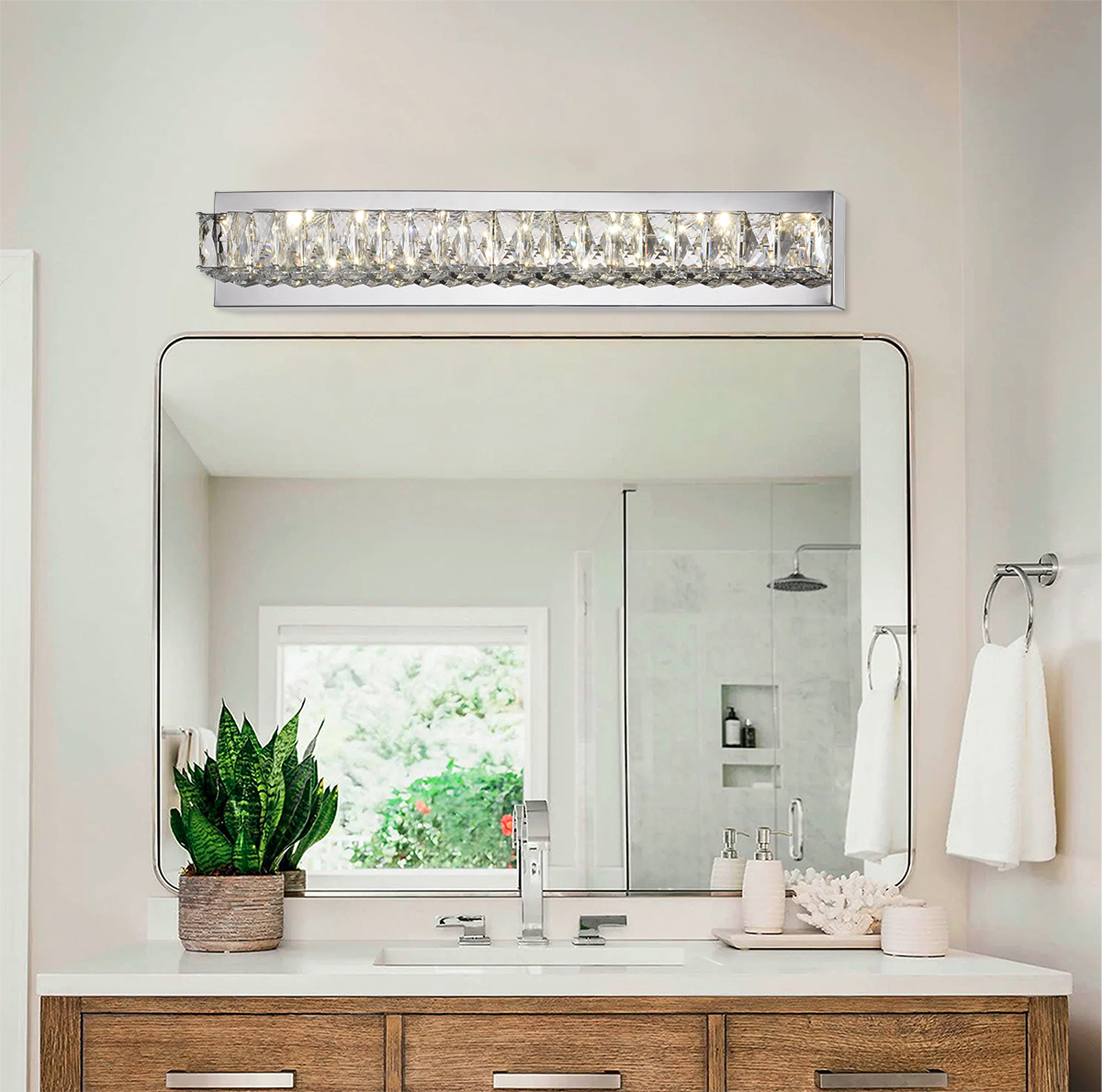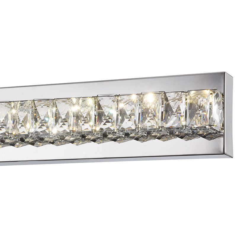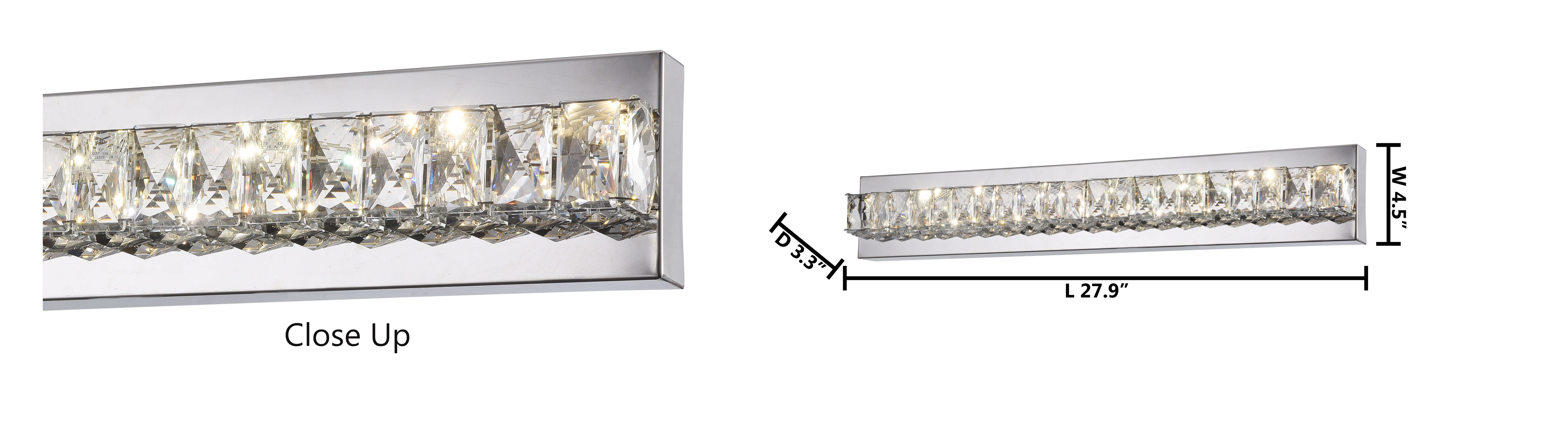 A CLEAR CRYSTAL BAR LED WALL SCONCE WITH A STAINLESS STEEL CHROME FRAME