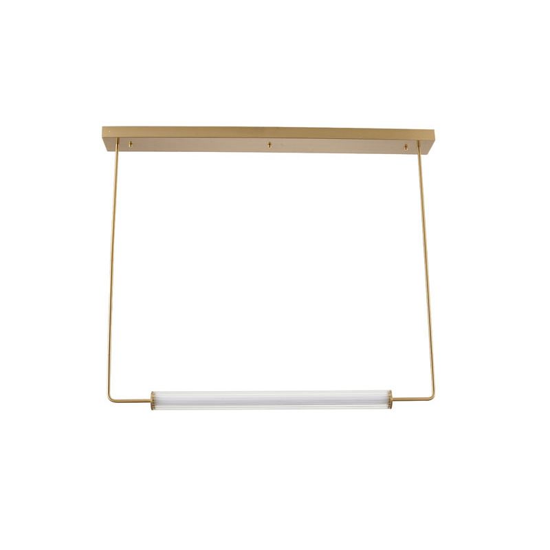 A BRASS FRAME LED CHANDELIER WITH A CLEAR & WHITE GLASS CYLINDER SHADE