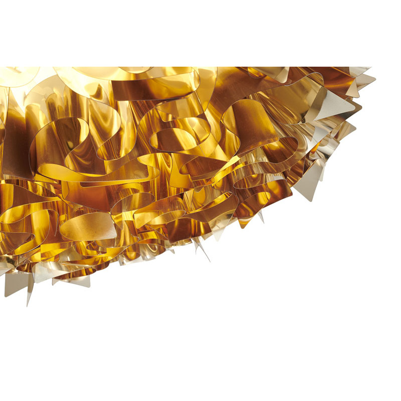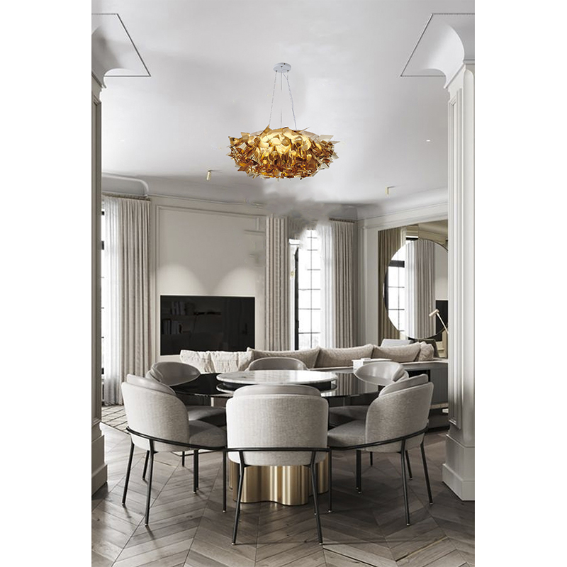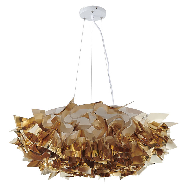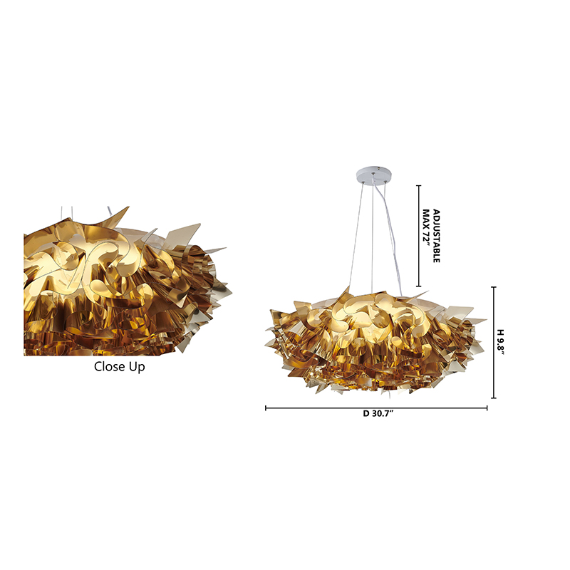 A SHINY GOLD ACRYLIC CHANDELIER WITH WHITE HARDWARE