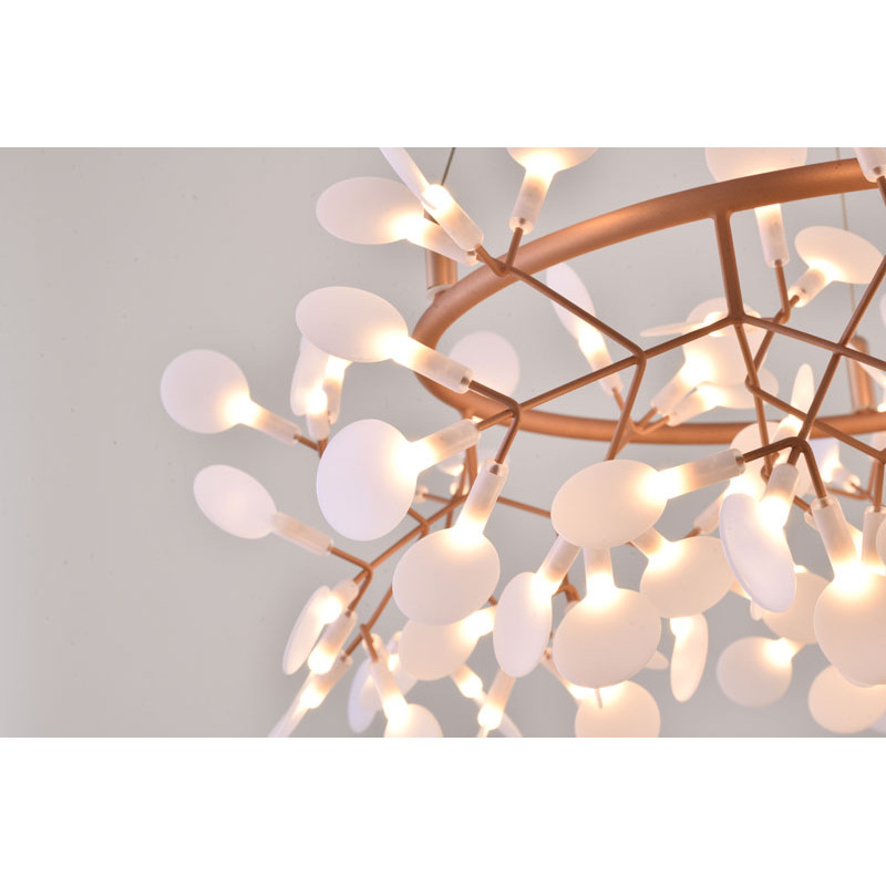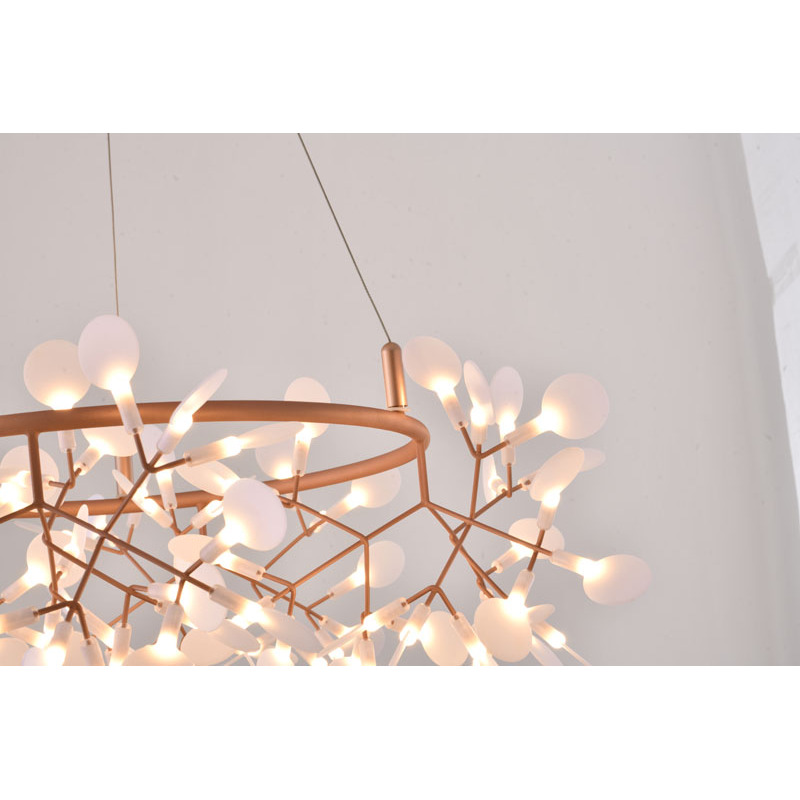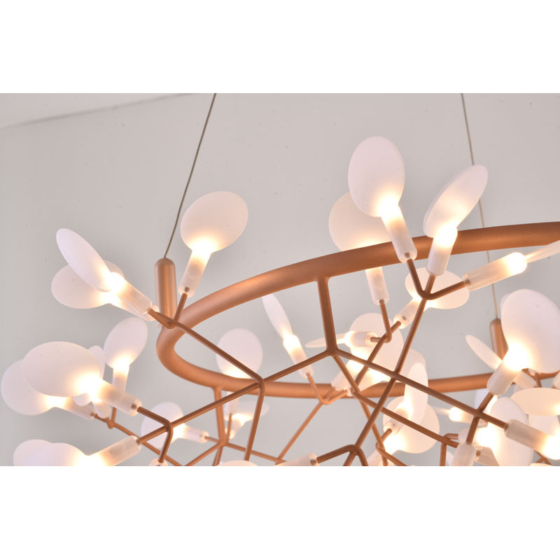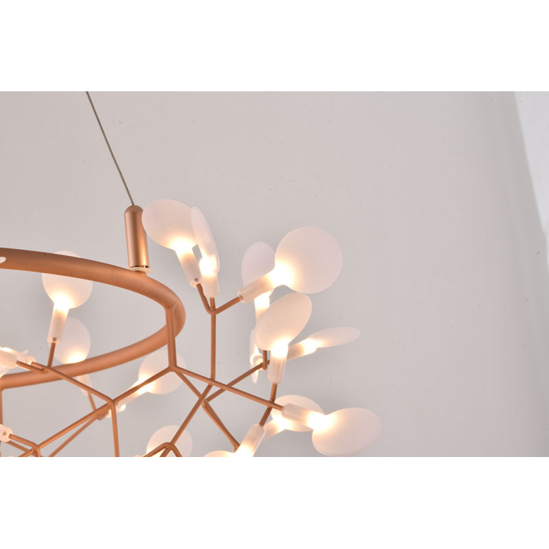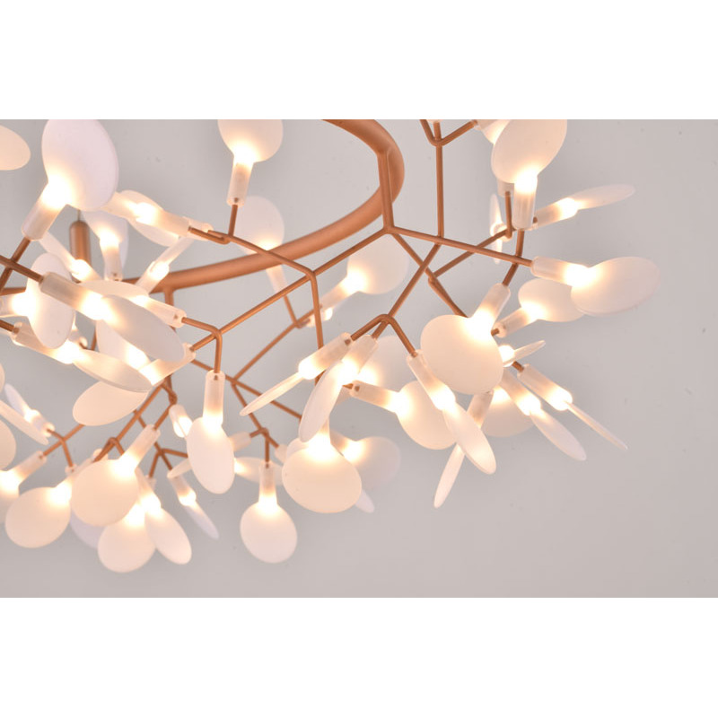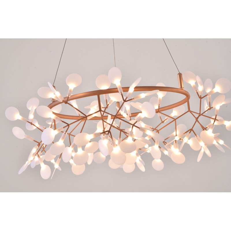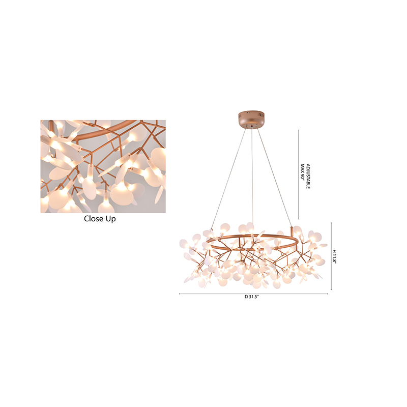 A ROUND LED LEAF PETAL CHANDELIER WITH A COPPER FRAME