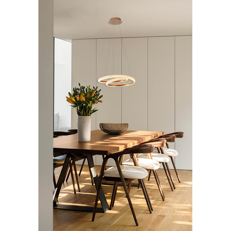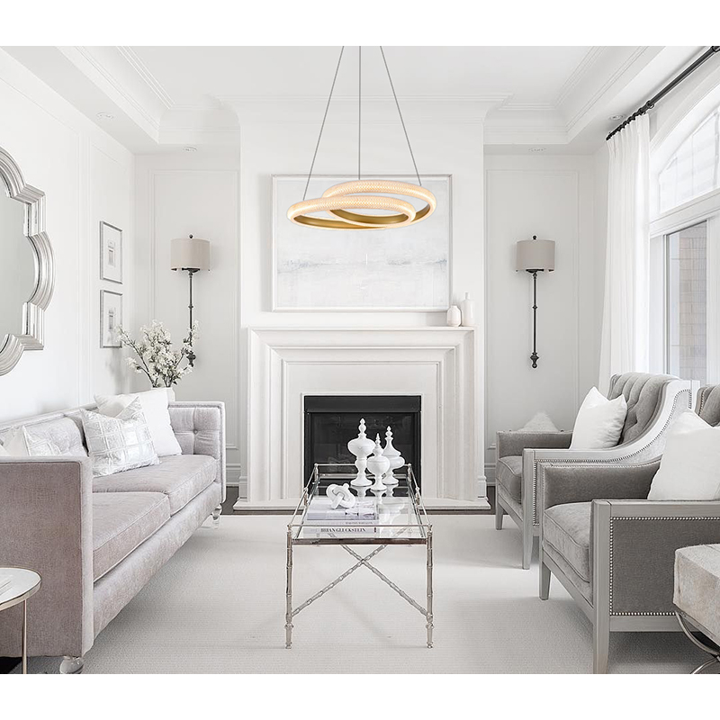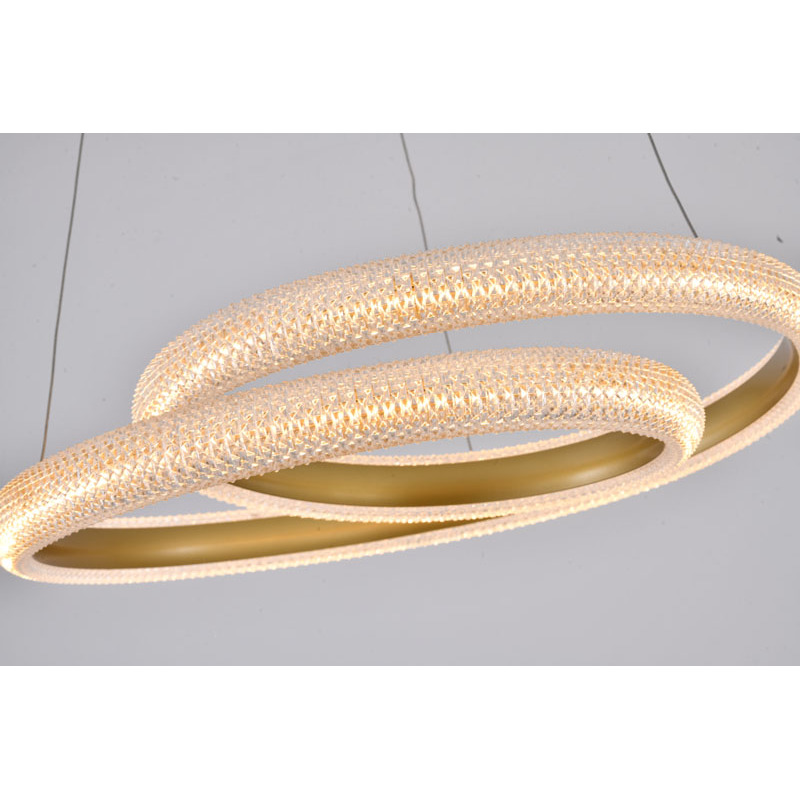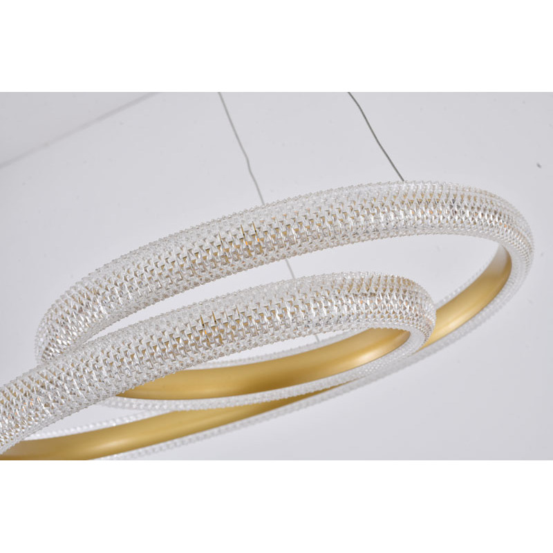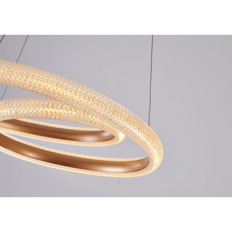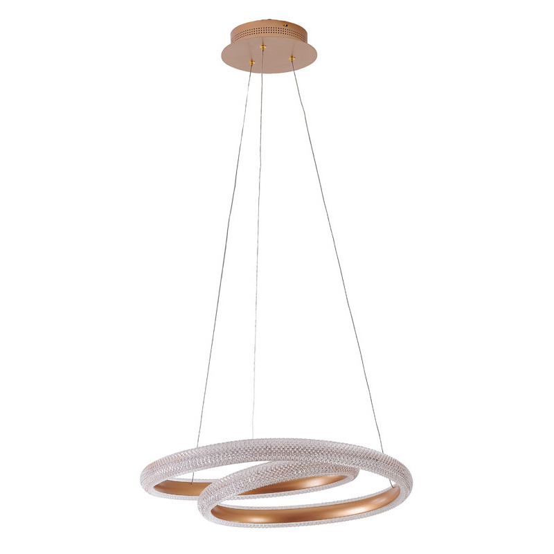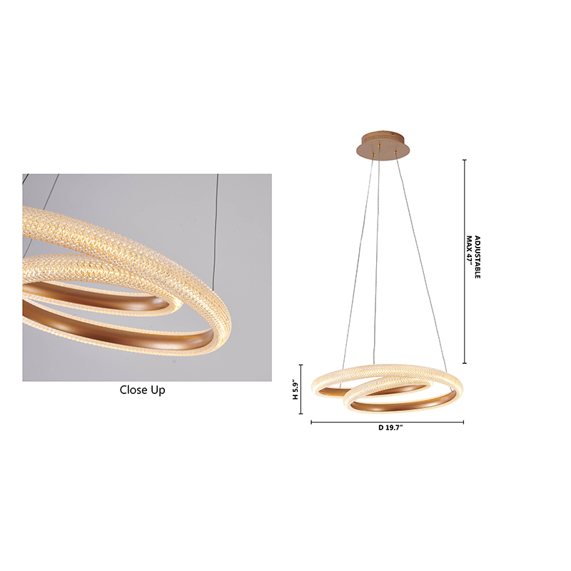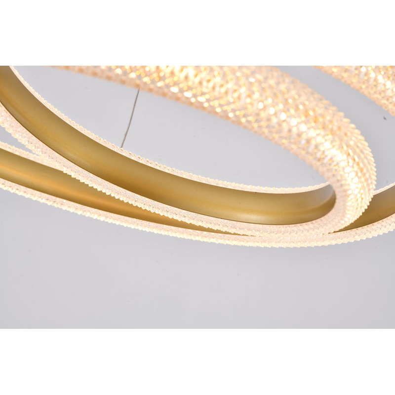 A GOLD SPIRAL FRAMED LED CHANDELIER WITH A CLEAR ACRYLIC DIFFUSER