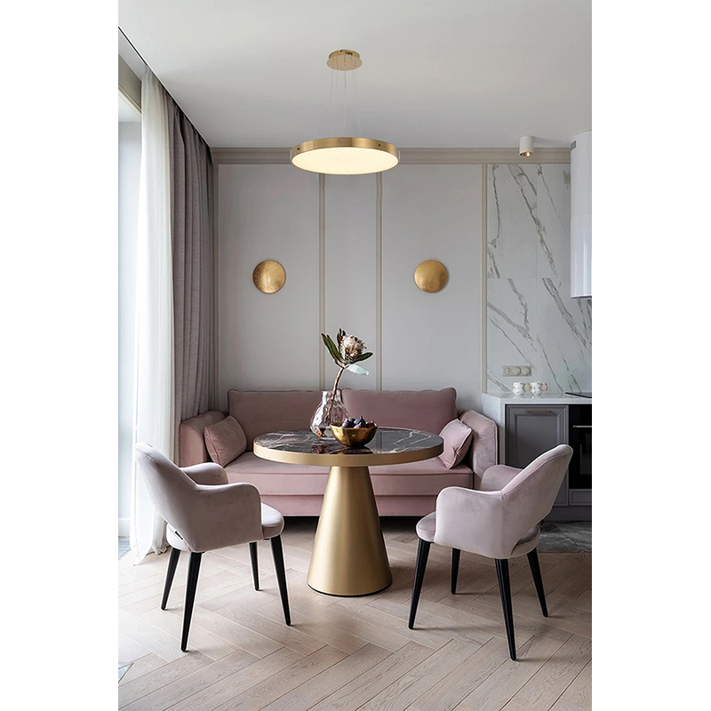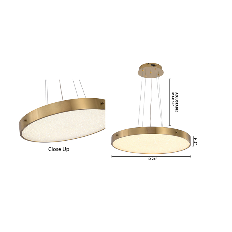 A BRASS FRAME LED CHANDELIER WITH A CLEAR ACRYLIC BEADED DIFFUSER