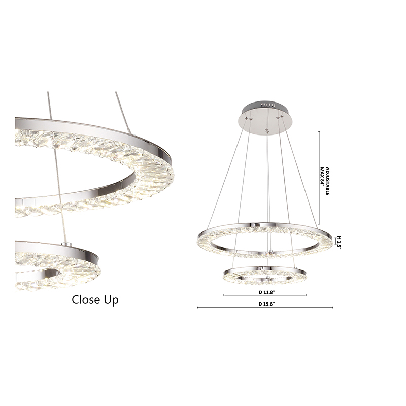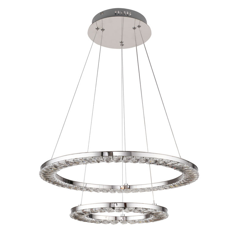 A TWO TIER DOUBLE RING CLEAR CRYSTAL LED LIGHT FIXTURE WITH A CHROME STAINLESS STEEL FRAME