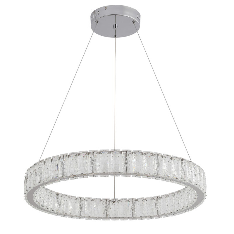 A CLEAR SPOTTED CRYSTAL HALO RING CHANDELIER WITH A CHROME FRAME