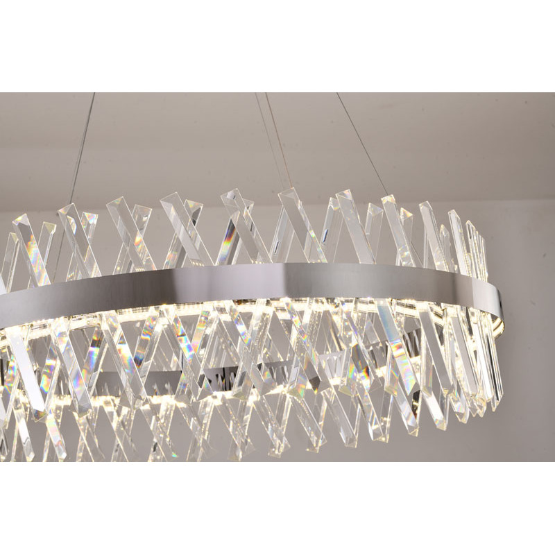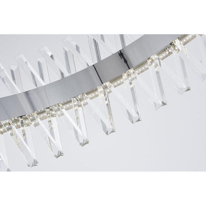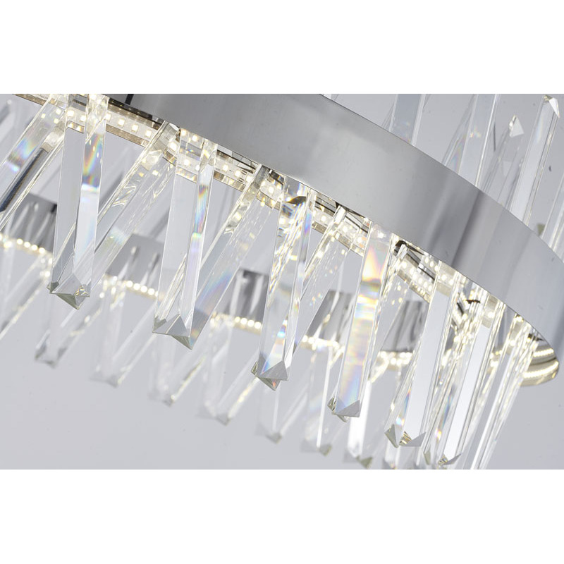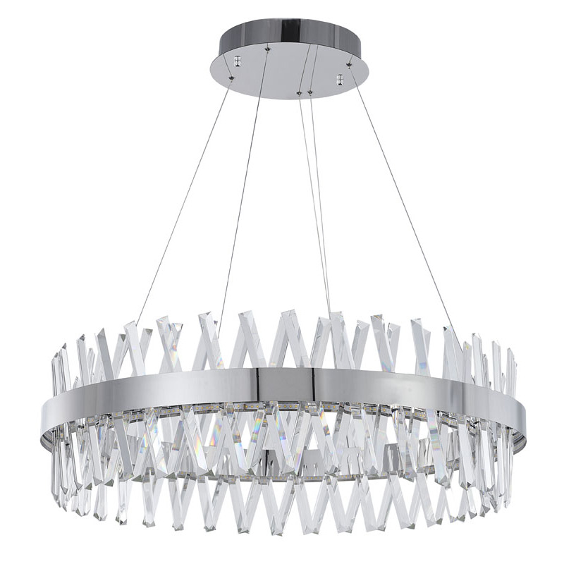 A ROUND CHROME FRAMED CHANDELIER WITH CLEAR CRYSTALS