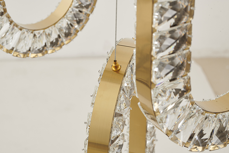 A FIVE CLEAR CRYSTAL RING LED CHANDELIER WITH BRASS HARDWARE