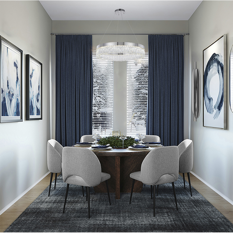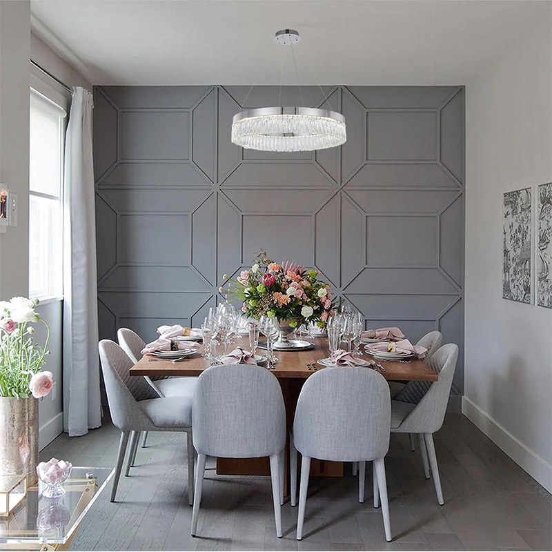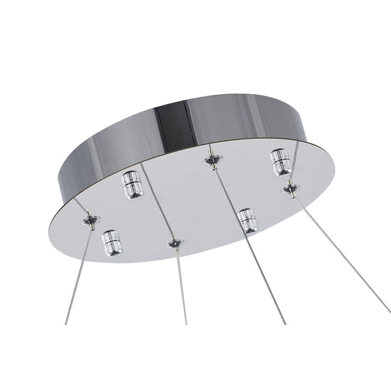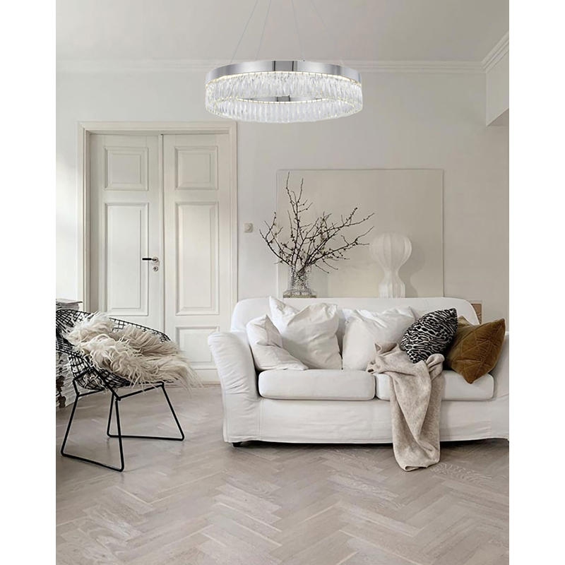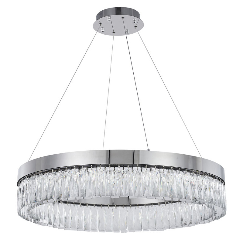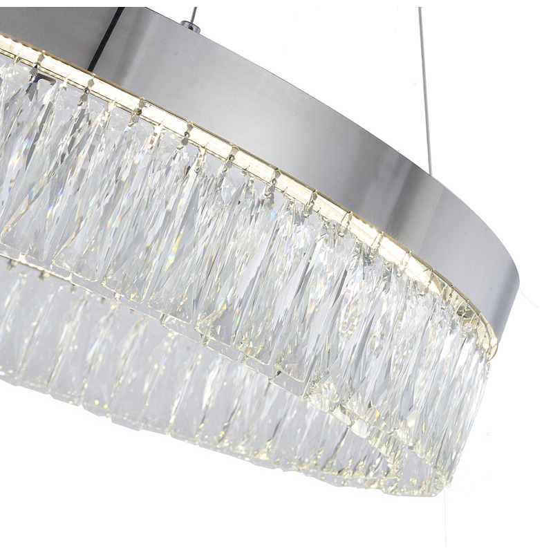 A ROUND CHROME FRAME LED CHANDELIER WITH CLEAR HANGING CRYSTALS