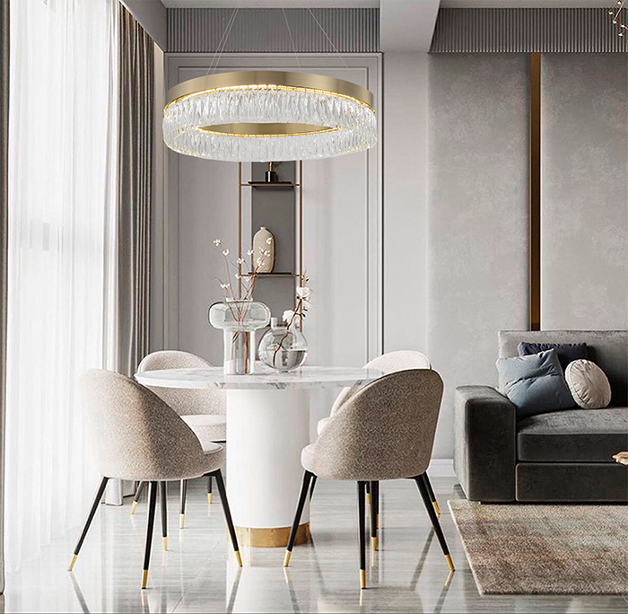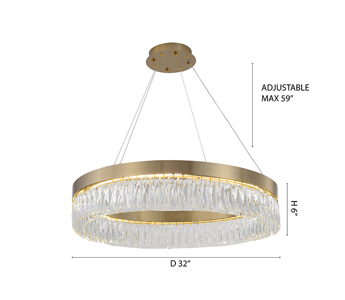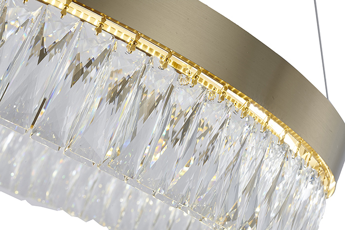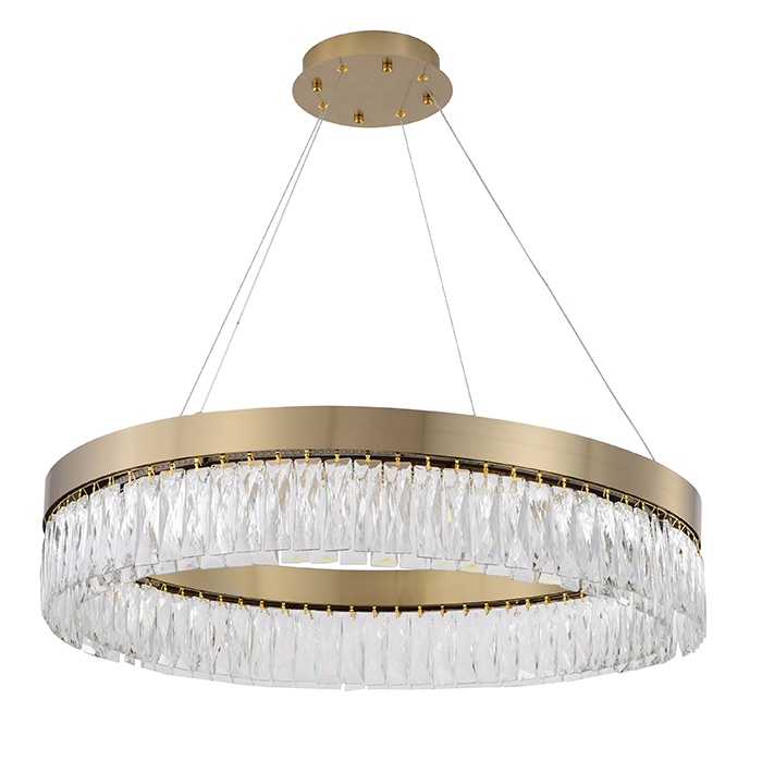 A ROUND GOLD HAIRLINE FRAME LED CHANDELIER WITH CLEAR HANGING CRYSTALS