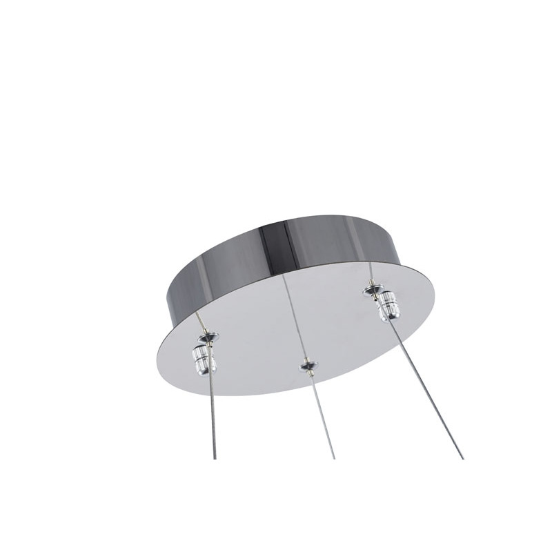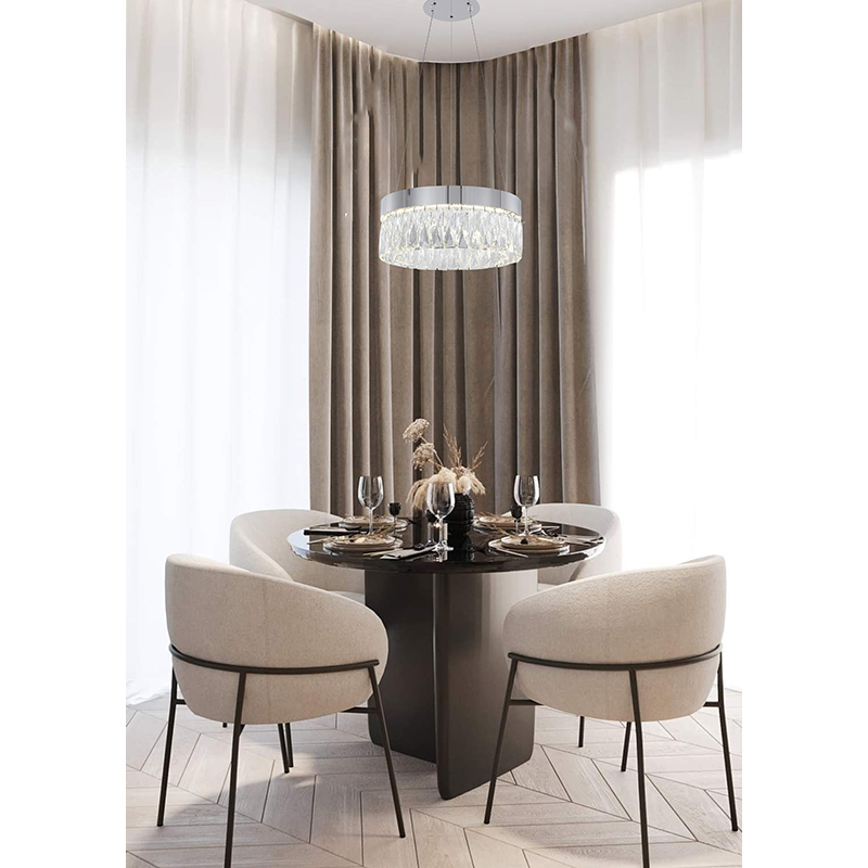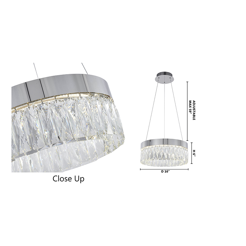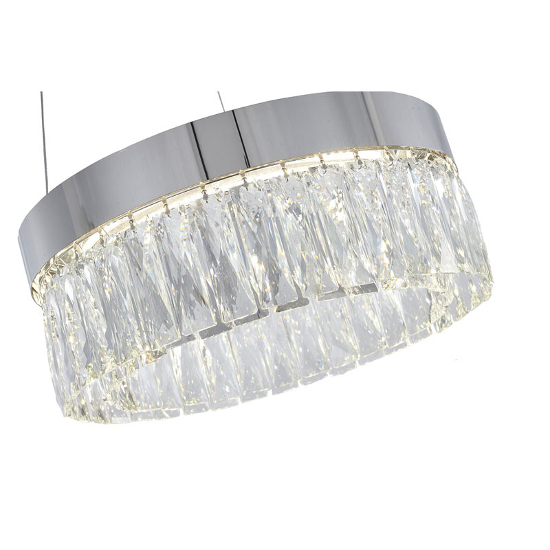 A ROUND CHROME FRAME LED CHANDELIER WITH CLEAR HANGING CRYSTALS