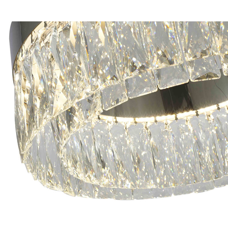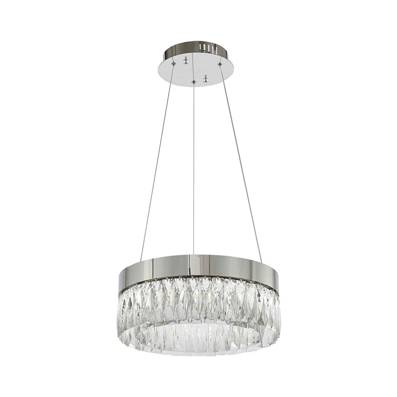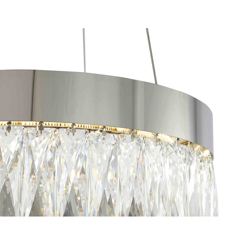 A ROUND CHROME FRAME LED CHANDELIER WITH CLEAR HANGING CRYSTALS