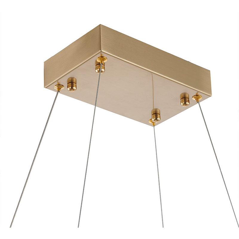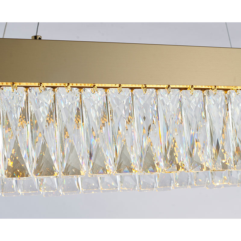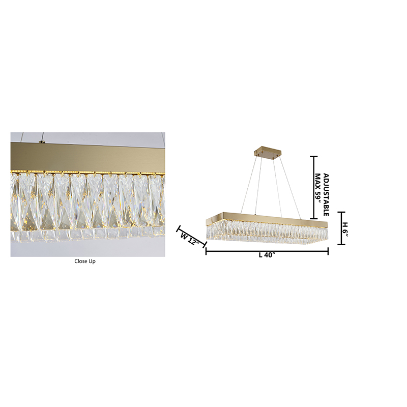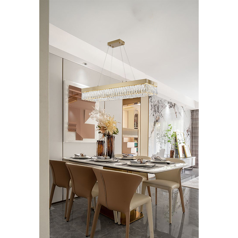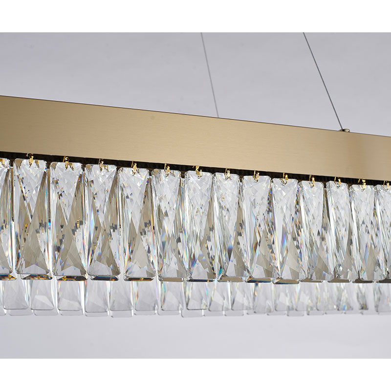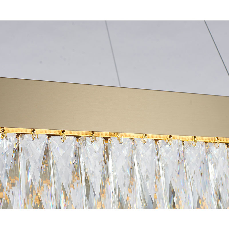 A GOLD HAIRLINE RECTANGULAR FRAME CHANDELIER WITH CLEAR HANGING CRYSTALS