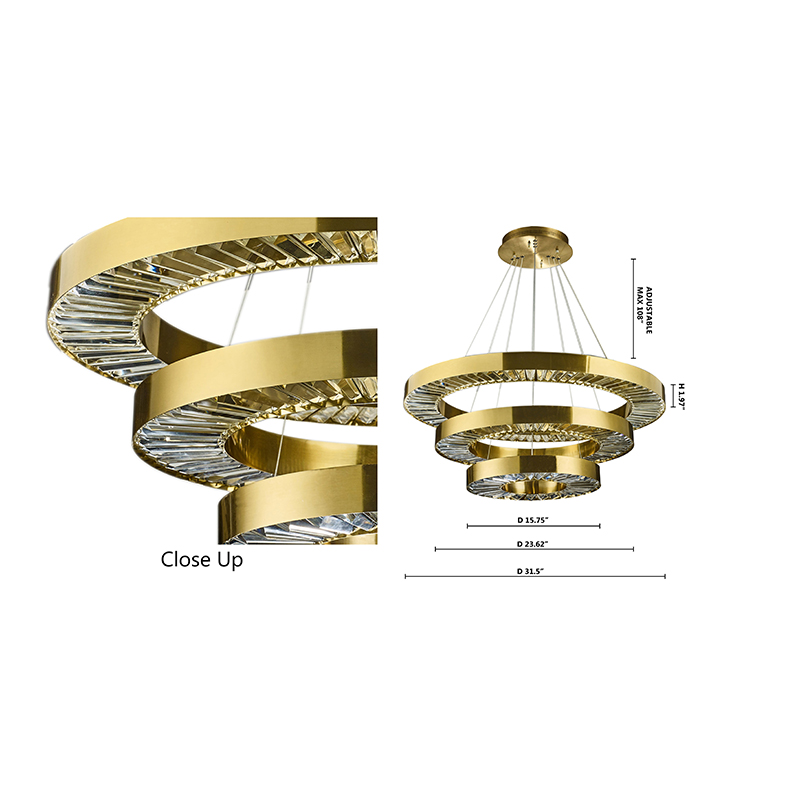 A THREE TIER GOLD RING CHANDELIER WITH A CLEAR CRYSTAL DIFFUSER