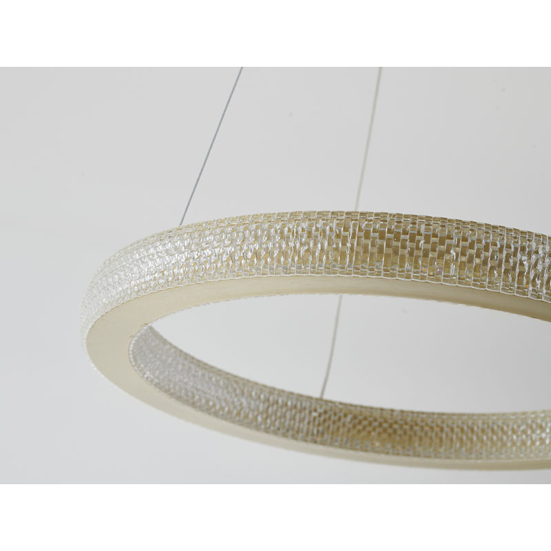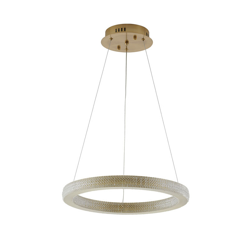 A SAND GOLD HALO LED CHANDELIER WITH AN ACRYLIC CLEAR LENS