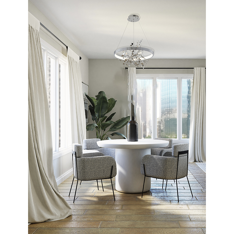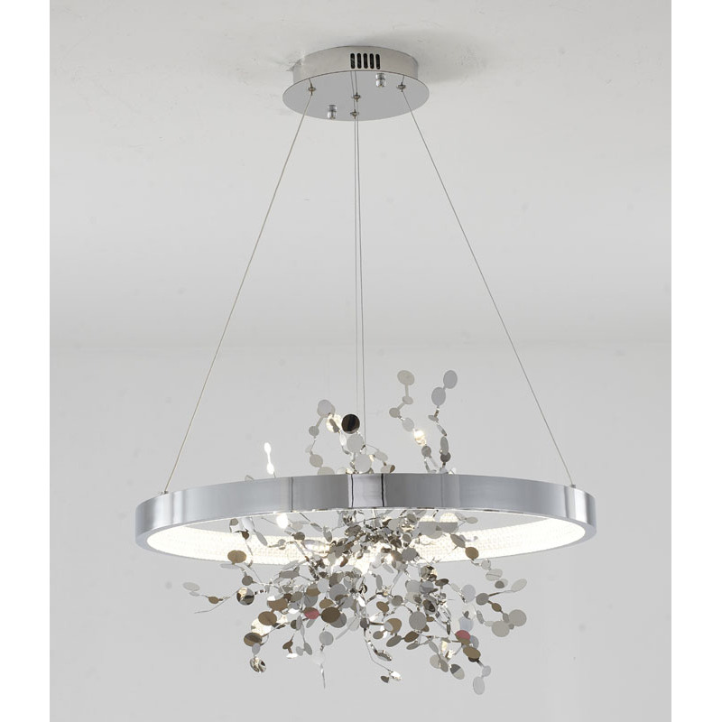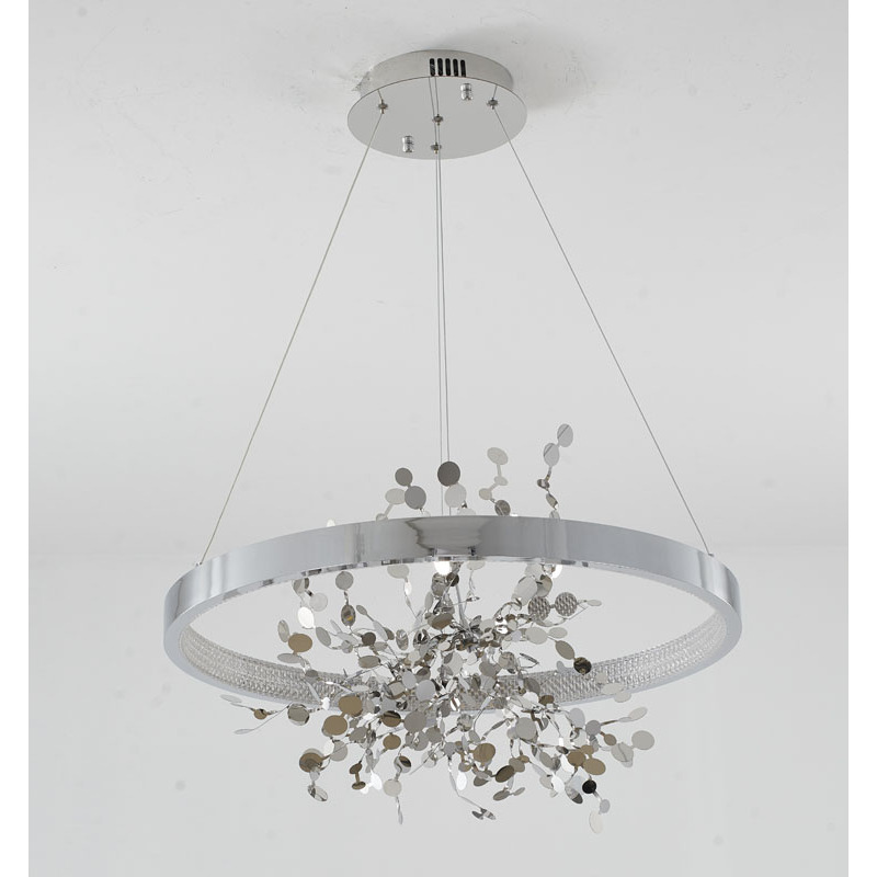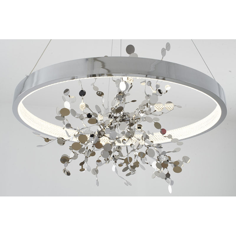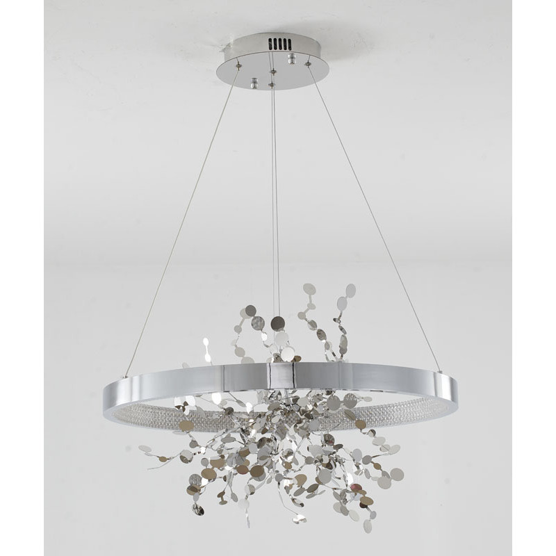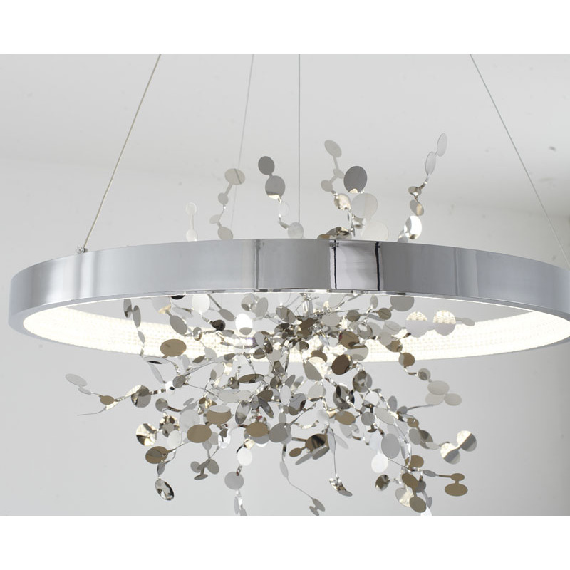 A CHROME FRAME CHANDELIER WITH A CHROME STAINLESS STEEL CONFETTI INTERIOR & A TRANSPARENT DIFFUSER