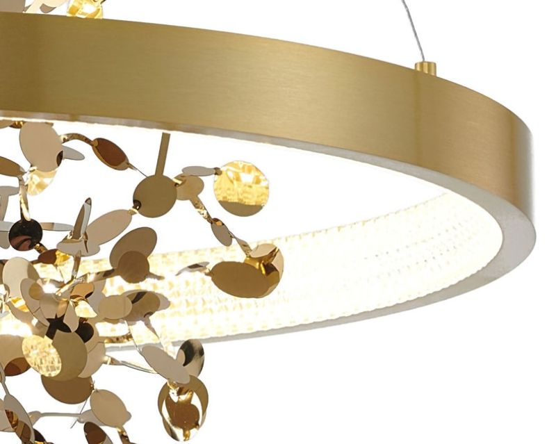 A SAND GOLD FRAME CHANDELIER WITH A GOLD STAINLESS STEEL CONFETTI INTERIOR & A TRANSPARENT DIFFUSER