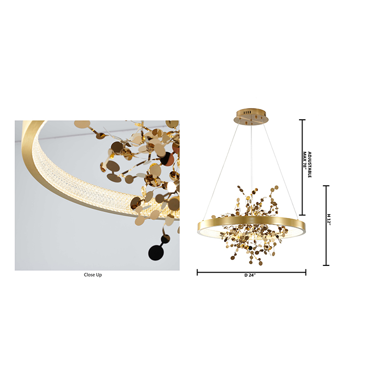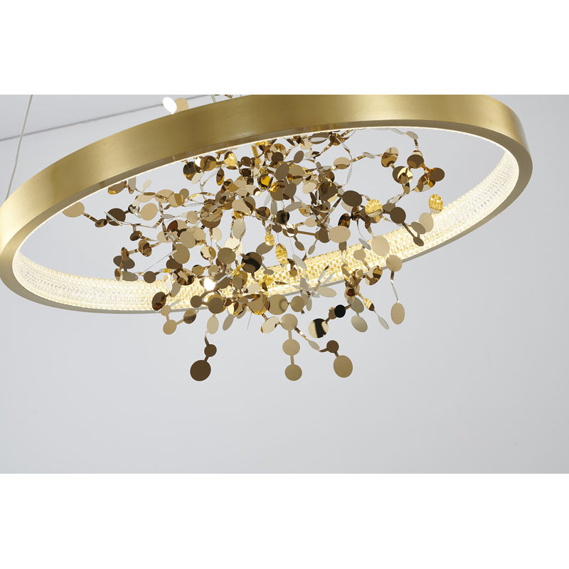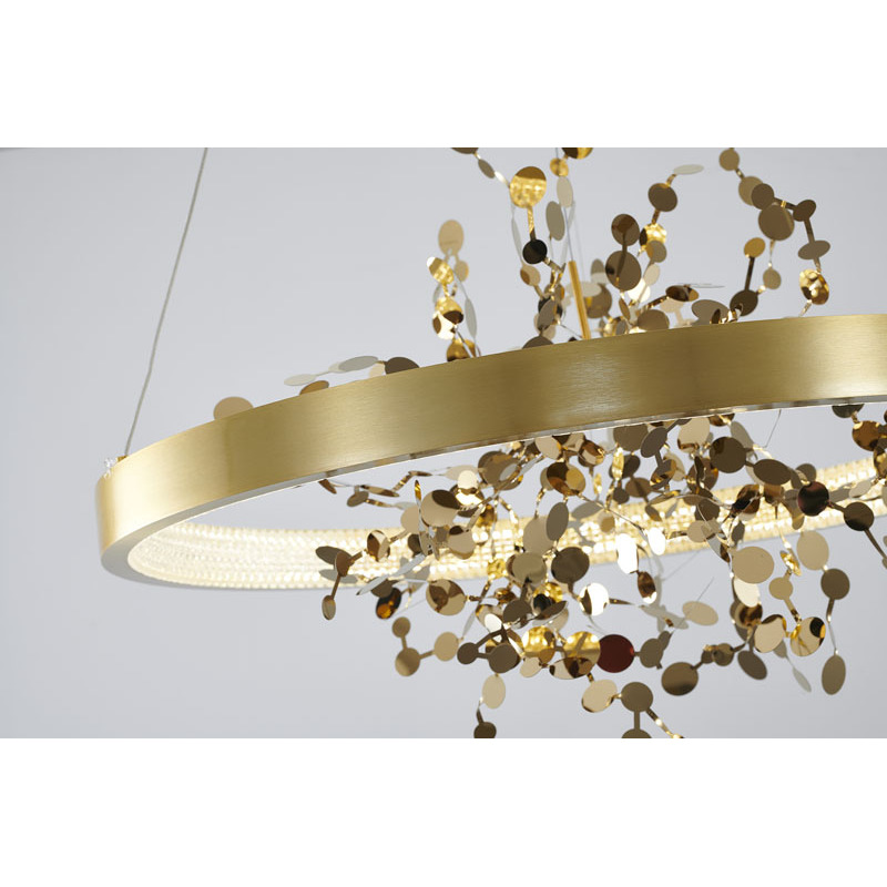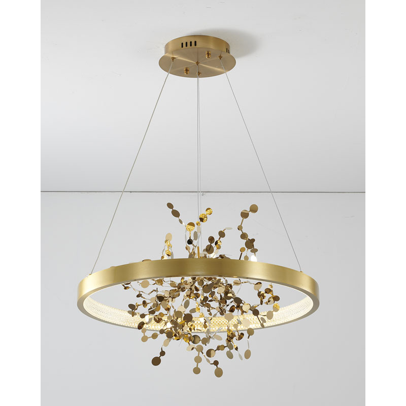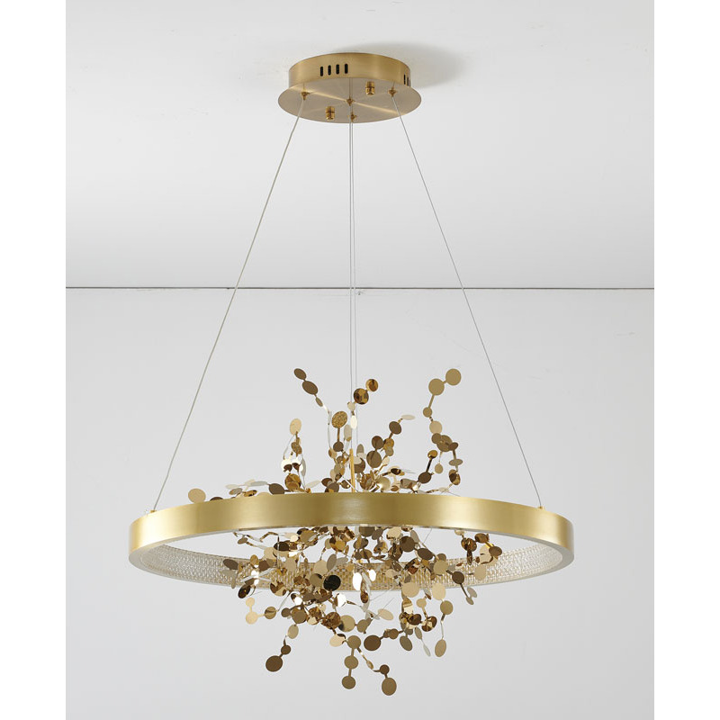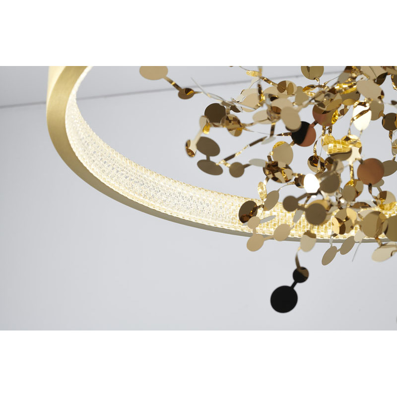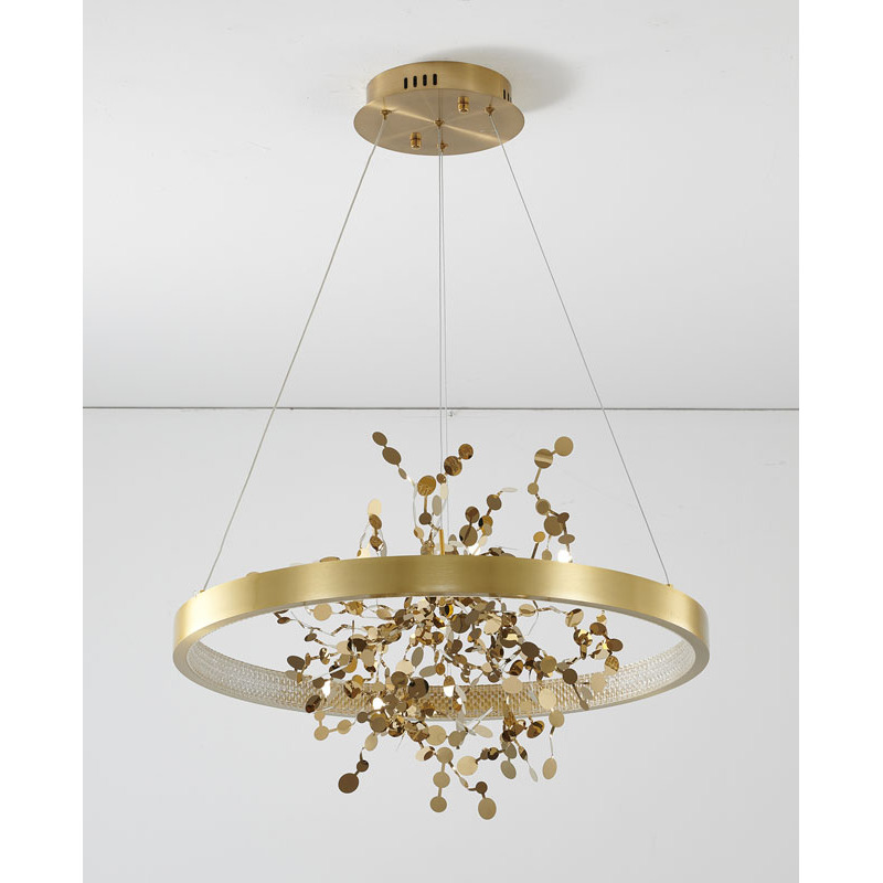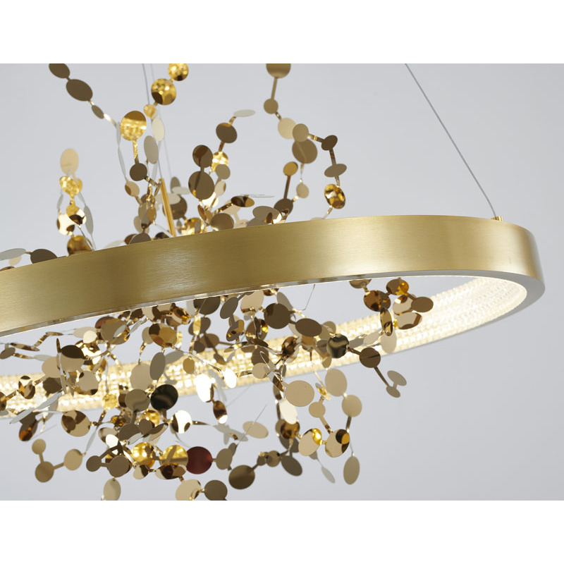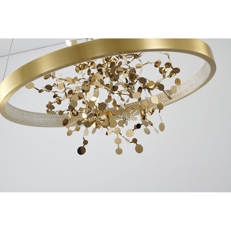 A SAND GOLD FRAME CHANDELIER WITH A GOLD STAINLESS STEEL CONFETTI INTERIOR & A TRANSPARENT DIFFUSER