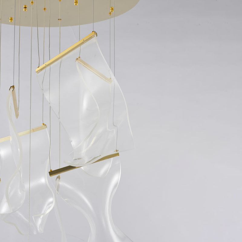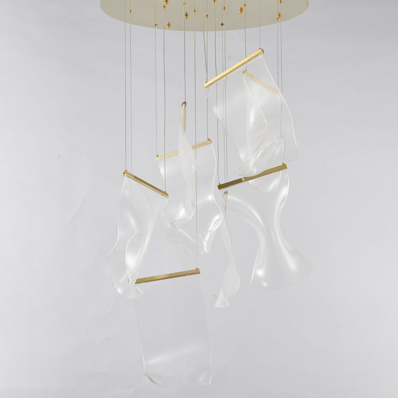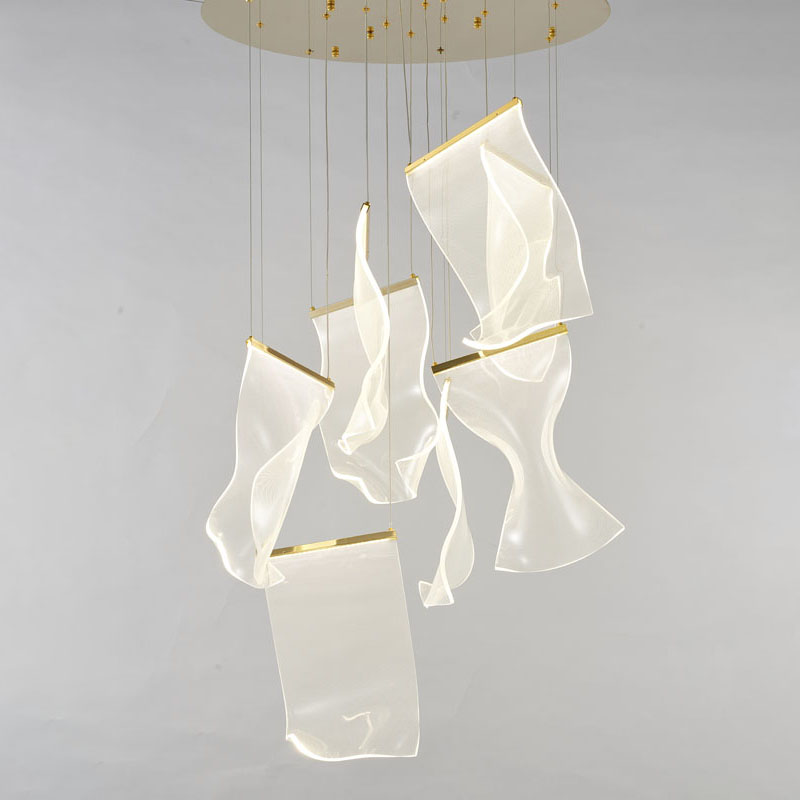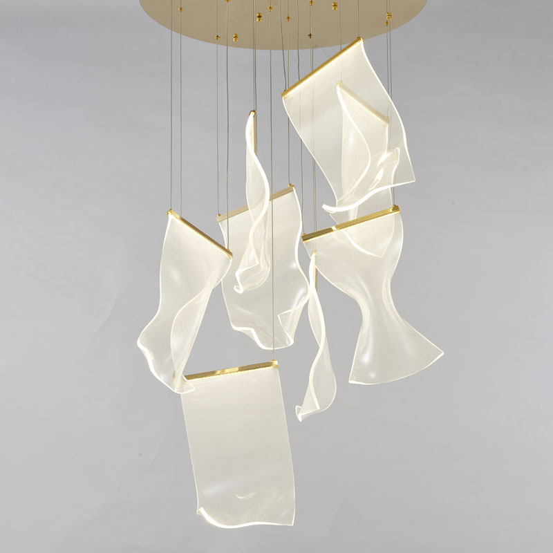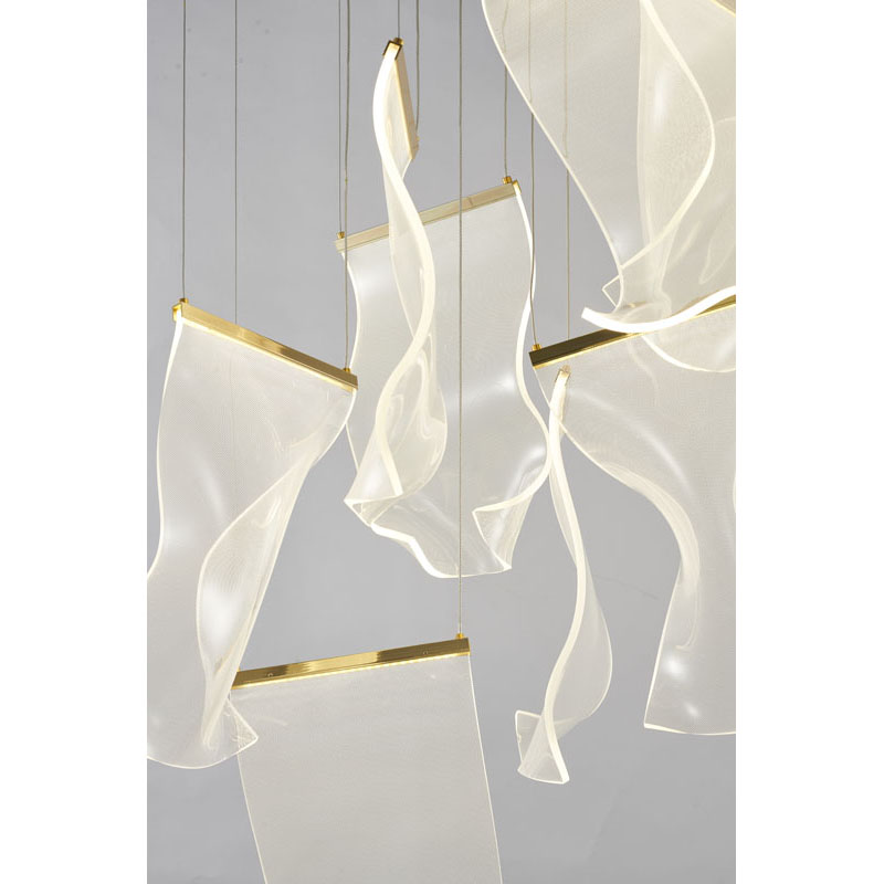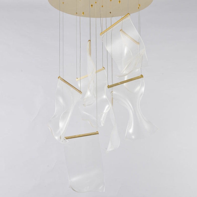 A FLUSHED GOLD CHANDELIER WITH ACRYLIC CRUMBLED SHEET HANGING PENDANTS