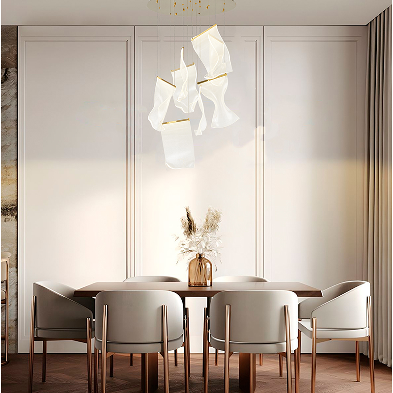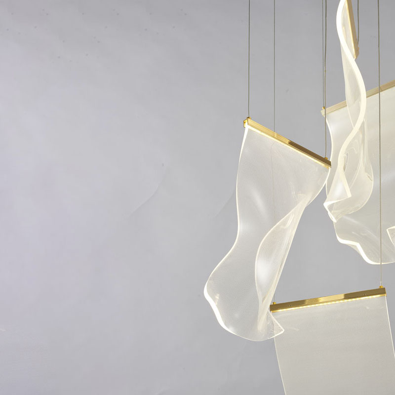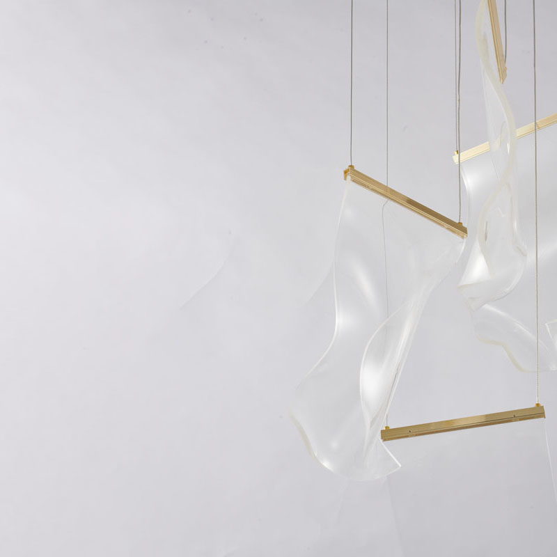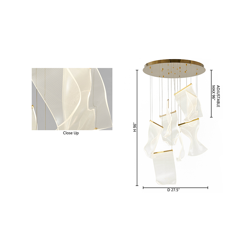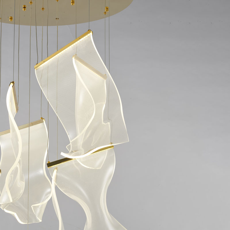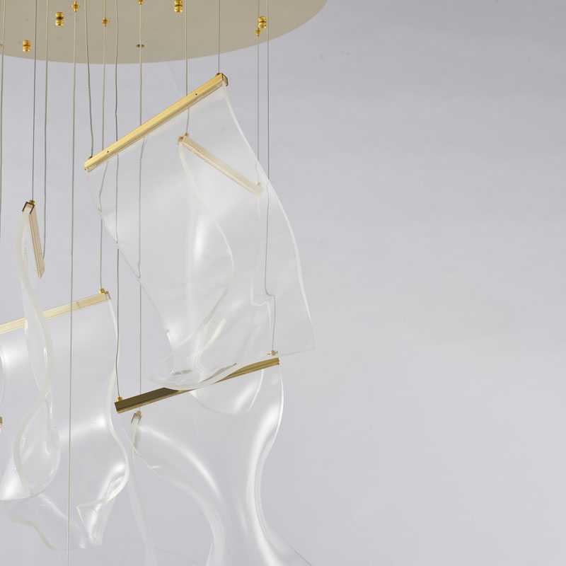 A FLUSHED GOLD CHANDELIER WITH ACRYLIC CRUMBLED SHEET HANGING PENDANTS