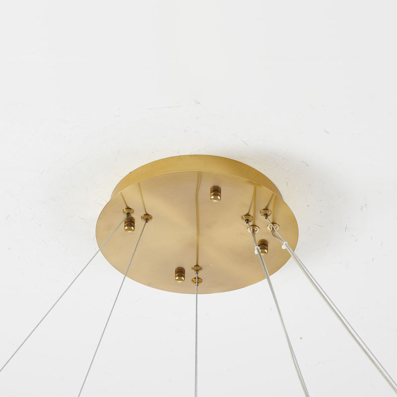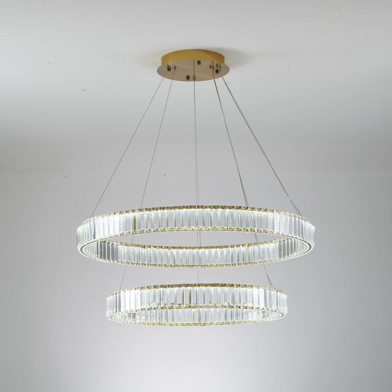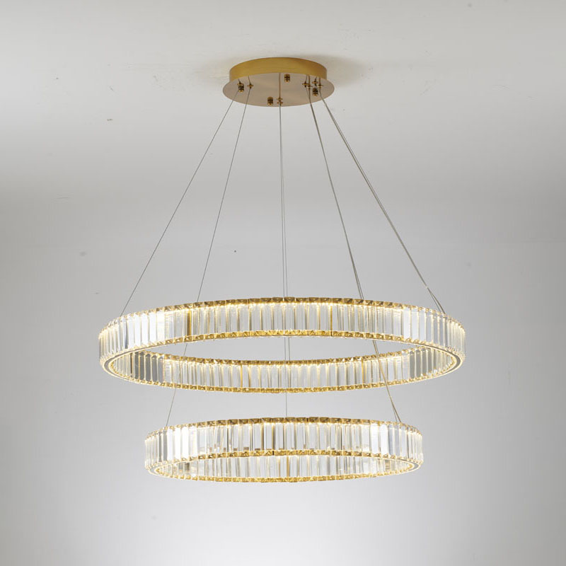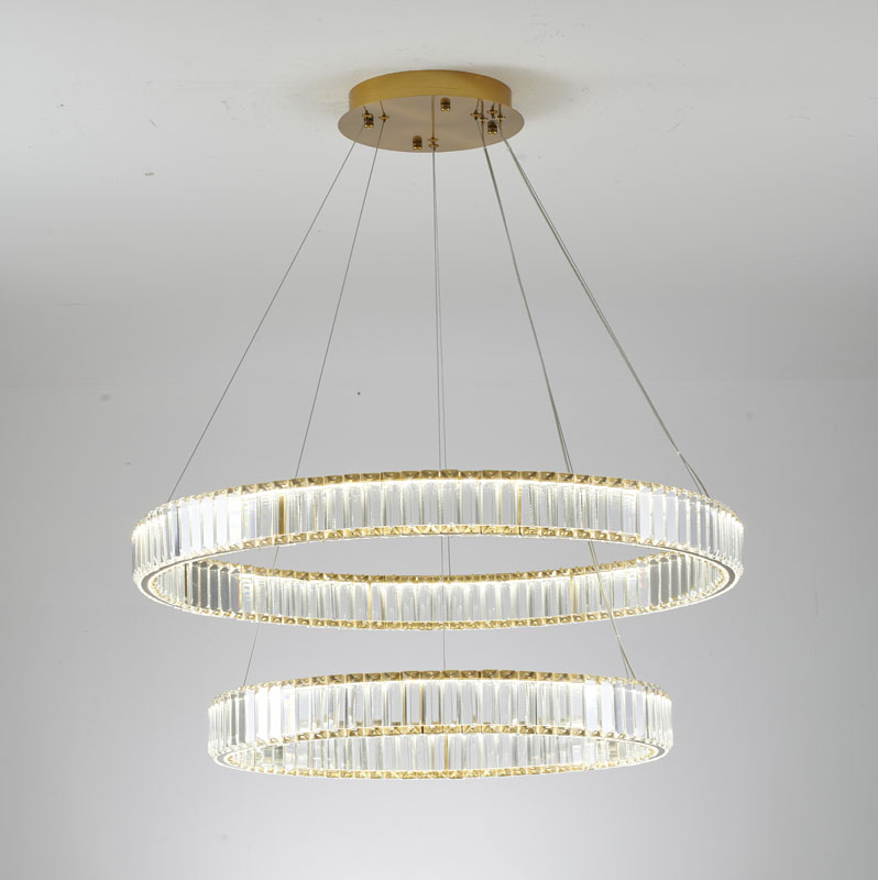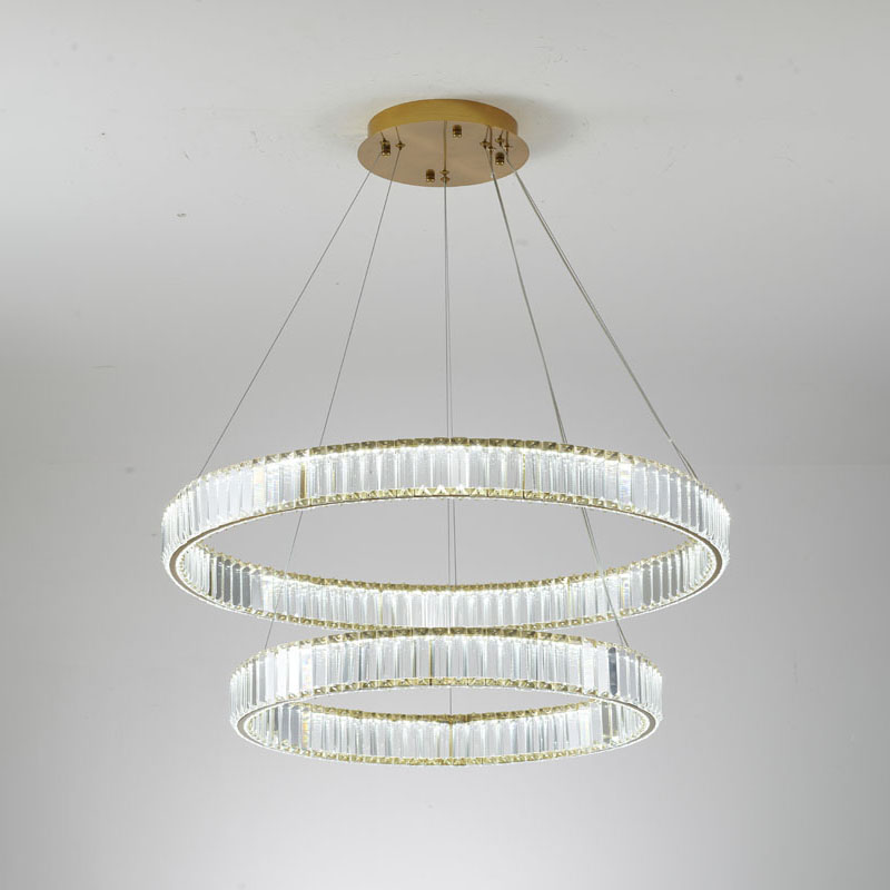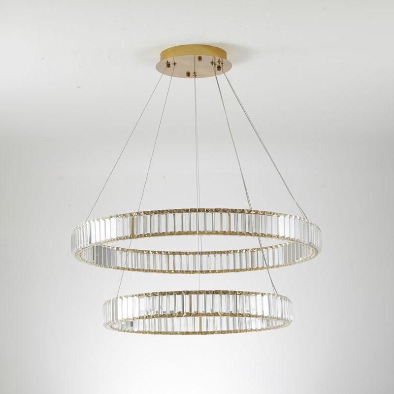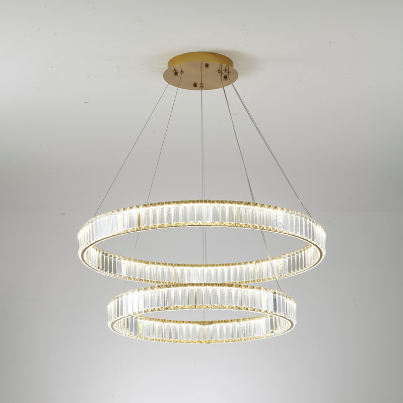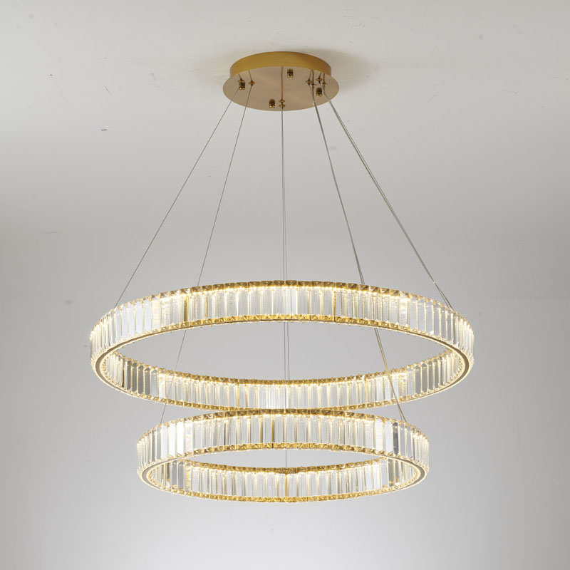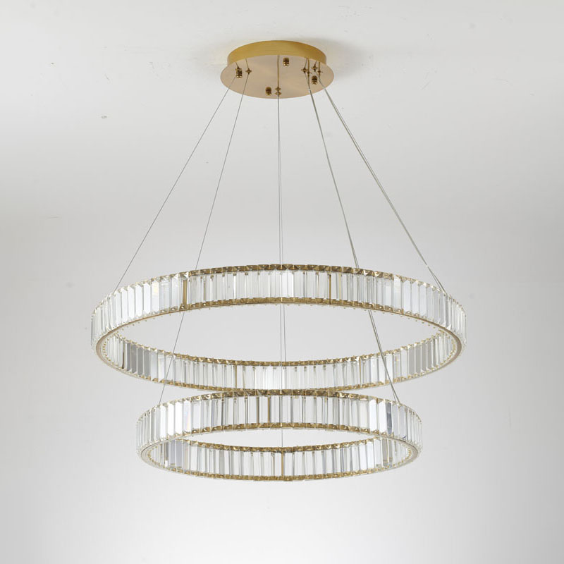 A TWO TIER CLEAR CRYSTAL HALO RING CHANDELIER WITH GOLD HARDWARE