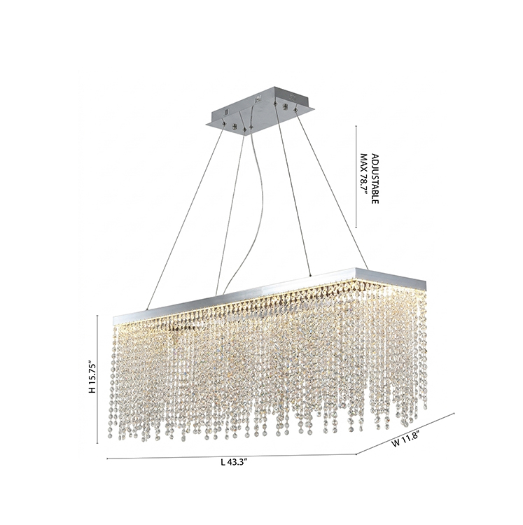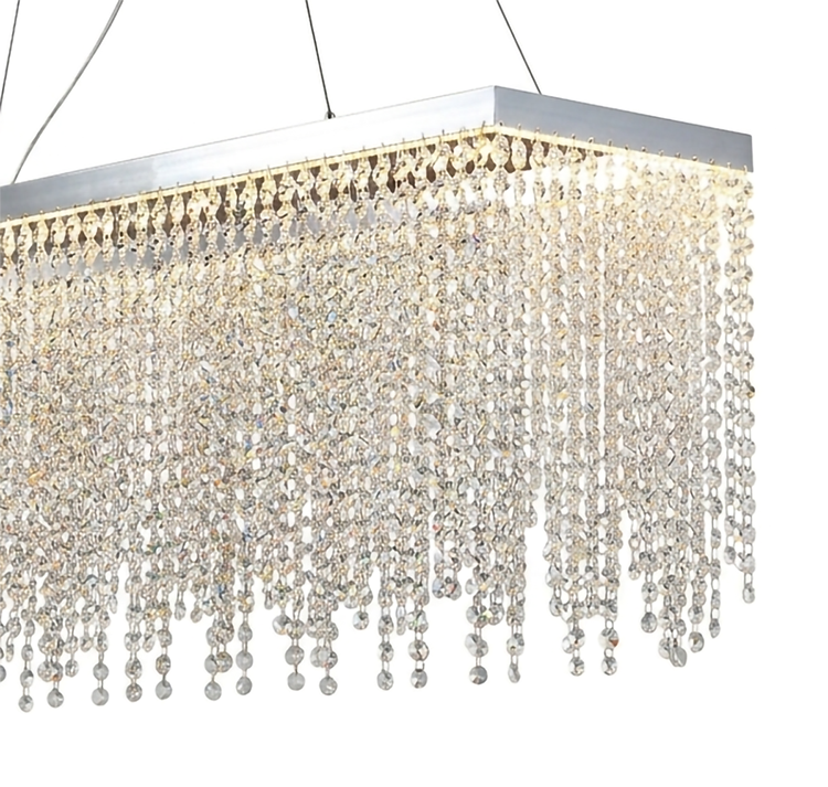 A CHROME RECTANGULAR FRAME LED CHANDELIER WITH CLEAR BEADED CRYSTALS DRAPING AROUND