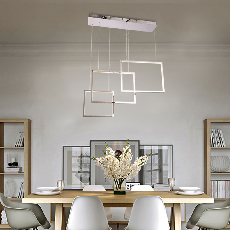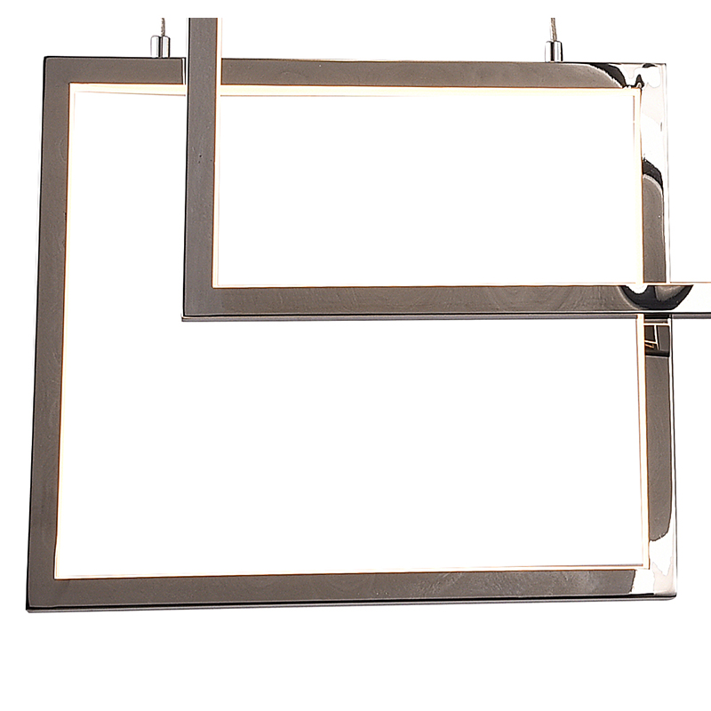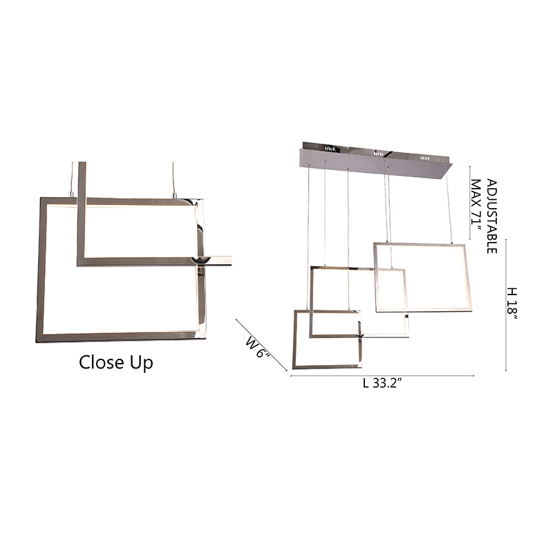 A CHROME STAINLESS STEEL FRAME CHANDELIER WITH HANGING BOX LIGHTS