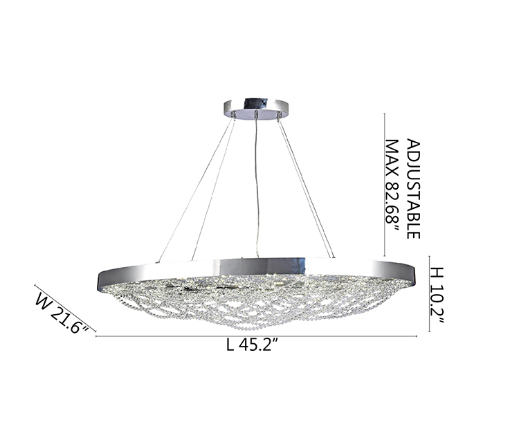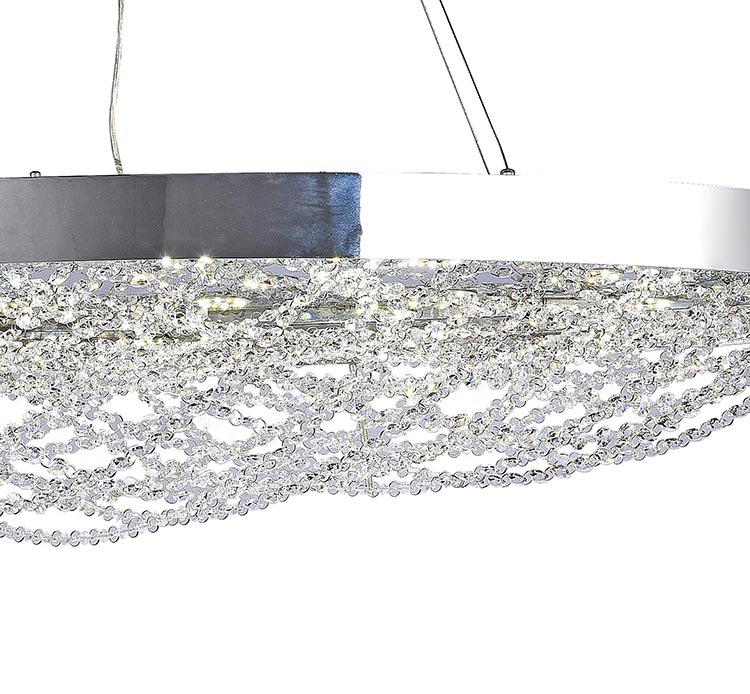 A CHROME OVAL METAL FRAME CHANDELIER WITH A BASKET OF CLEAR CRYSTAL BEADING