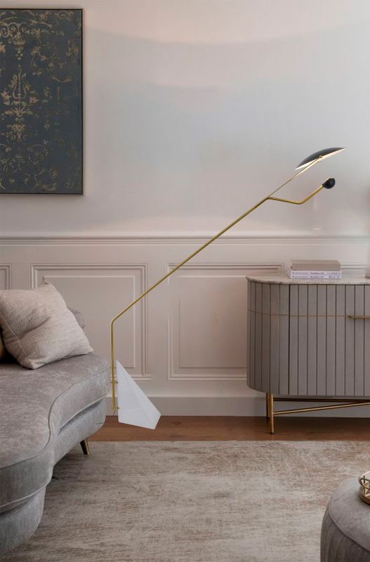BLACK ALUMINUM FRAME LED FLOOR LAMP WITH A WHITE MARBLE BASE AND A BLACK METAL SHADE