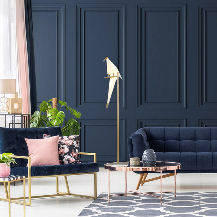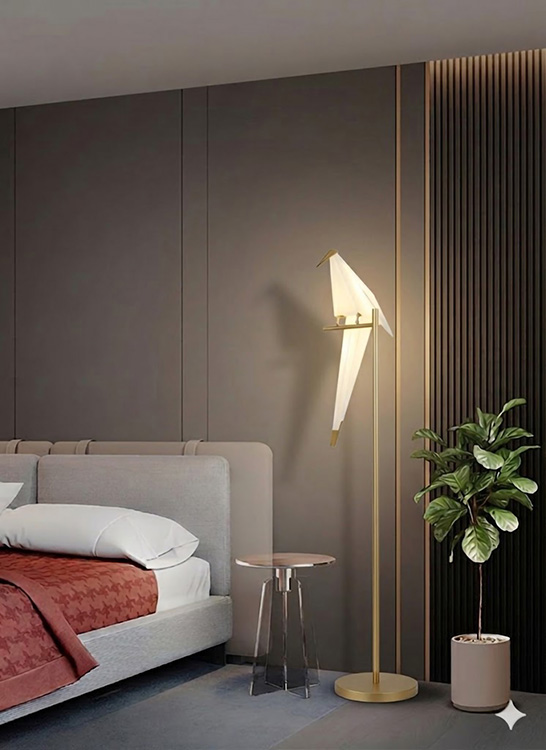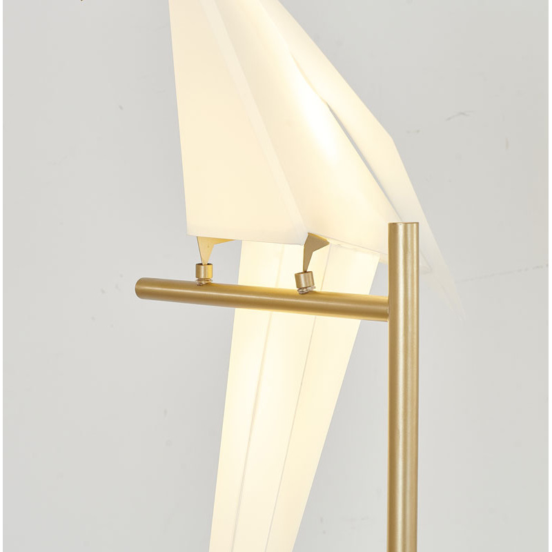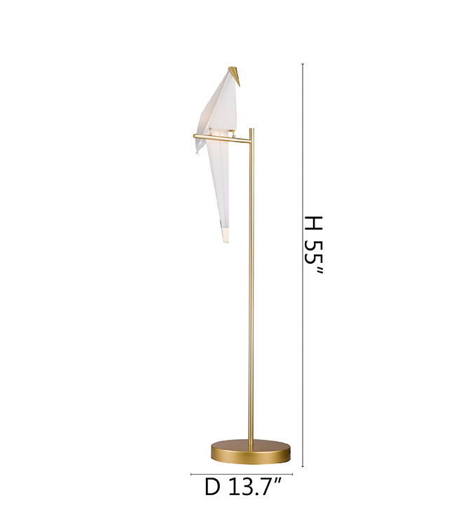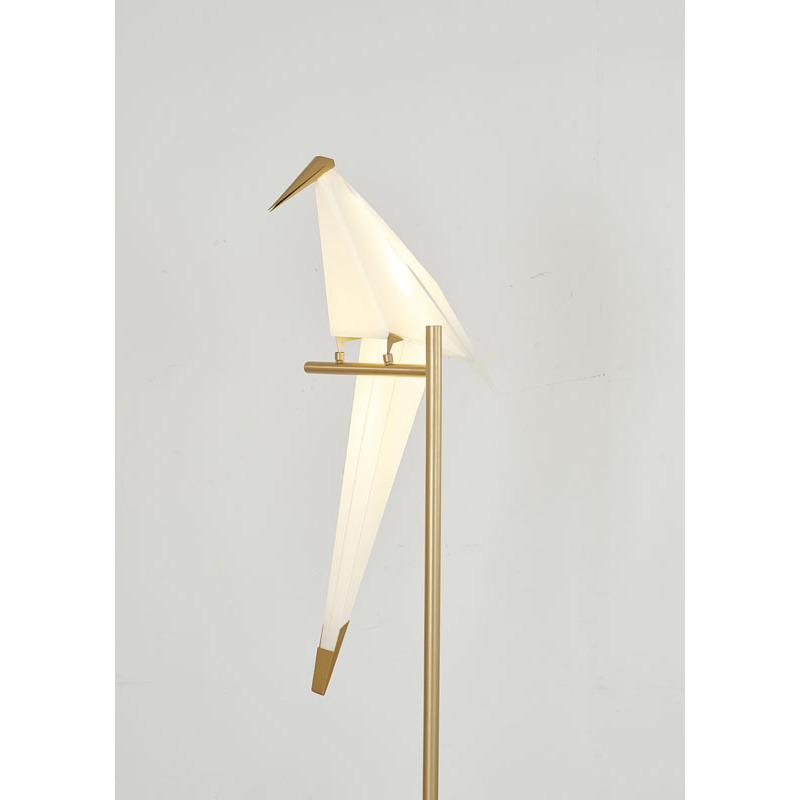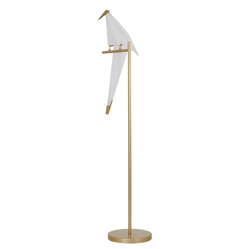 AN LED BIRD FLOOR LAMP WITH GOLD CARBON STEEL HARDWARE AND PLASTIC FRAME BIRD