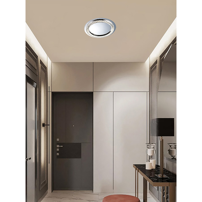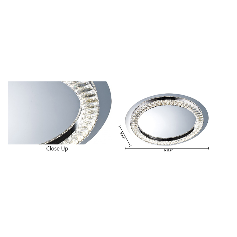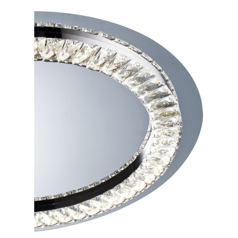 A CLEAR CRYSTAL LED FLUSH MOUNT WITH A STAINLESS STEEL FRAME