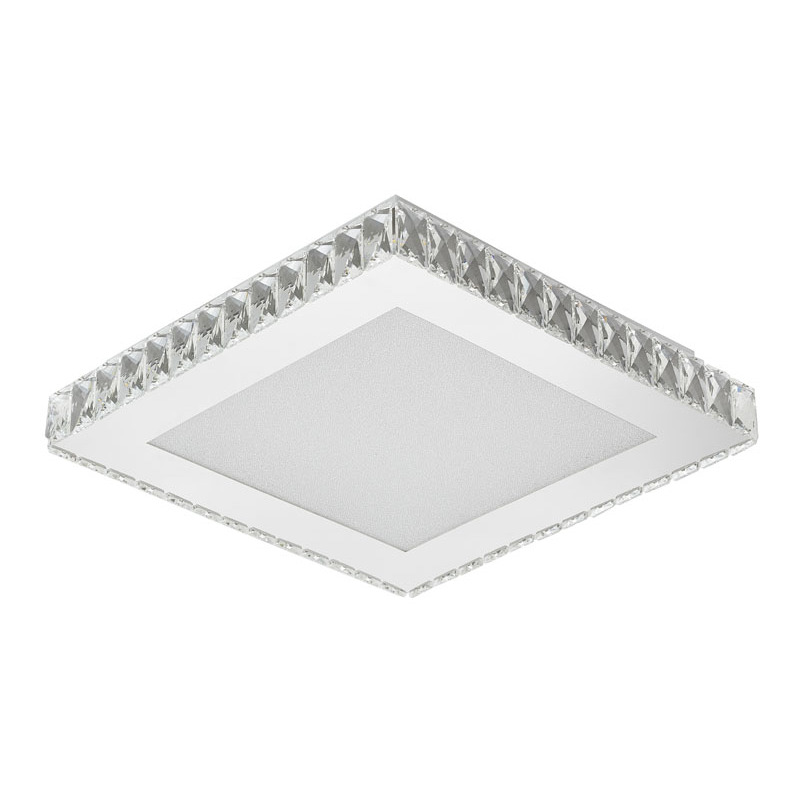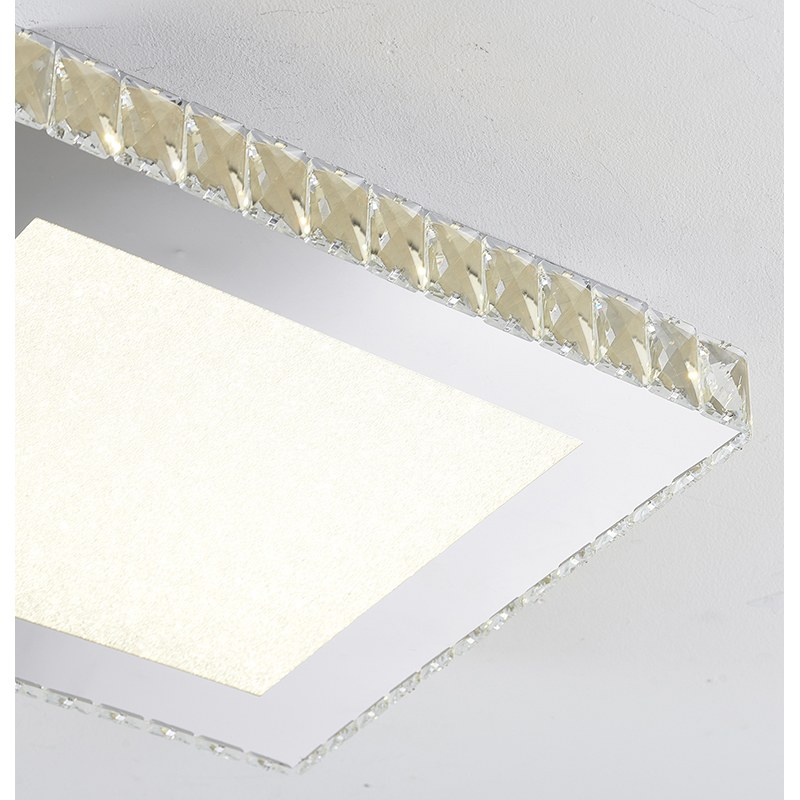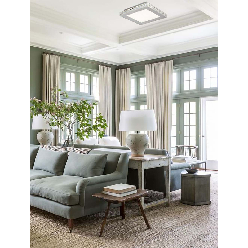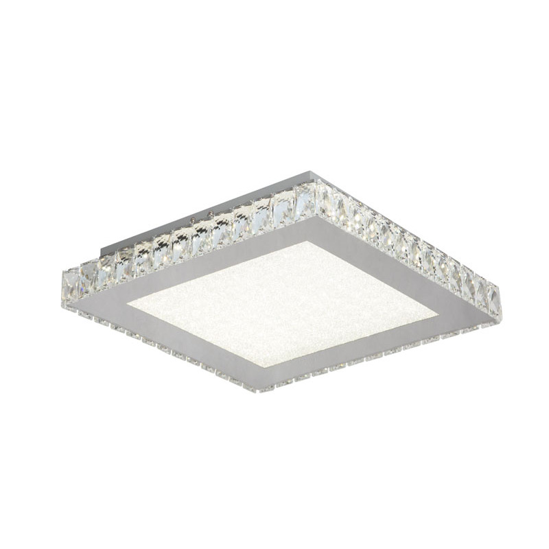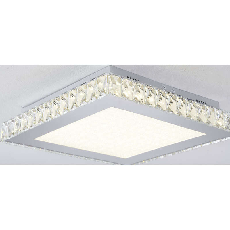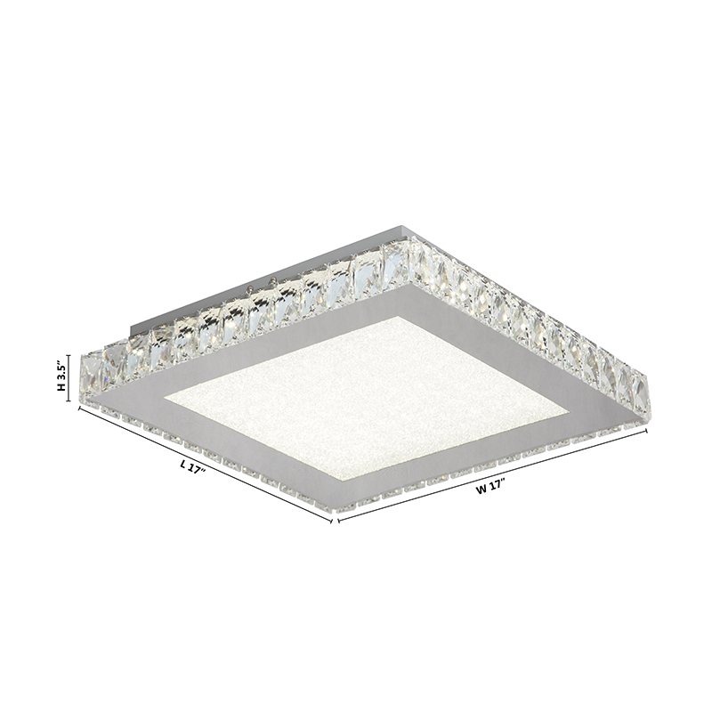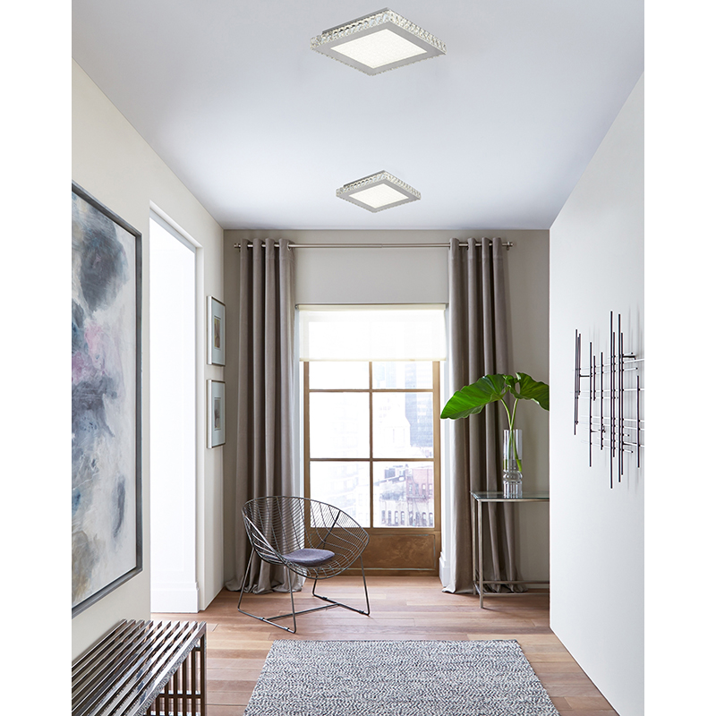 A SQUARE CLEAR CRYSTAL FLUSH MOUNT WITH CHROME HARDWARE & A BEADED ACRYLIC DIFFUSER