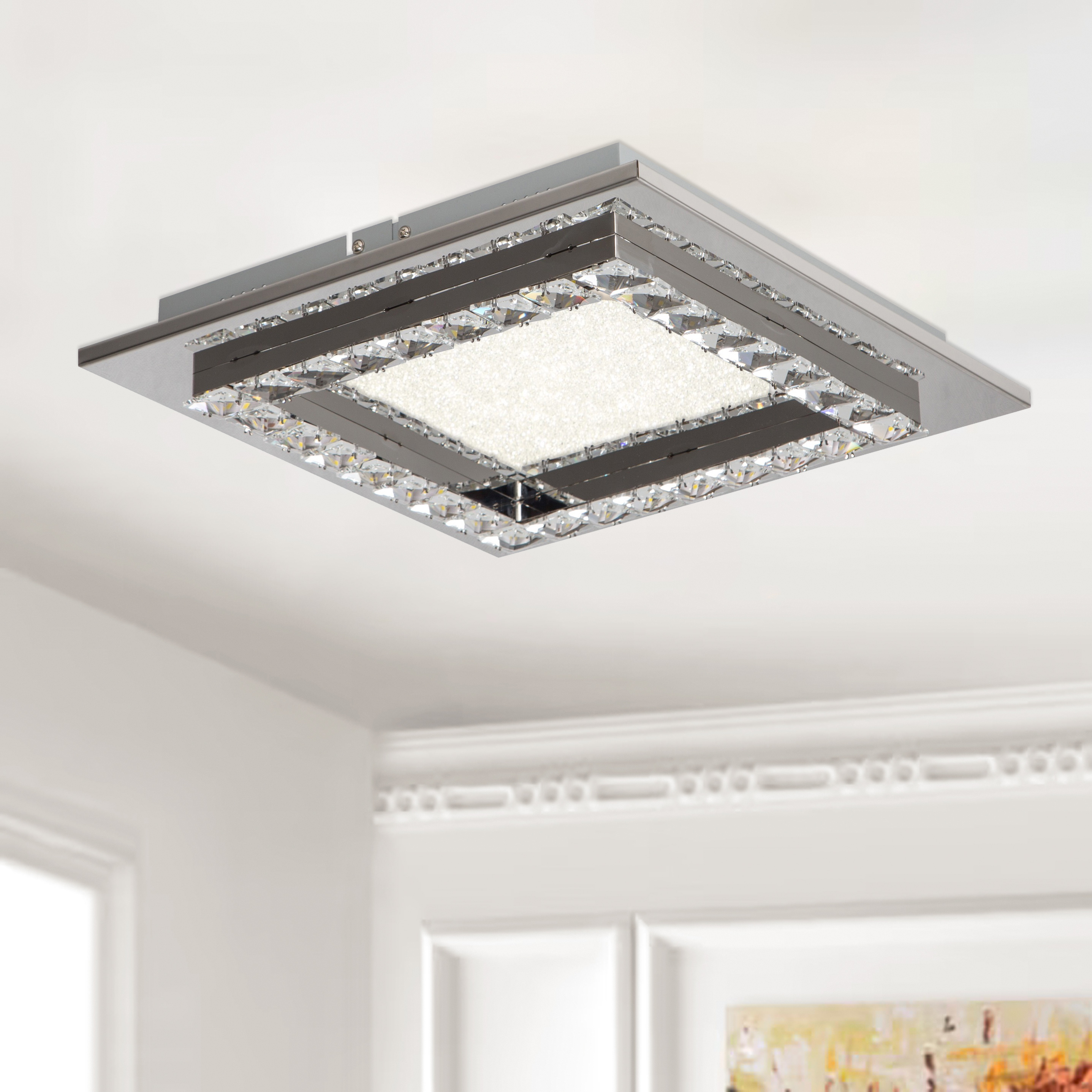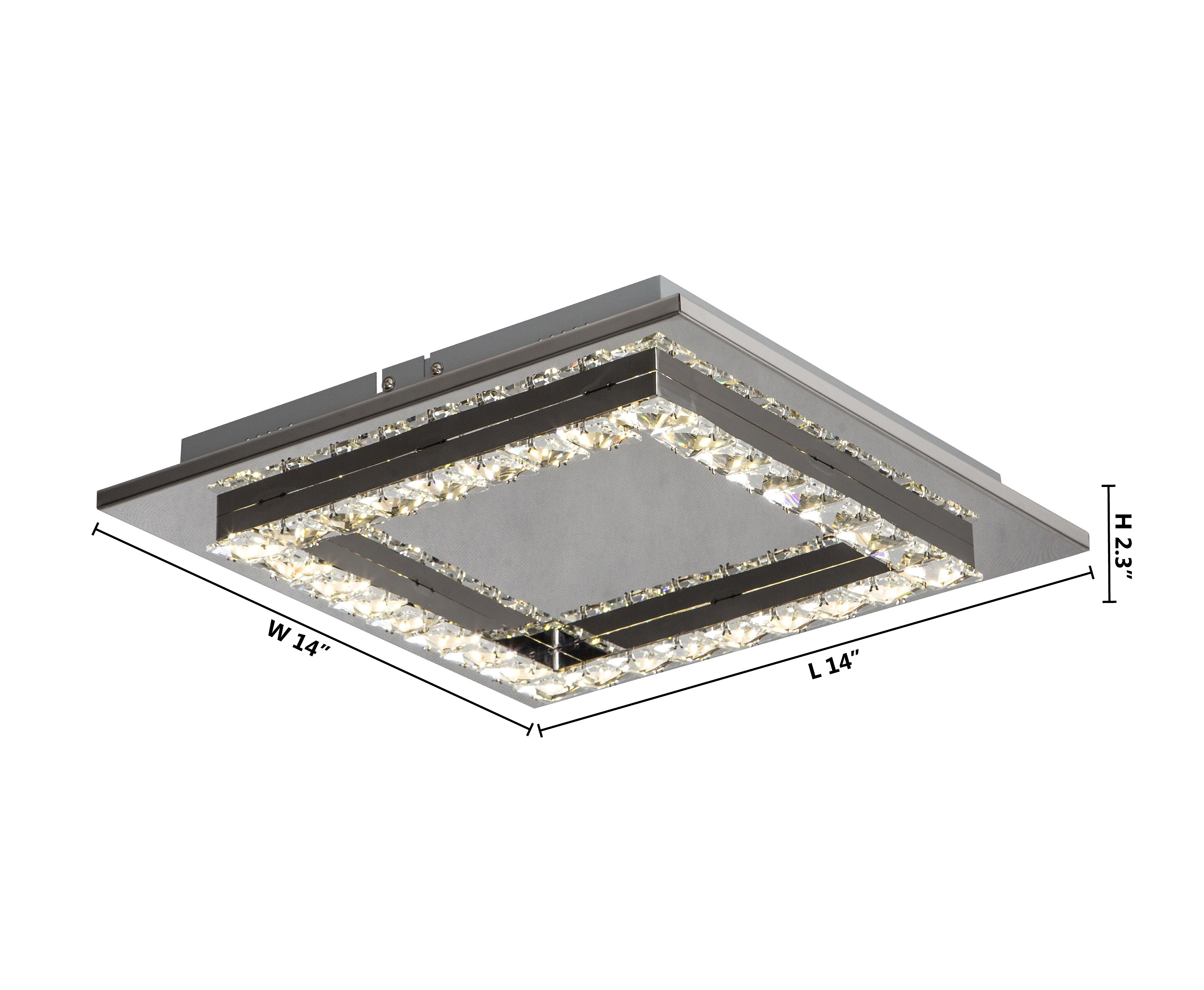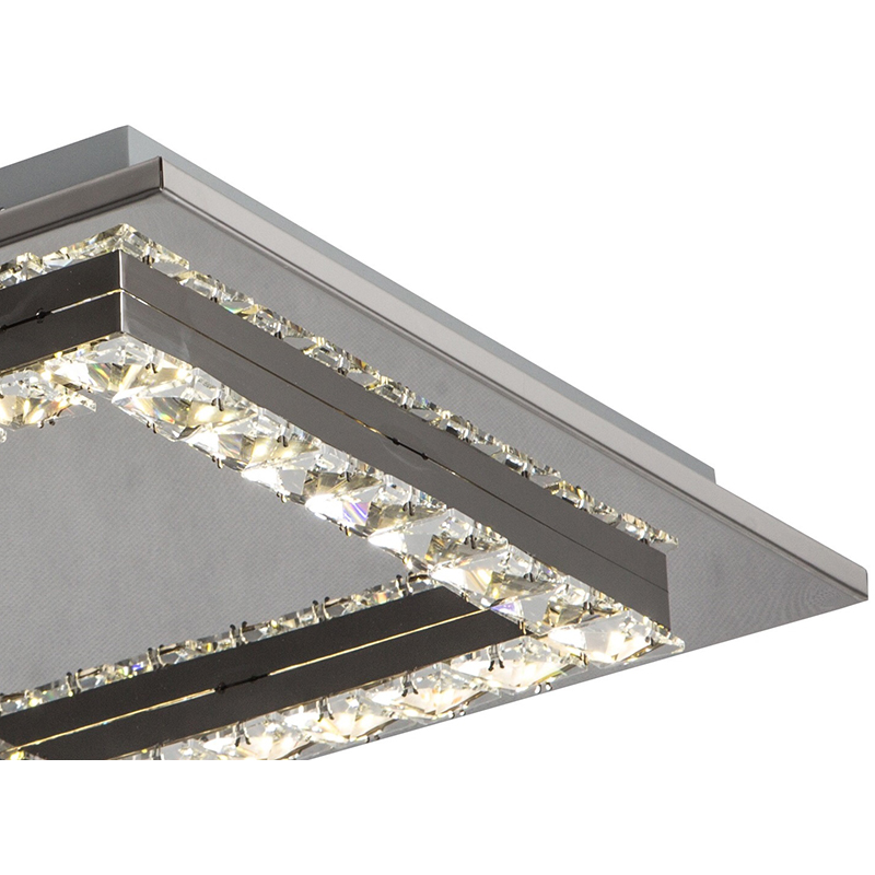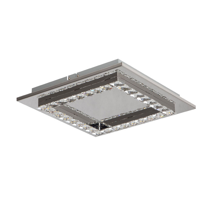 A SQUARE CLEAR CRYSTAL LED FLUSH MOUNT WITH A STAINLESS STEEL FRAME