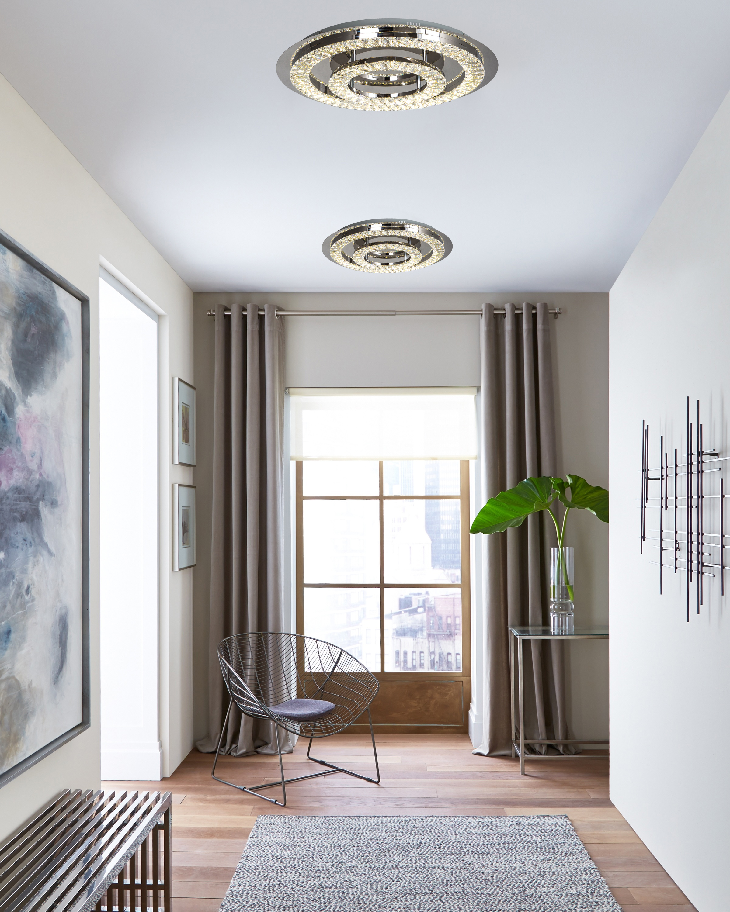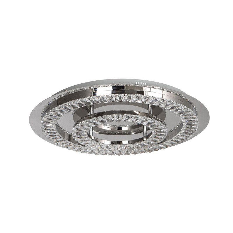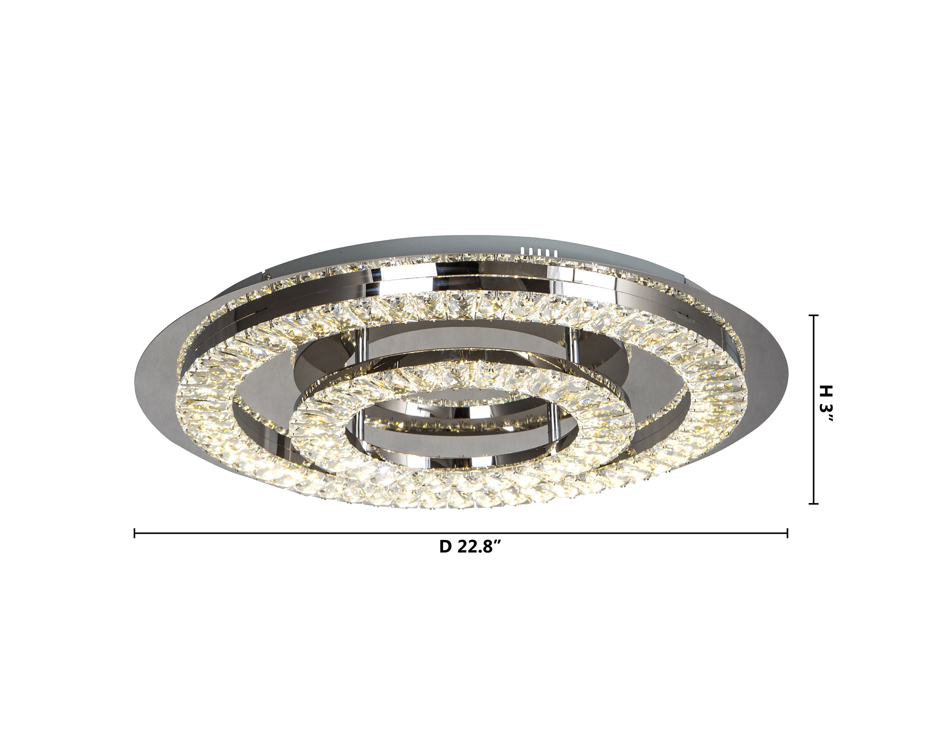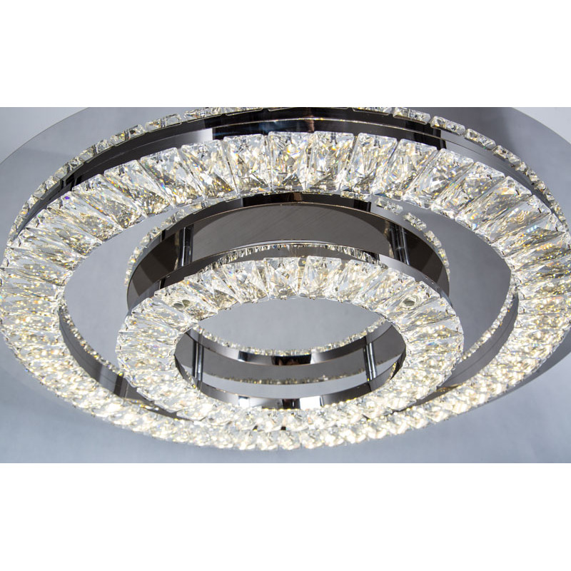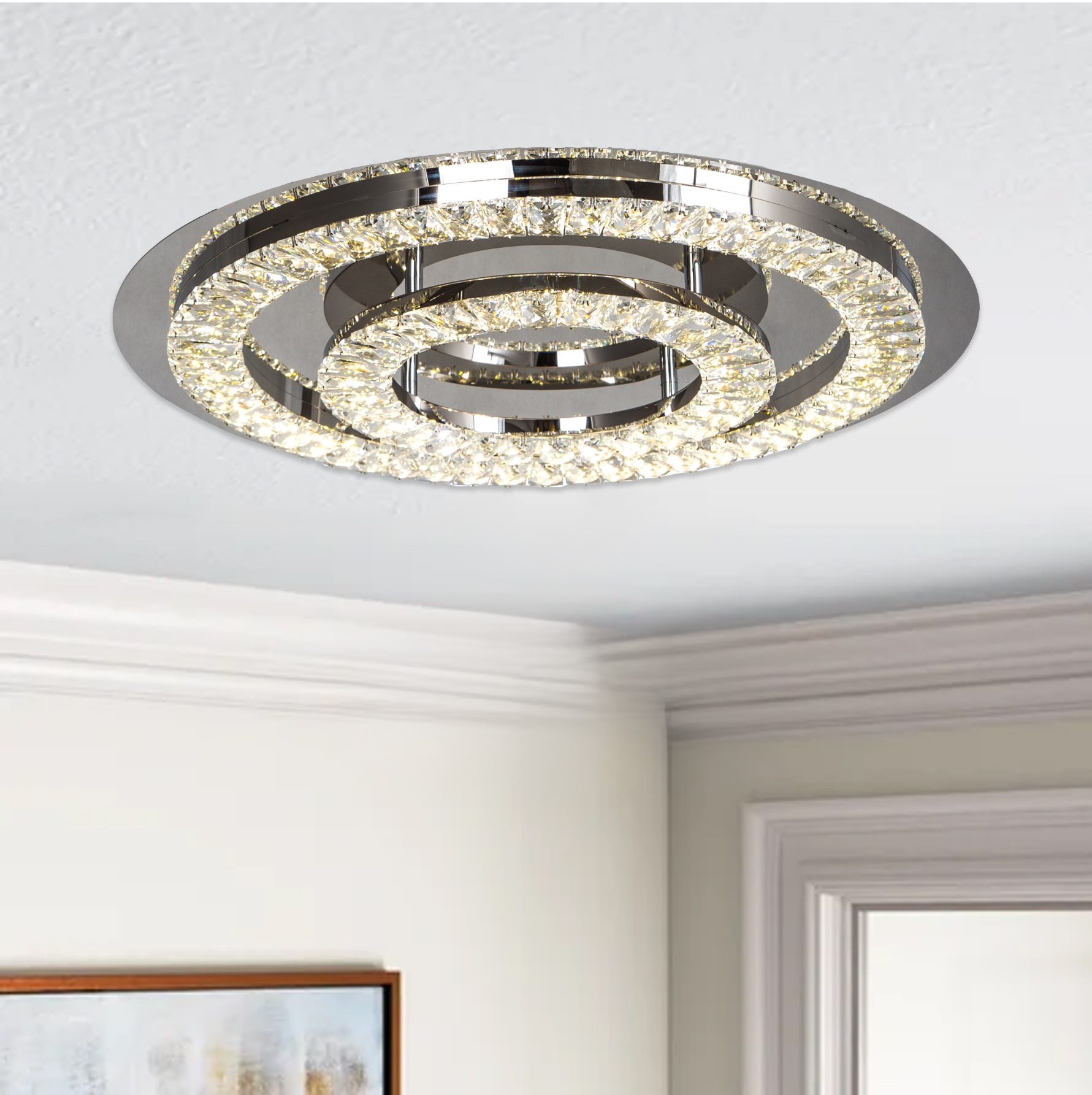 A DOUBLE CLEAR CRYSTAL RING LED FLUSH MOUNT WITH A STAINLESS STEEL FRAME