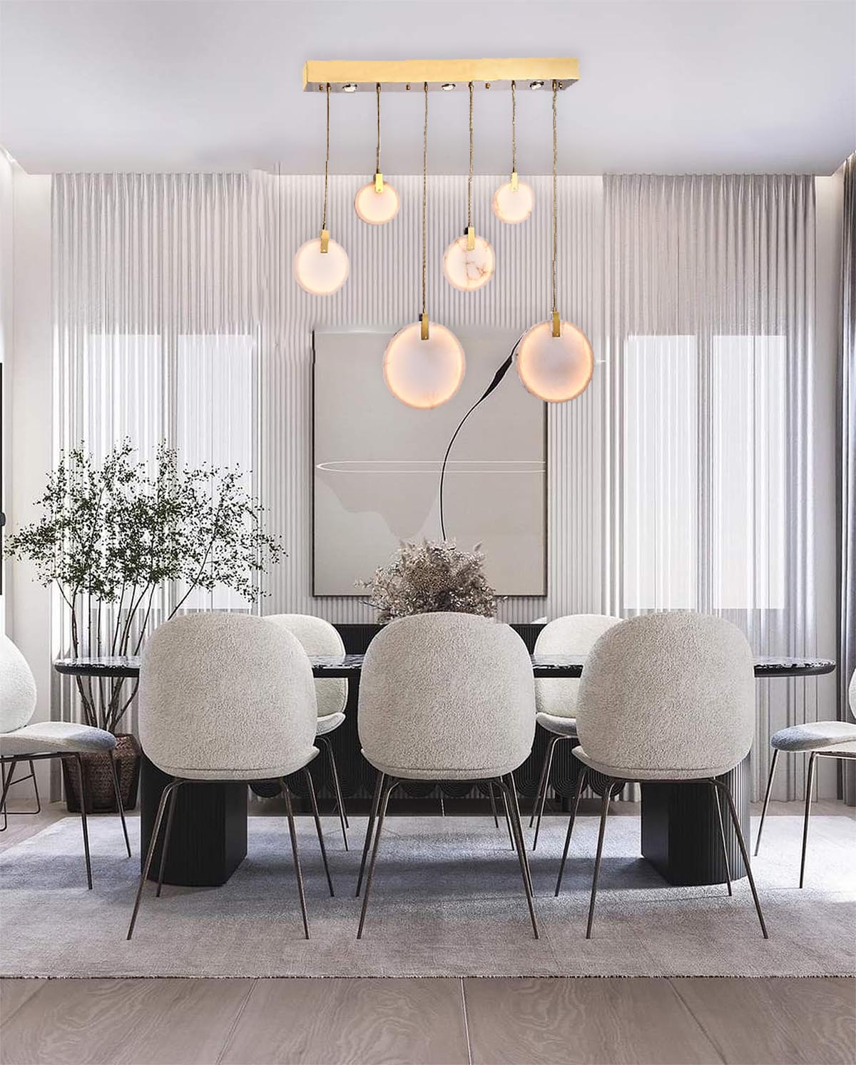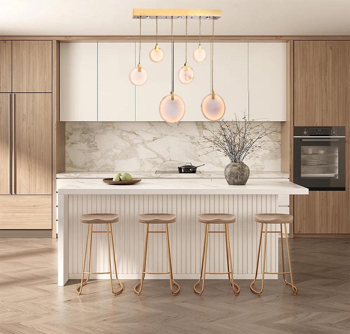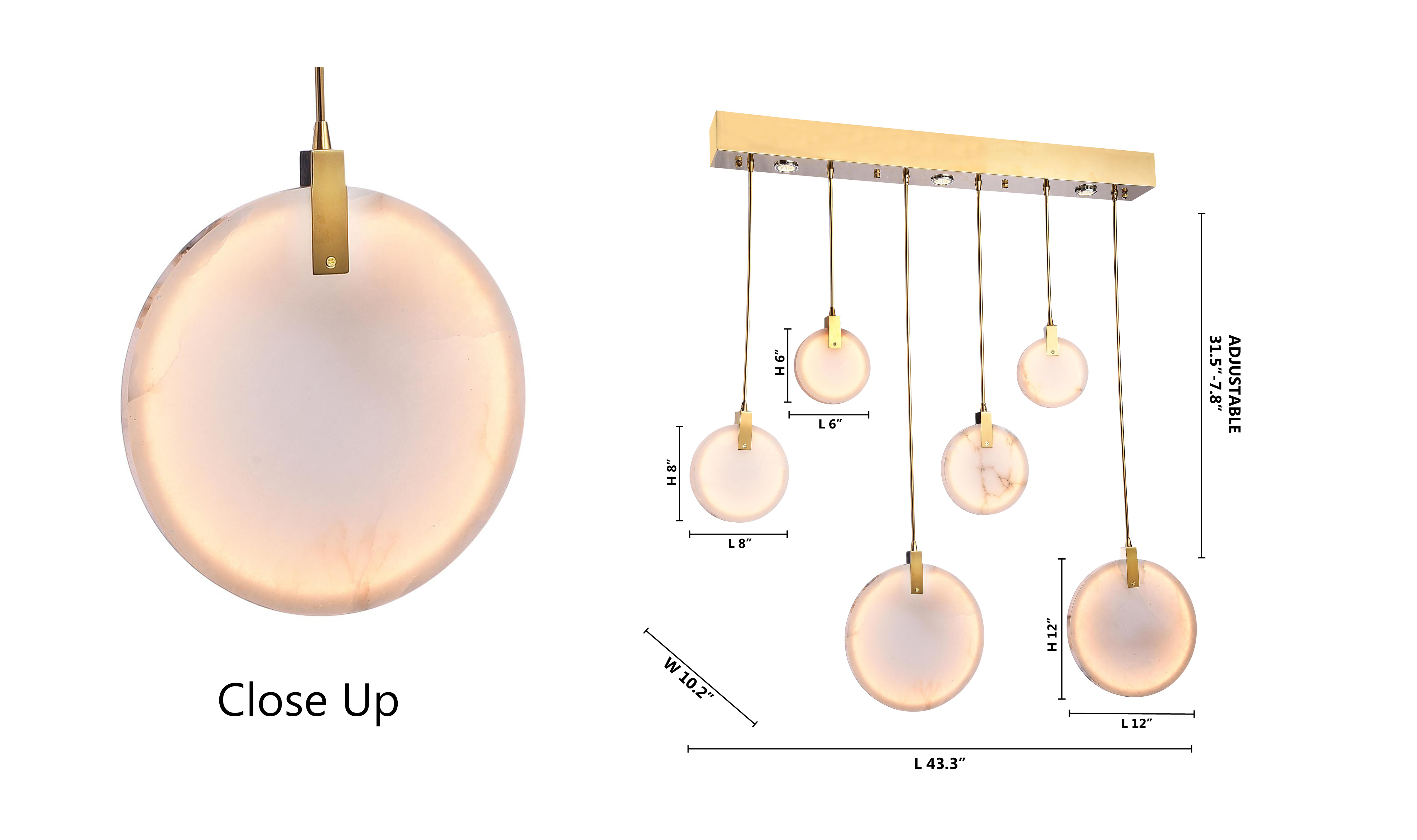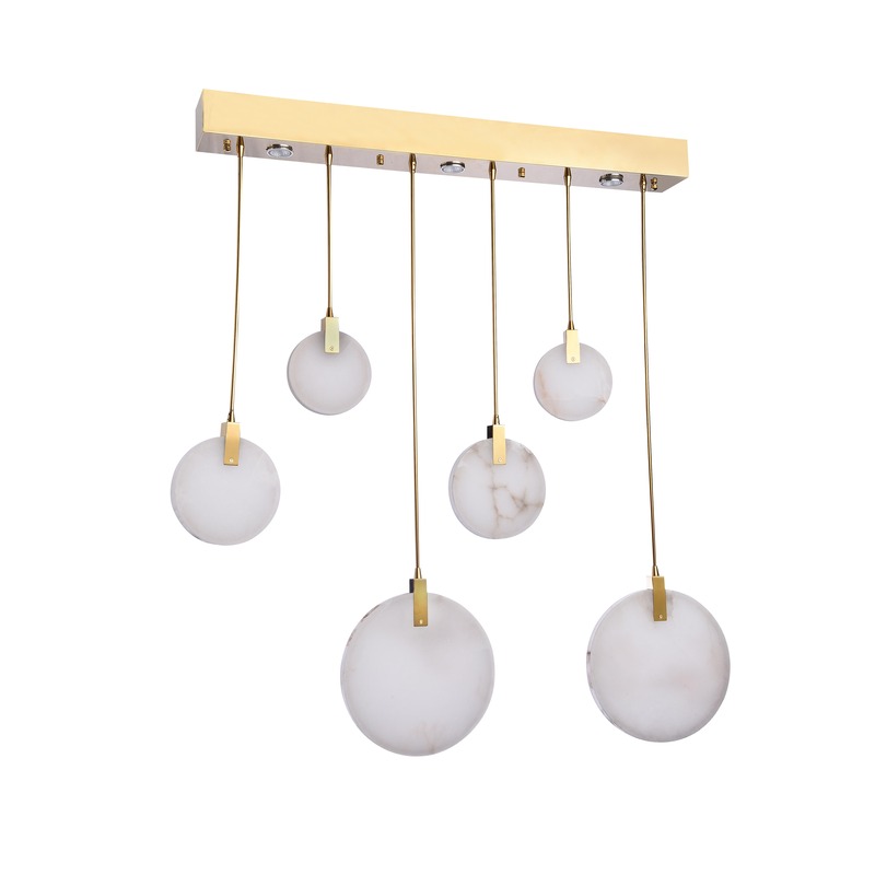 A GOLD STAINLESS STEEL RECTANGULAR FRAME LED CHANDELIER WITH SPANISH ALABASTER PENDANTS