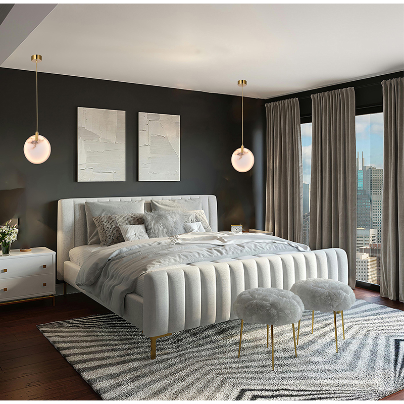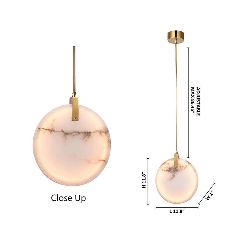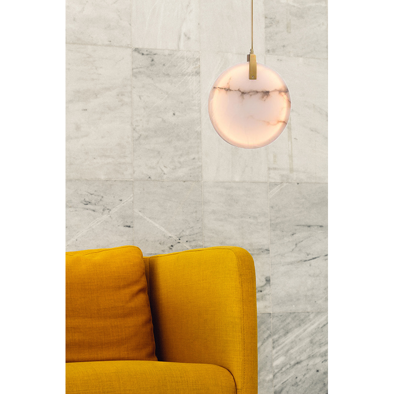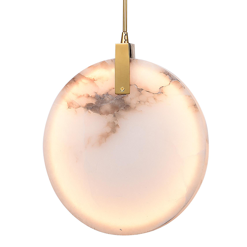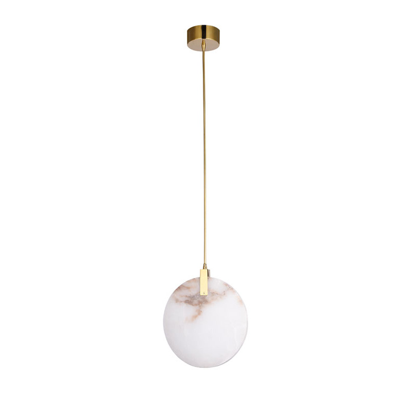 A GOLD STAINLESS STEEL LED SINGLE PENDANT LIGHT WITH A ROUND SPANISH ALABASTER