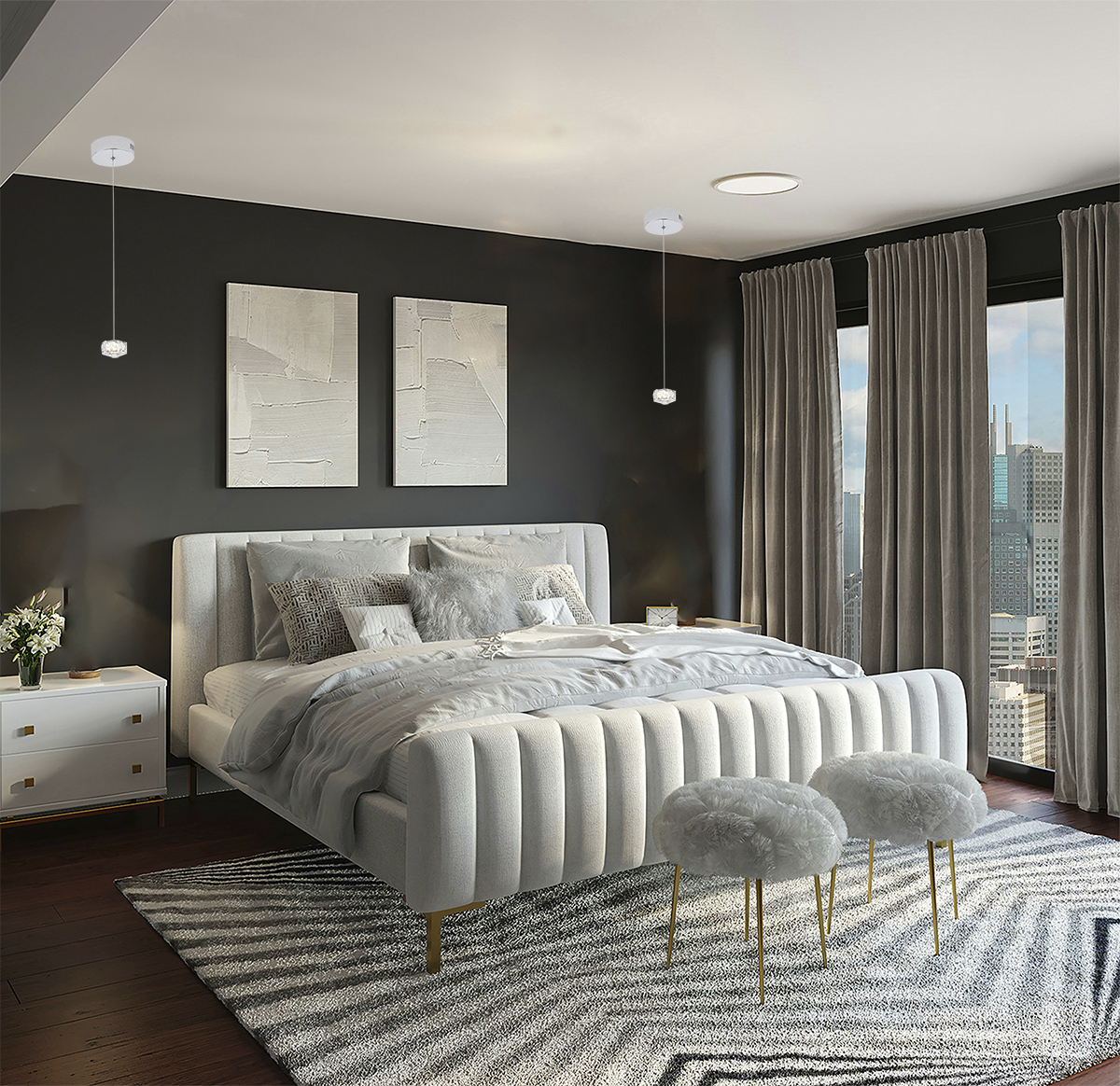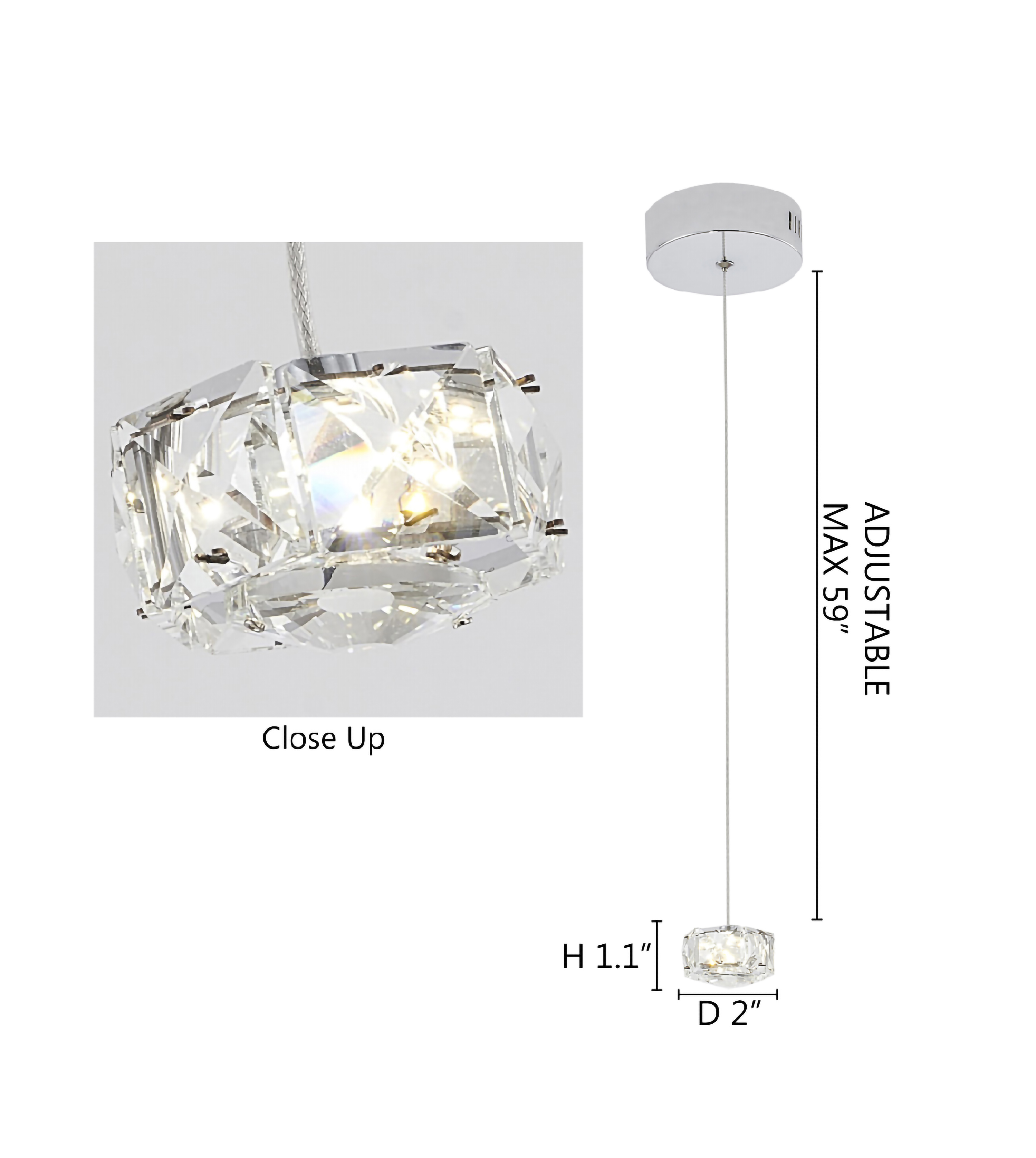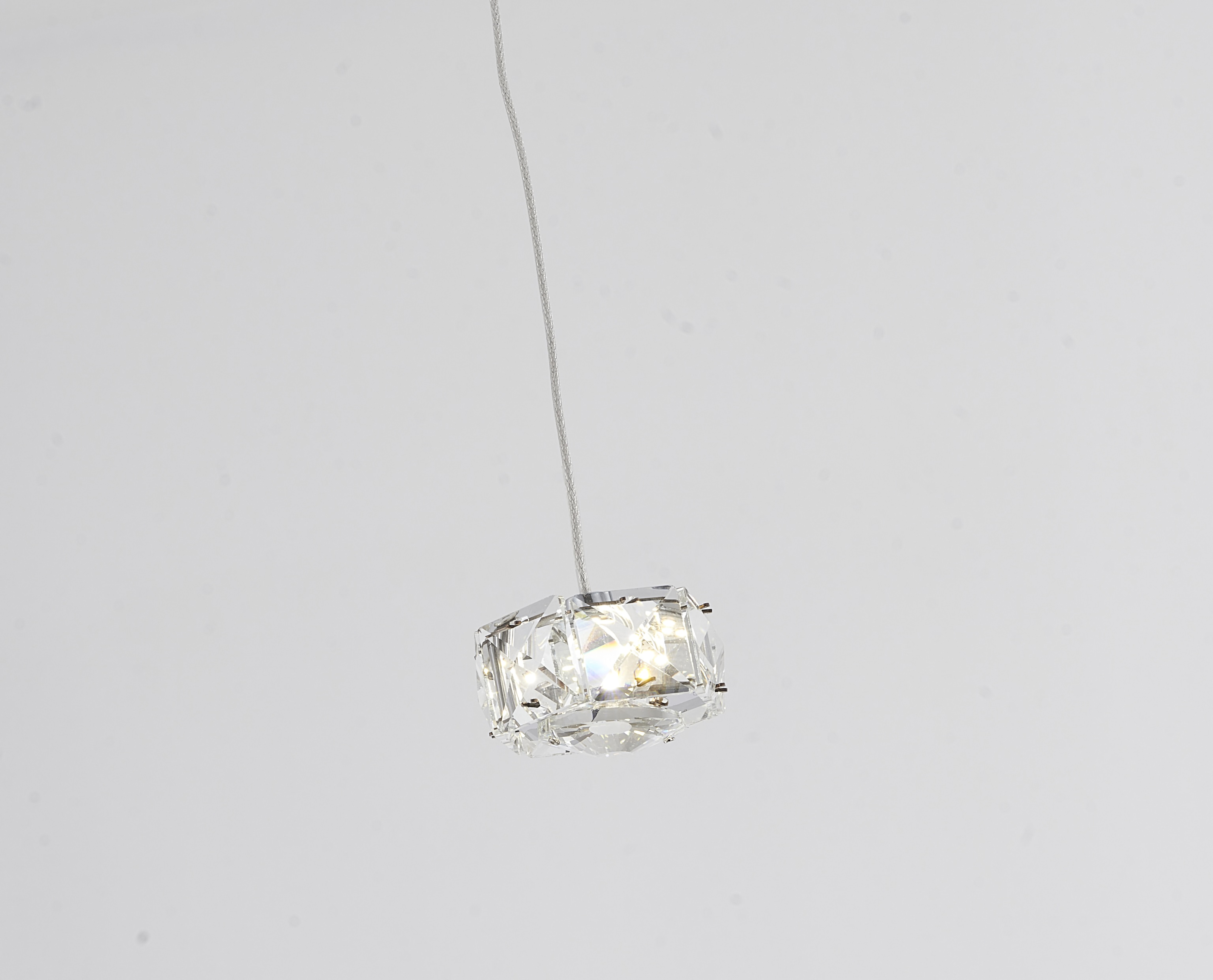 A CLEAR CRYSTAL CUBED SINGLE PENDANT LIGHT WITH A STAINLESS STEEL FRAME